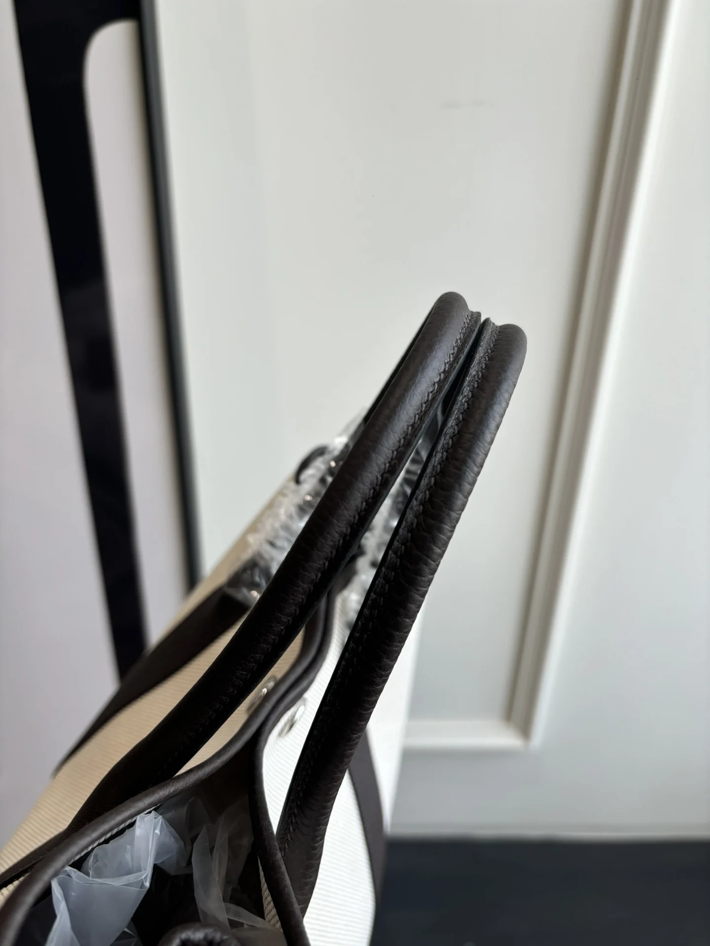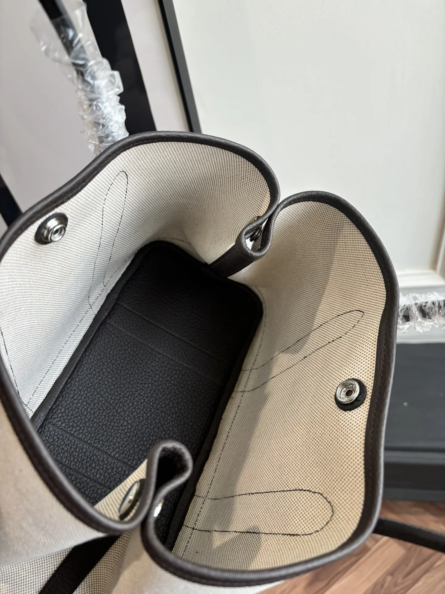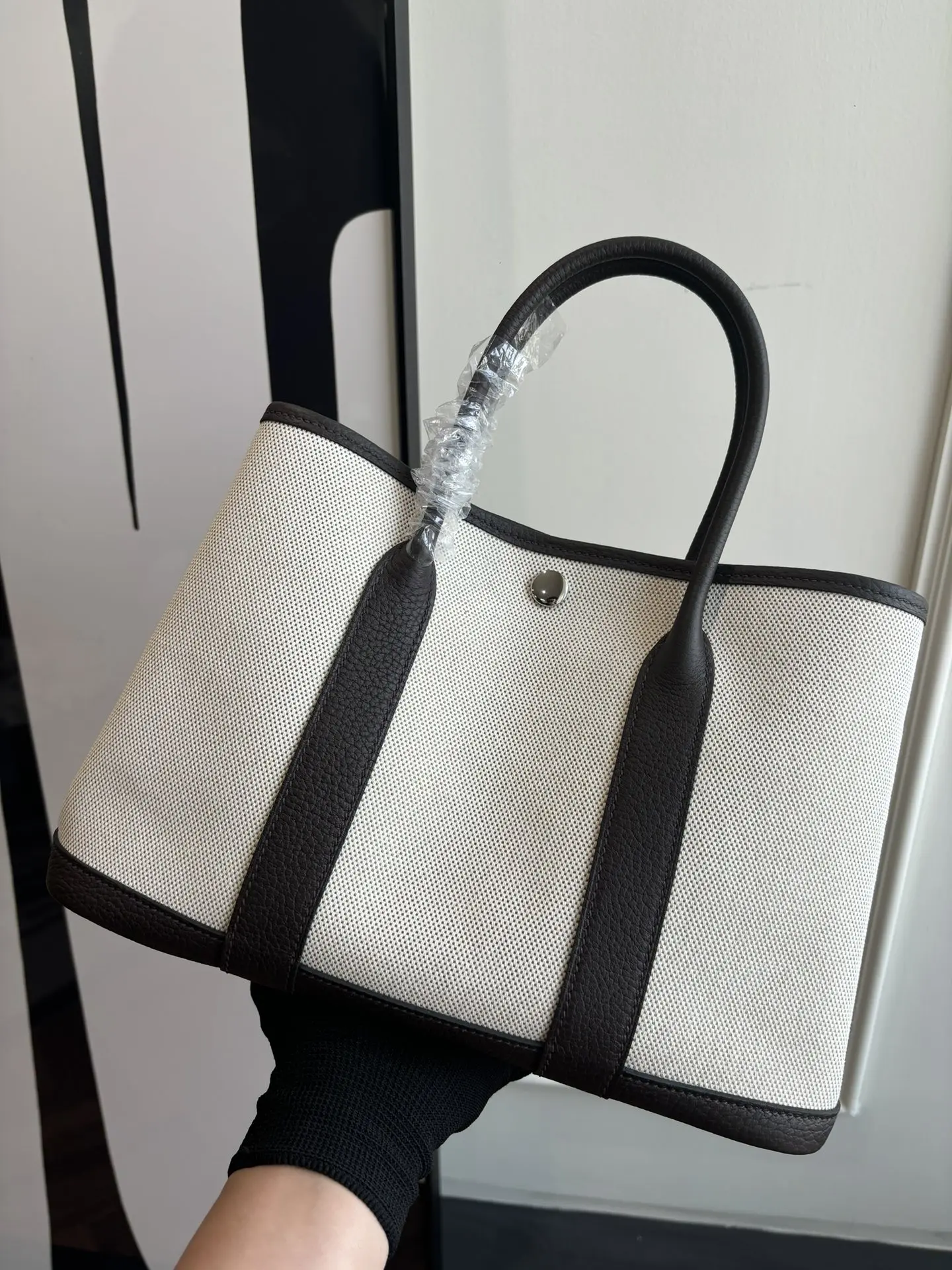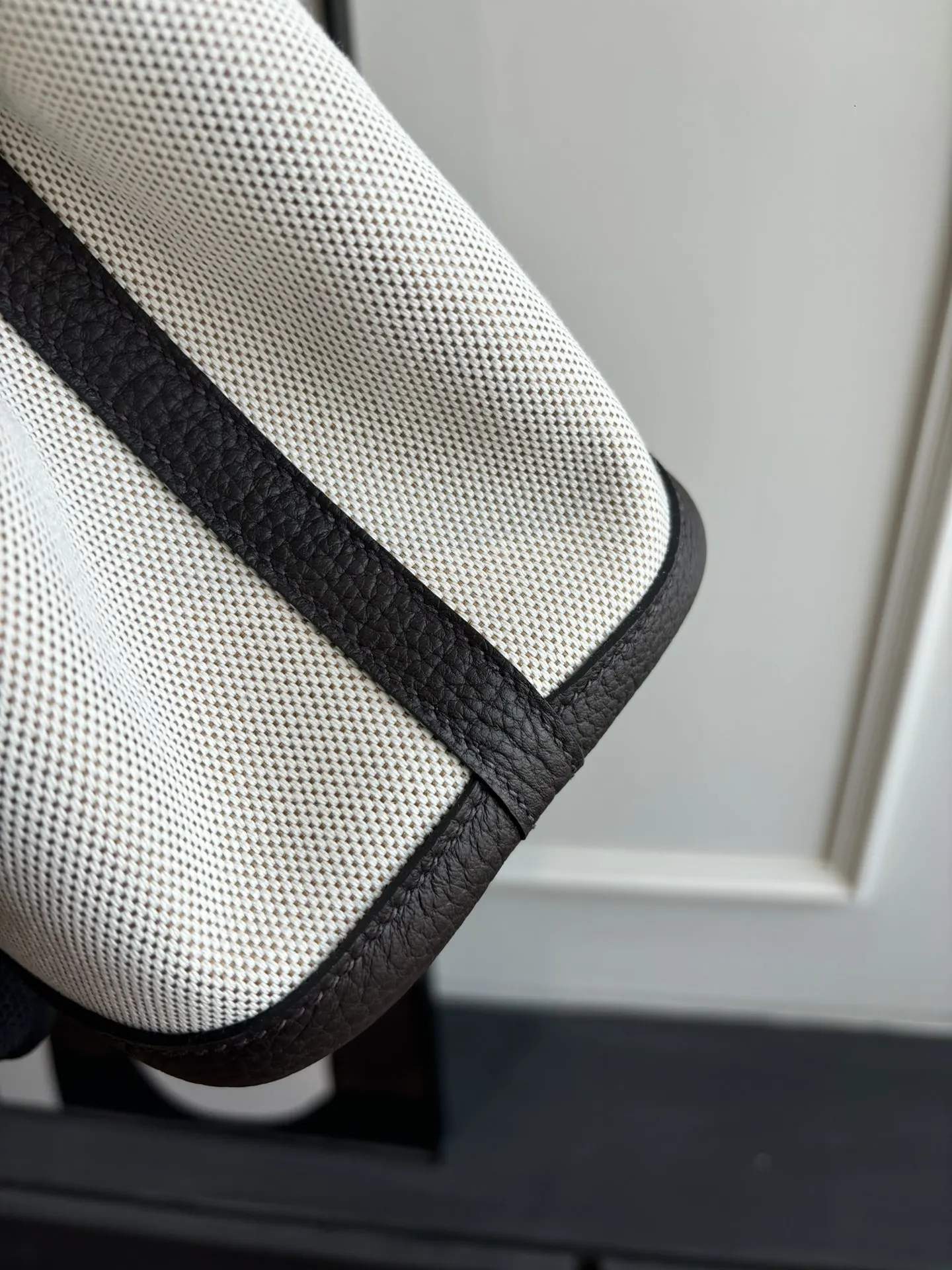 Garden Party bag, canvas combined with Notogo leather, lightweight design suitable for commuting or as a diaper bag, prioritizing aesthetics and practicality. Waxed thread, semi-handmade. Color: Ebony. Sizes: 23cm and 30cm.