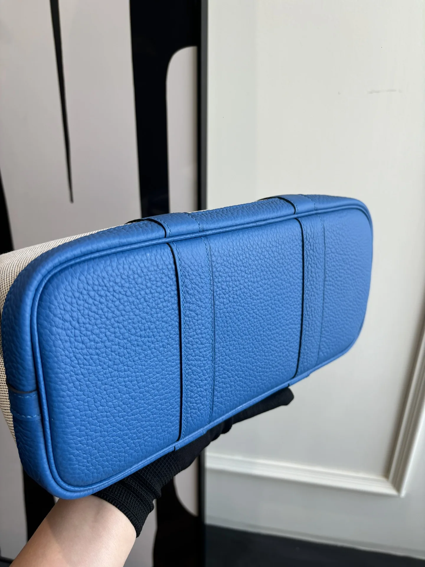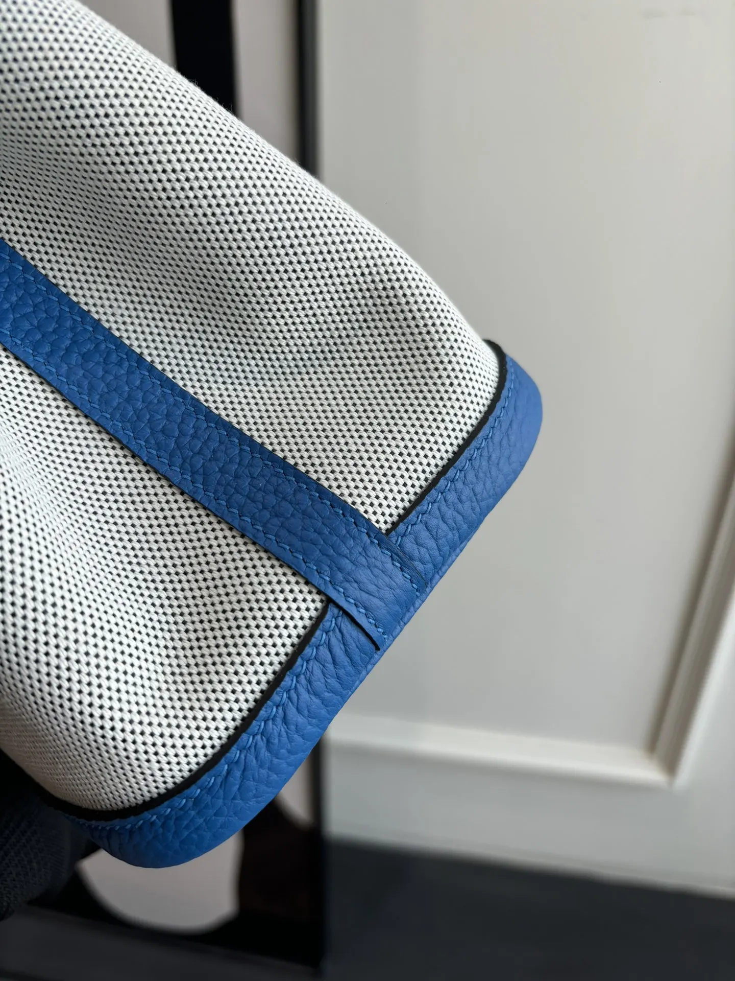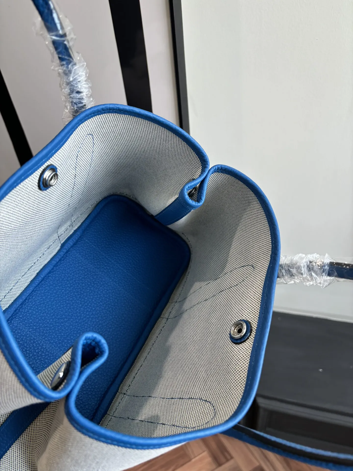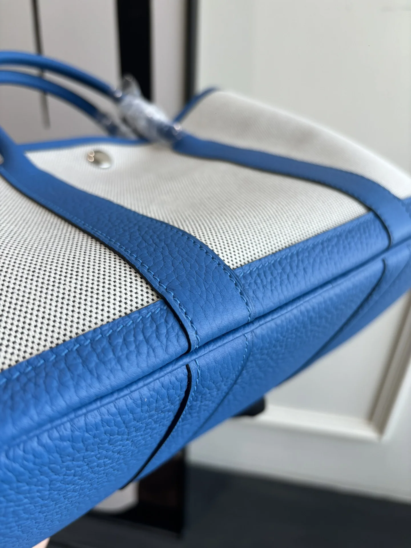 Garden party canvas bag with Notogo leather trim, lightweight and practical, suitable for commuting or as a diaper bag. Combines aesthetics and functionality. Waxed thread, semi-handmade. Color: Tanzanian Blue. Sizes: 23cm and 30cm.