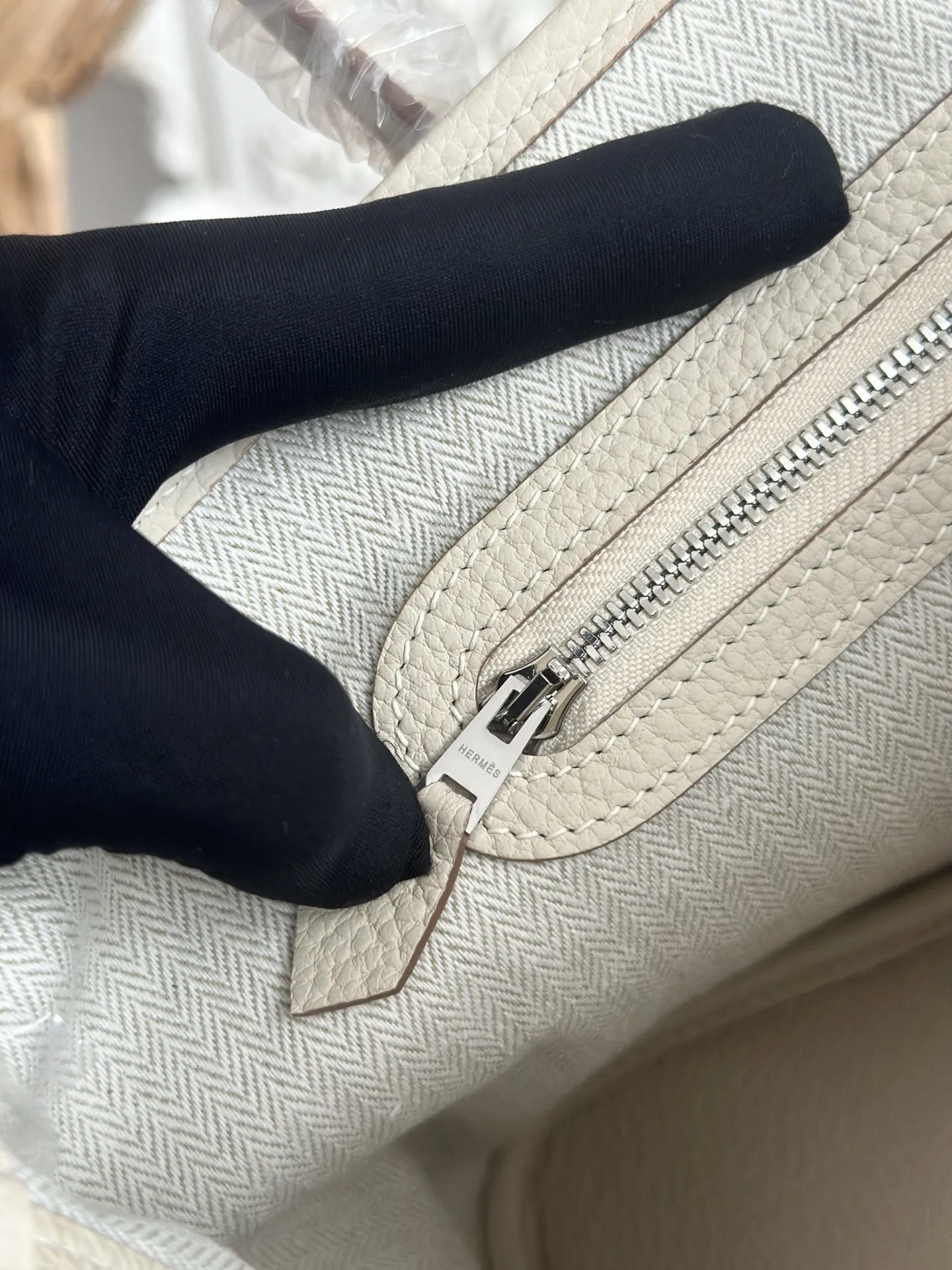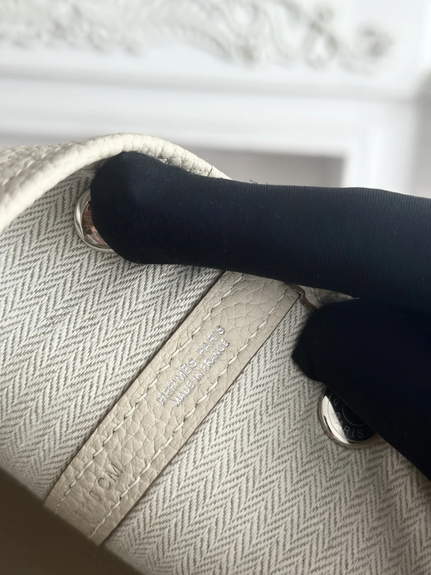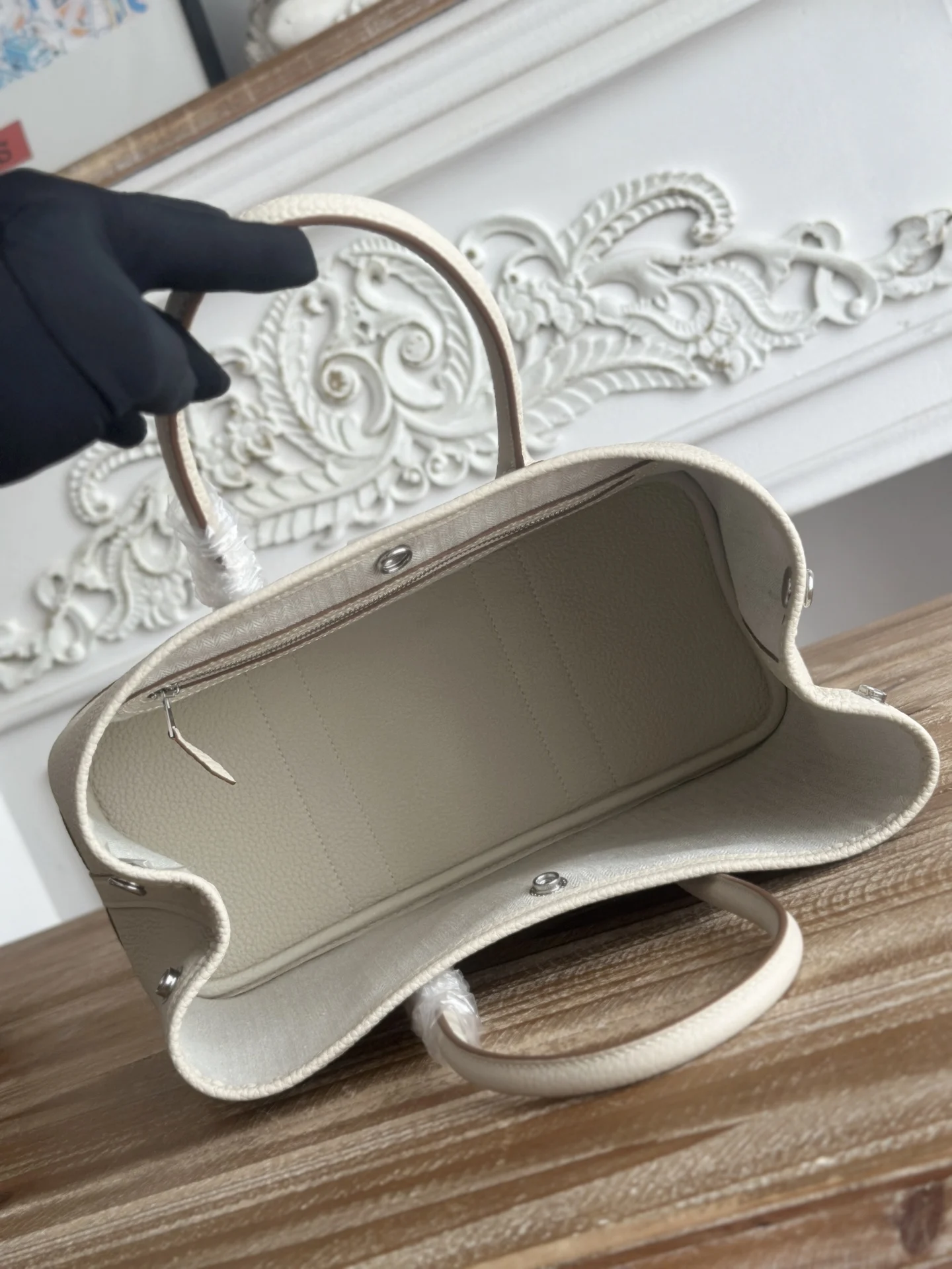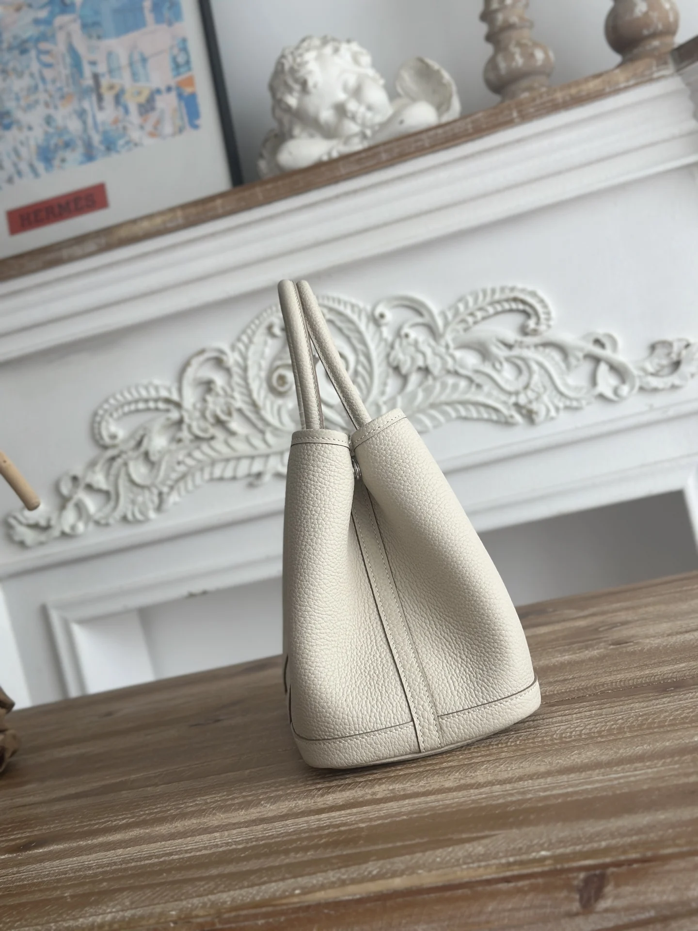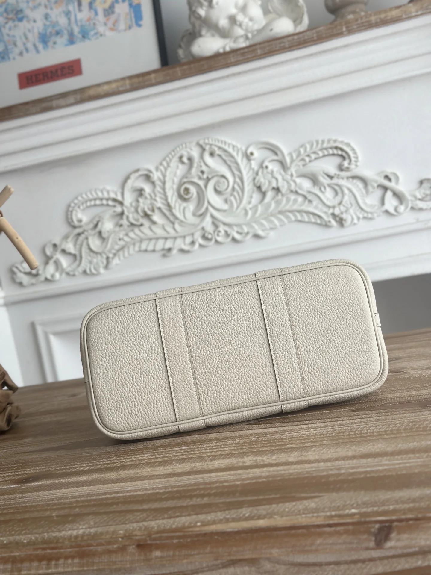 Semi-handcrafted Ntogo leather Garden Party bag, lightweight and suitable for commuting or as a diaper bag. Combines aesthetics and practicality. Waxed thread, semi-handcrafted. Color: Milkshake White. Size: 30cm.