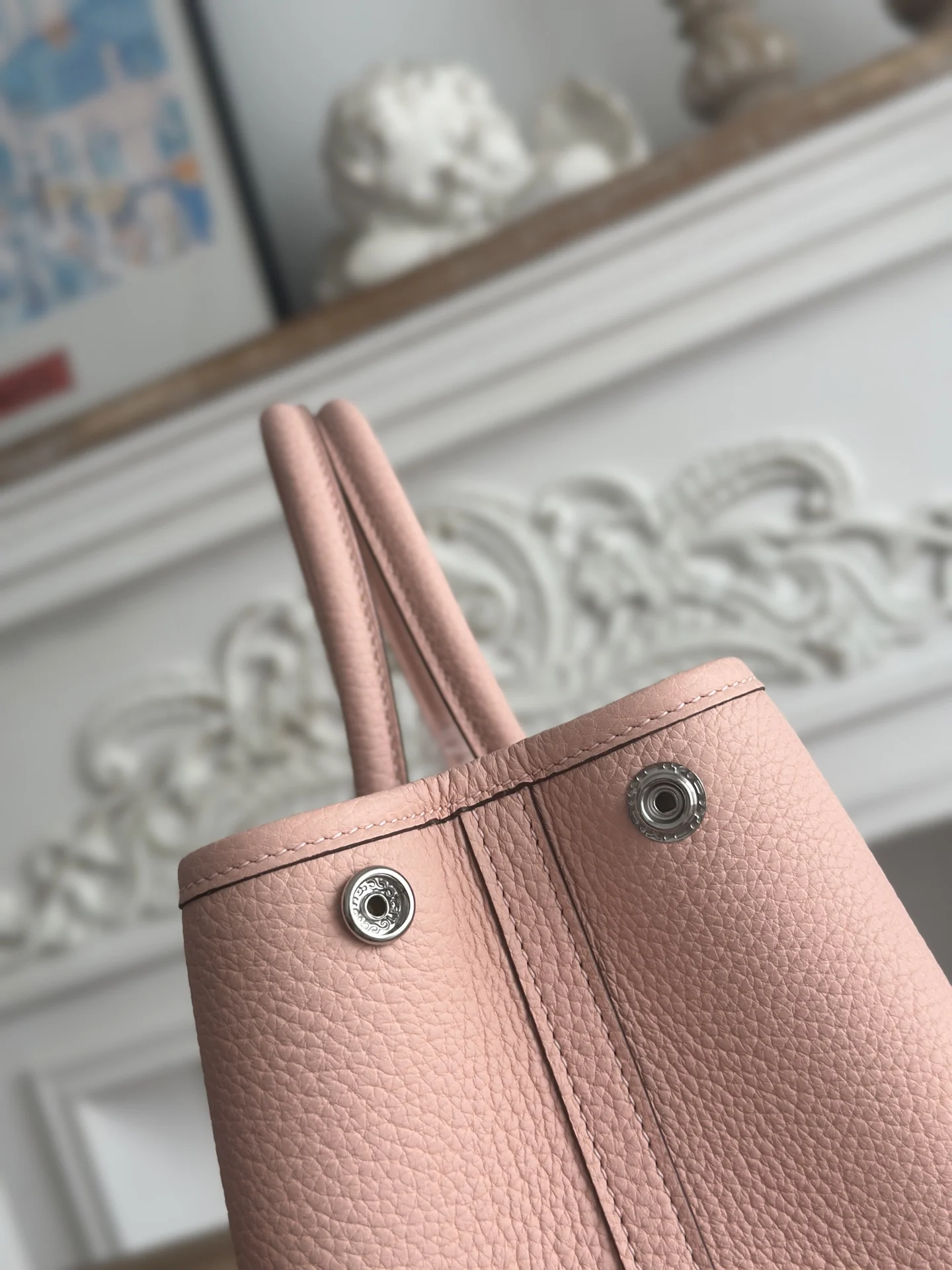 Semi-handmade Ntogo Leather Garden Party Bag, lightweight and suitable for commuting or as a diaper bag, combines aesthetics and practicality. Semi-handmade with waxed thread. Color: Q Pink. Size: 30cm.