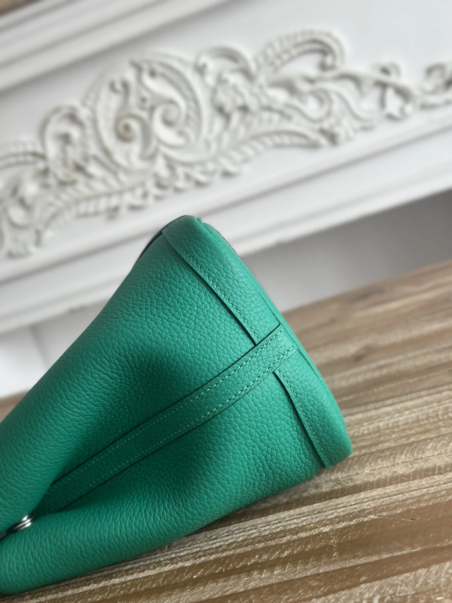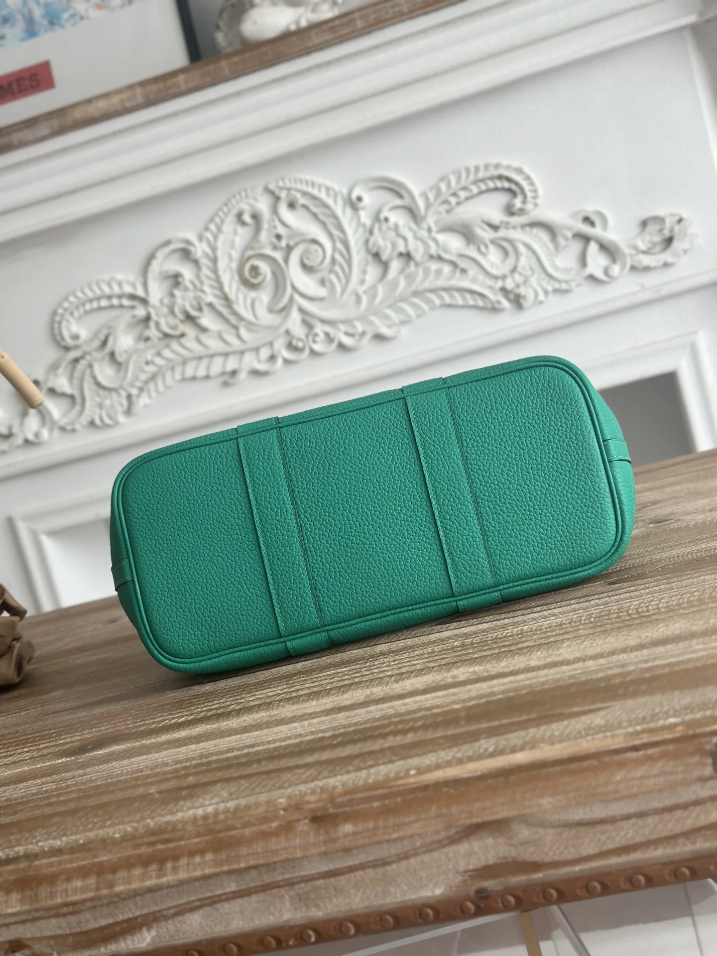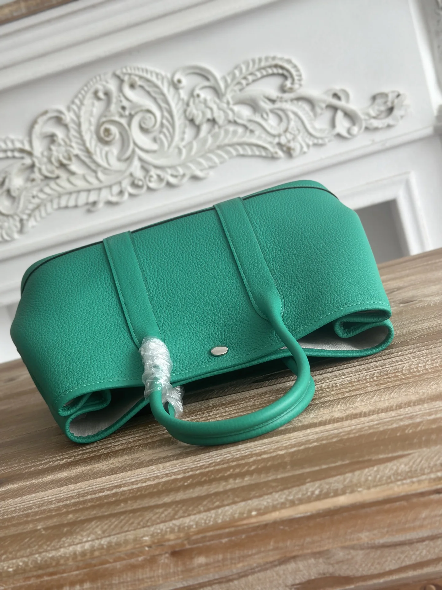 Semi-handmade Ntogo Leather Garden Party Bag, lightweight and suitable for commuting or as a diaper bag. Combines aesthetics and practicality. Semi-handmade with waxed thread. Color: Mint Green. Size: 30cm.