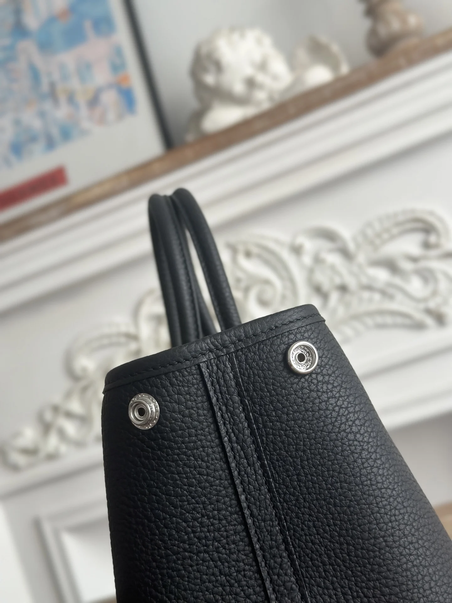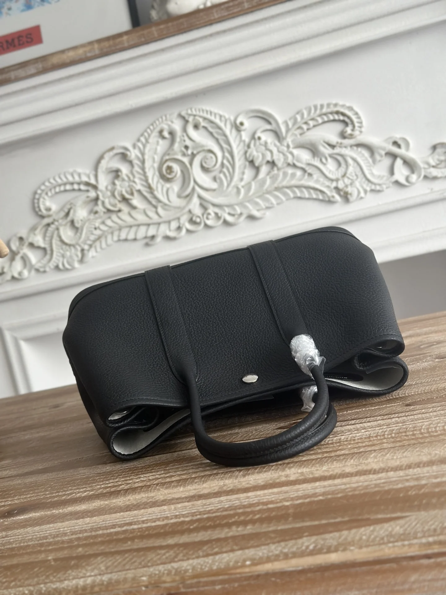 Semi-handmade Ntogo Leather Garden Party Bag, lightweight and suitable for commuting or as a diaper bag. Combines aesthetics and practicality. Semi-handmade with waxed thread. Color: Black. Size: 30cm.