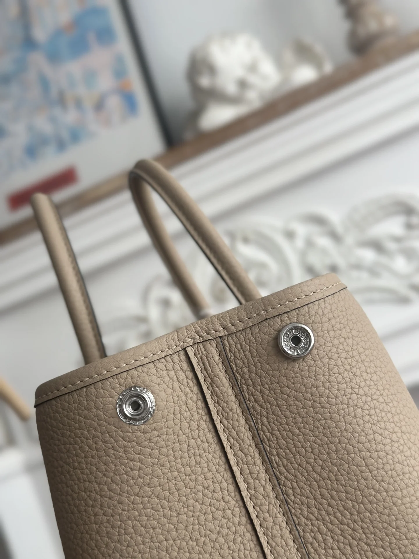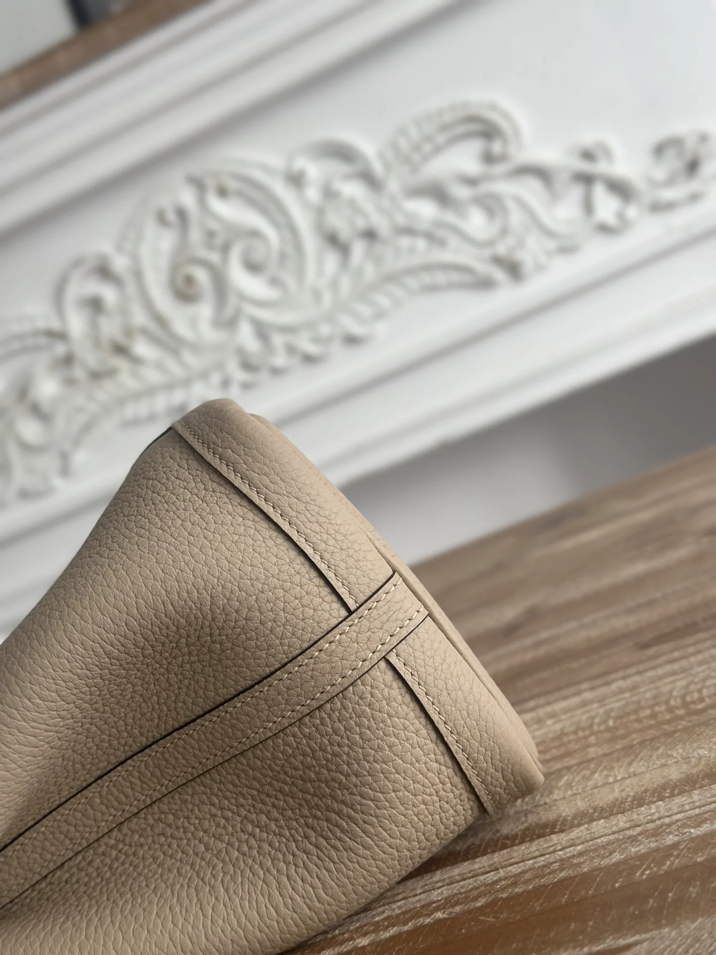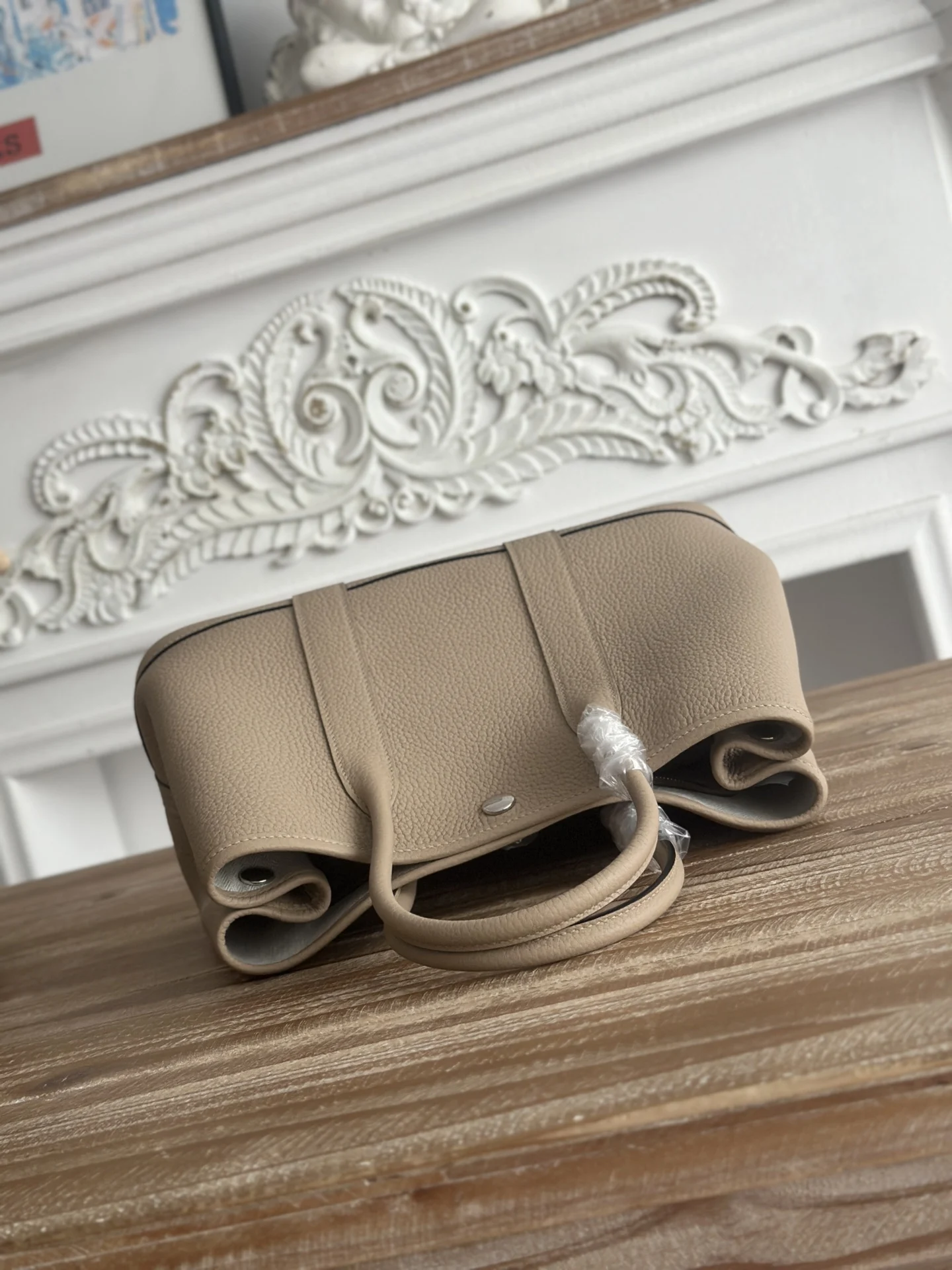 Semi-handmade Ntogo Leather Garden Party Bag, lightweight and suitable for commuting or as a diaper bag, combines aesthetics and practicality. Semi-handmade with waxed thread. Color: Trench Grey. Size: 30cm.