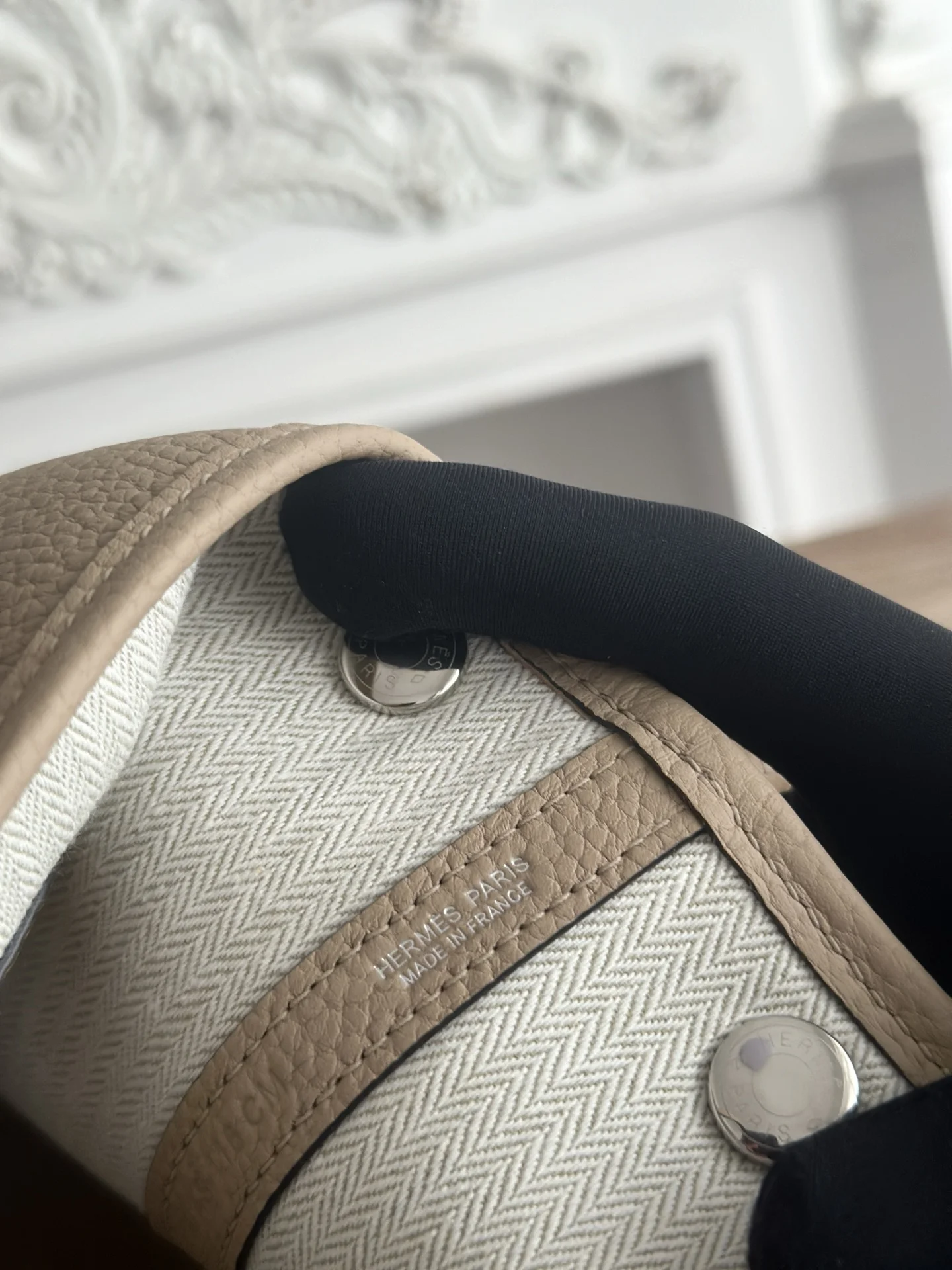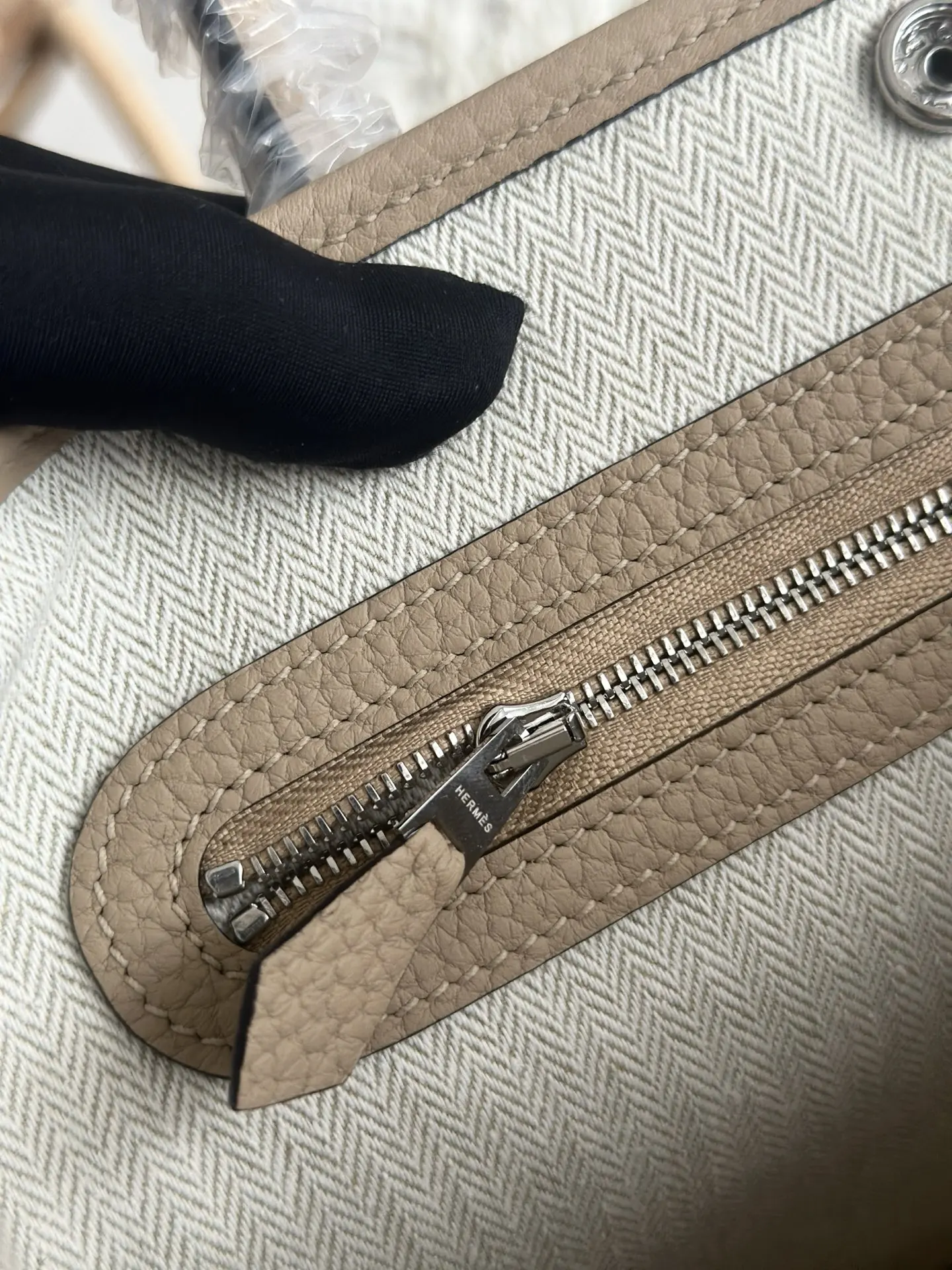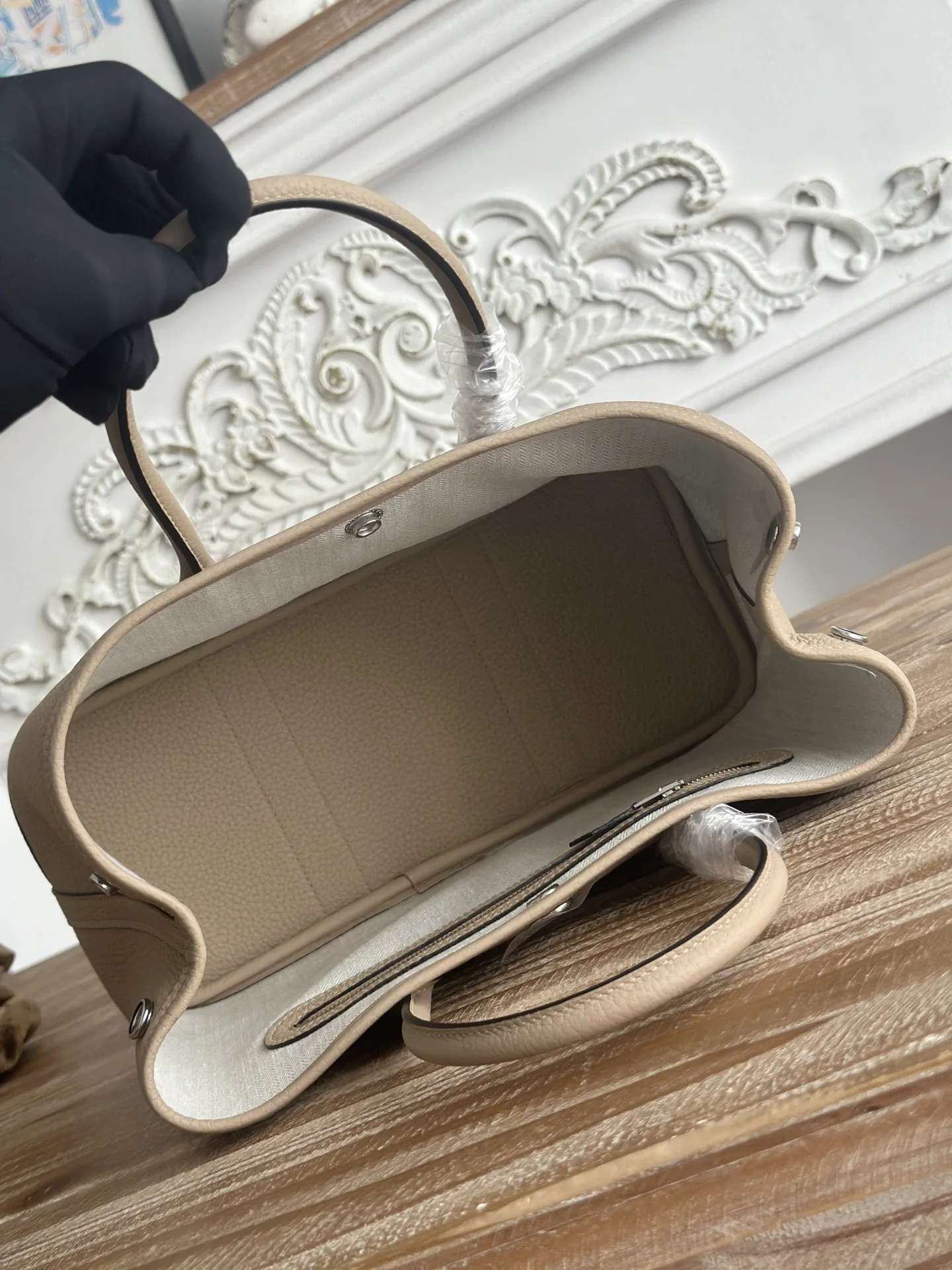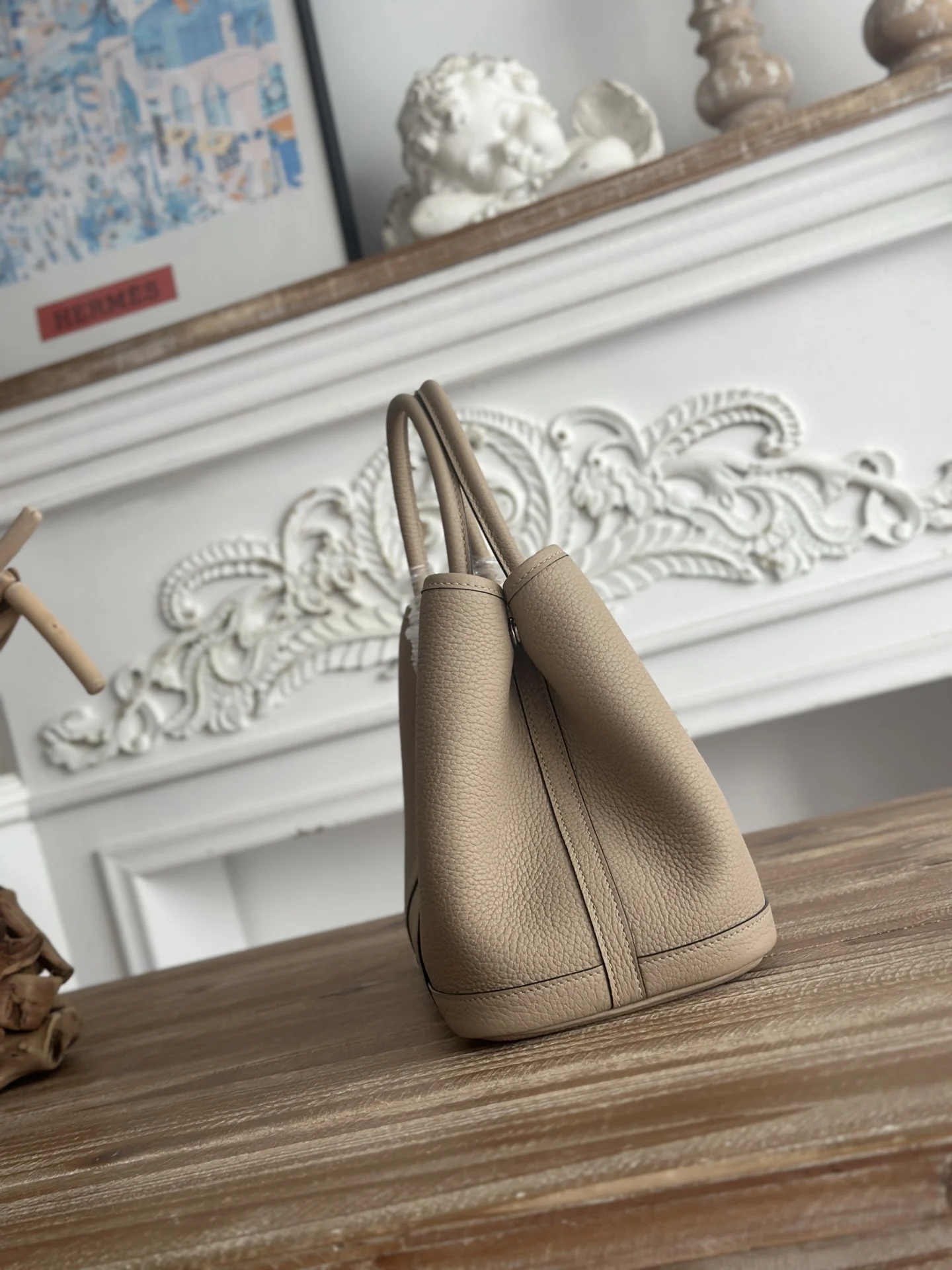 Semi-handmade Ntogo Leather Garden Party Bag, lightweight and suitable for commuting or as a diaper bag, combines aesthetics and practicality. Semi-handmade with waxed thread. Color: Trench Grey. Size: 30cm.