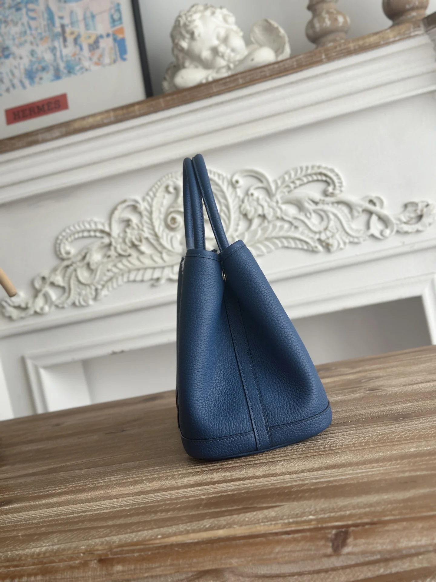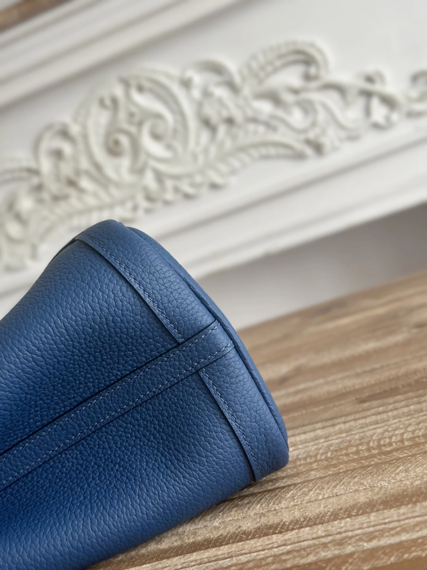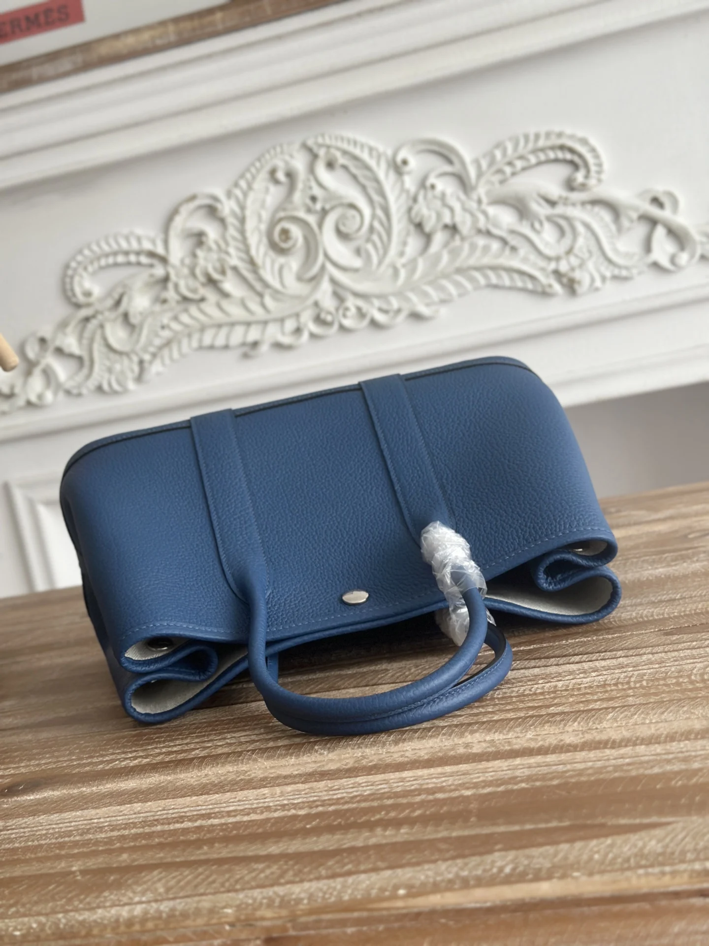 Semi-handmade Ntogo leather Garden Party bag, lightweight and suitable for commuting or as a diaper bag. Combines aesthetics and practicality. Semi-handmade with waxed thread. Color: French Blue. Size: 30cm.