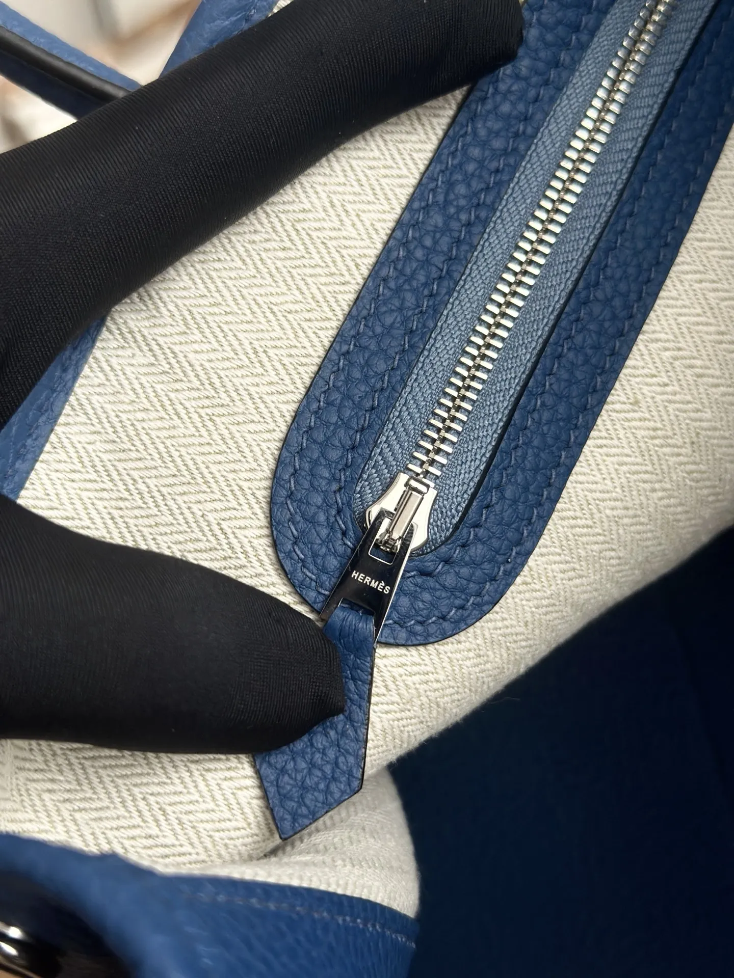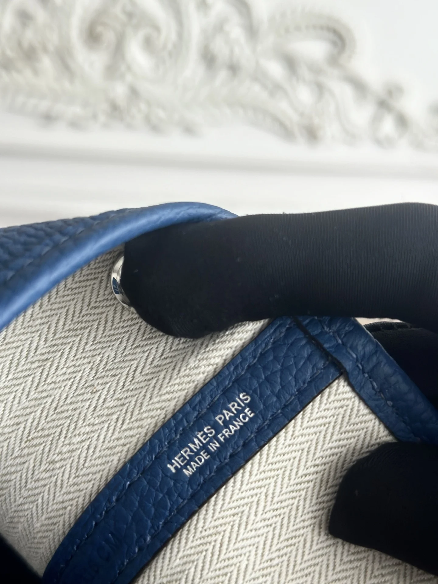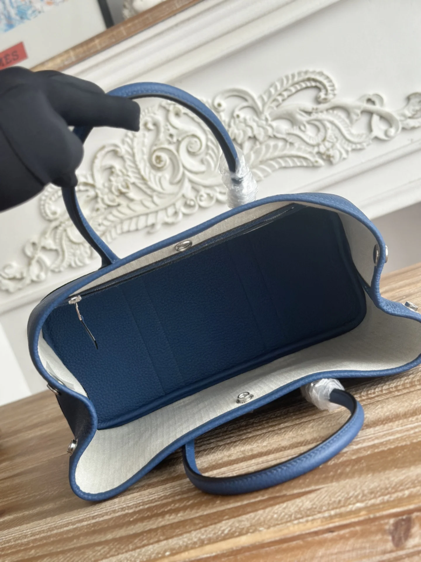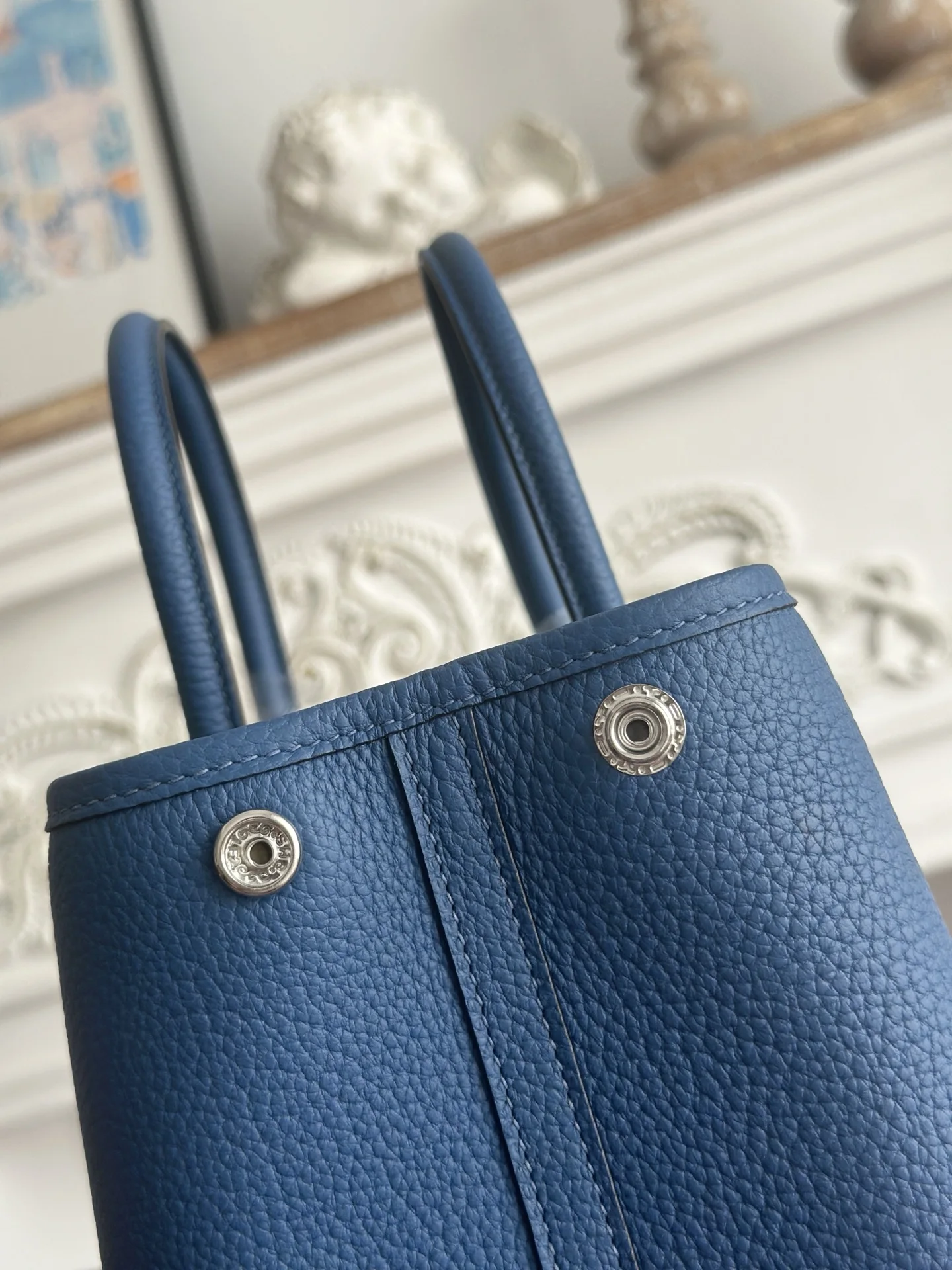 Semi-handmade Ntogo leather Garden Party bag, lightweight and suitable for commuting or as a diaper bag. Combines aesthetics and practicality. Semi-handmade with waxed thread. Color: French Blue. Size: 30cm.