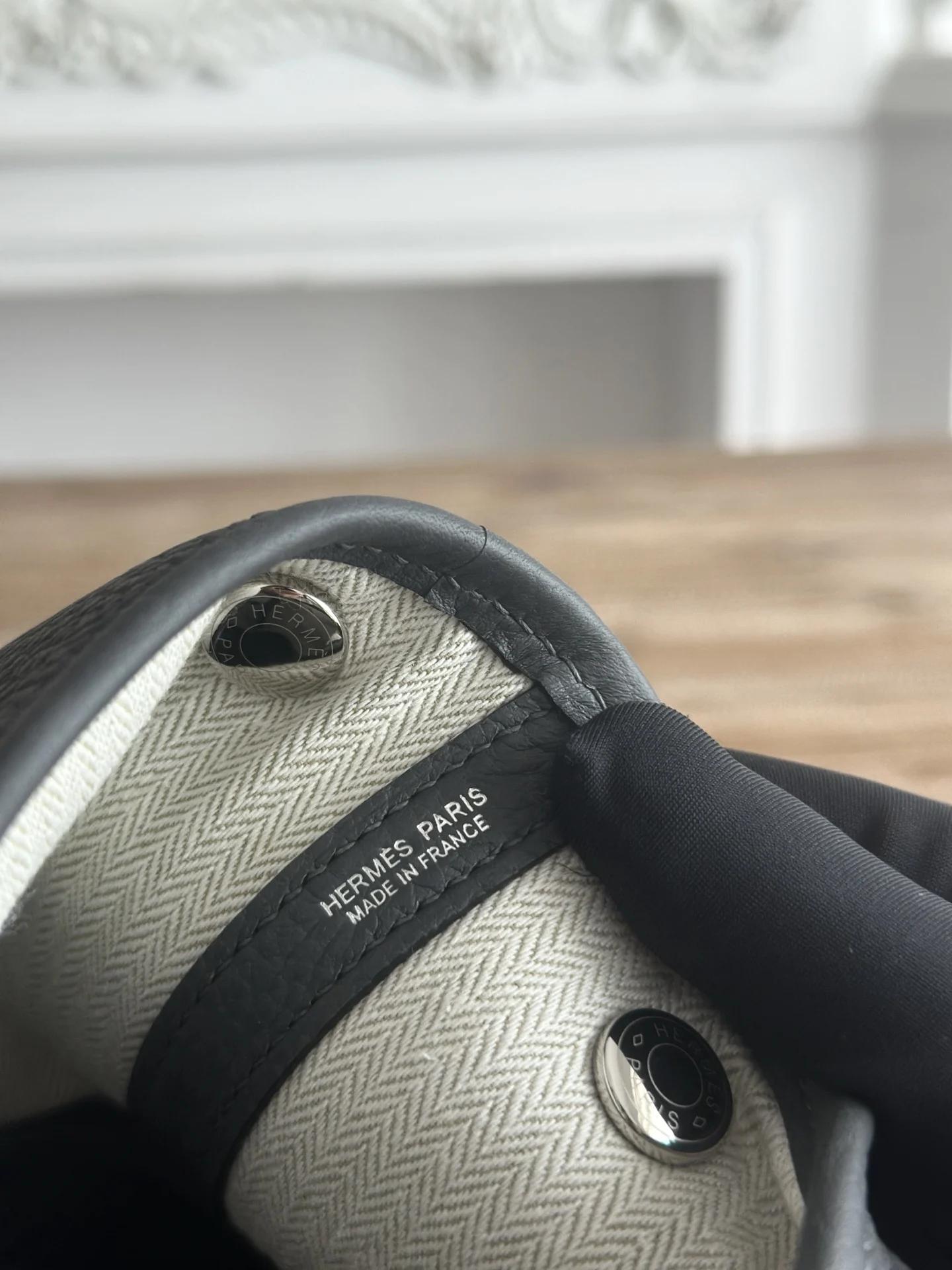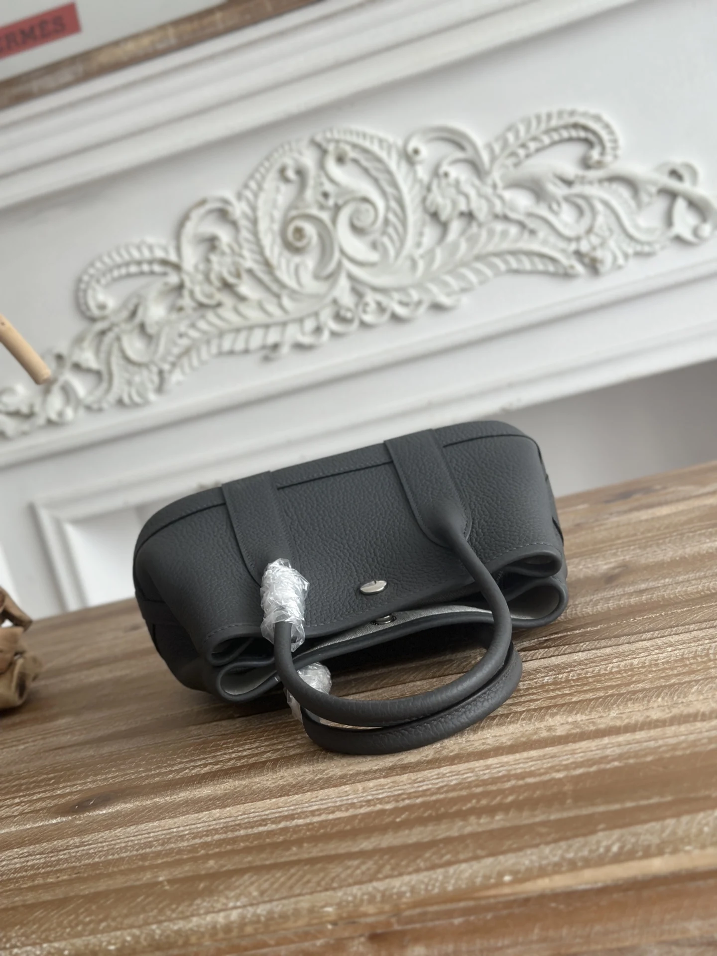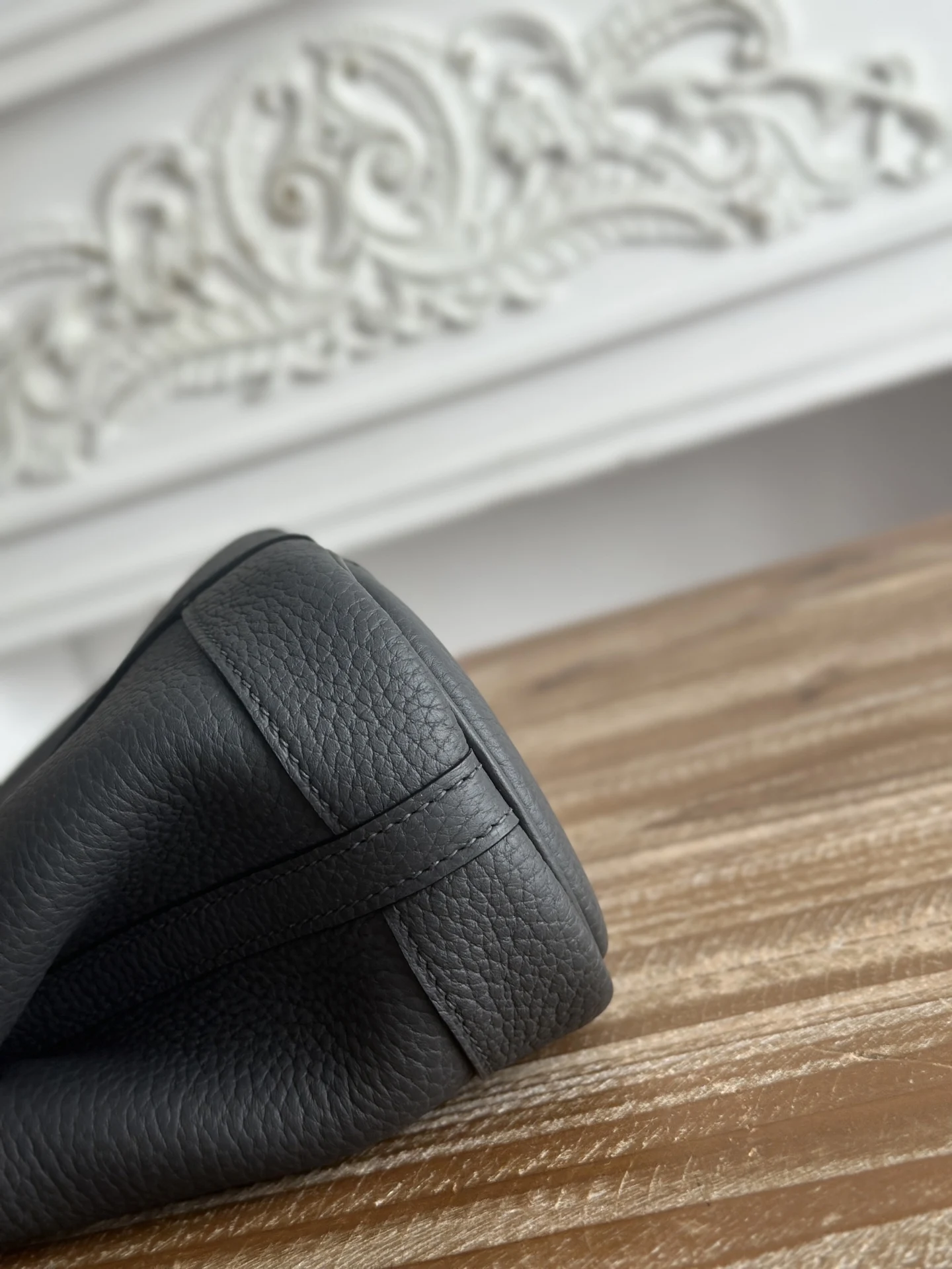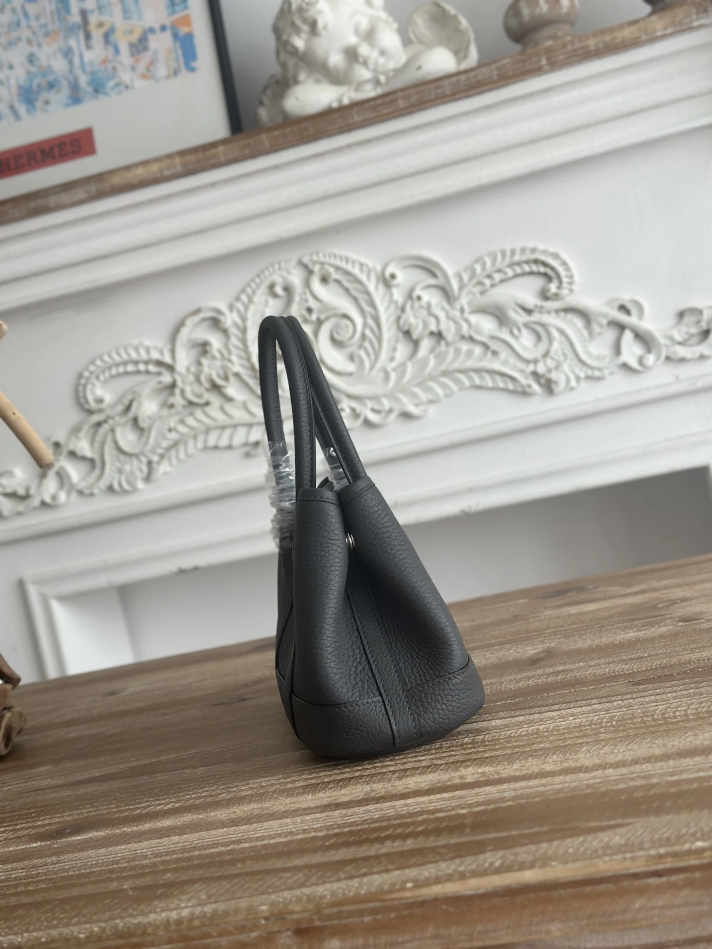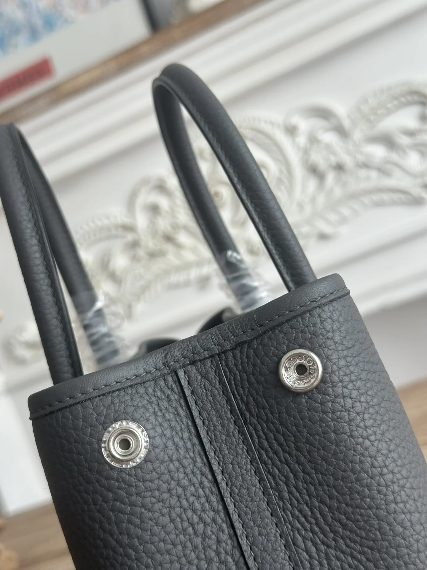 Semi-handmade Ntogo Leather Garden Party Bag Mini, lightweight and suitable for commuting or as a diaper bag. Combines aesthetics and practicality. Waxed thread, semi-handmade. Color: Graphite Grey. Size: 23cm.