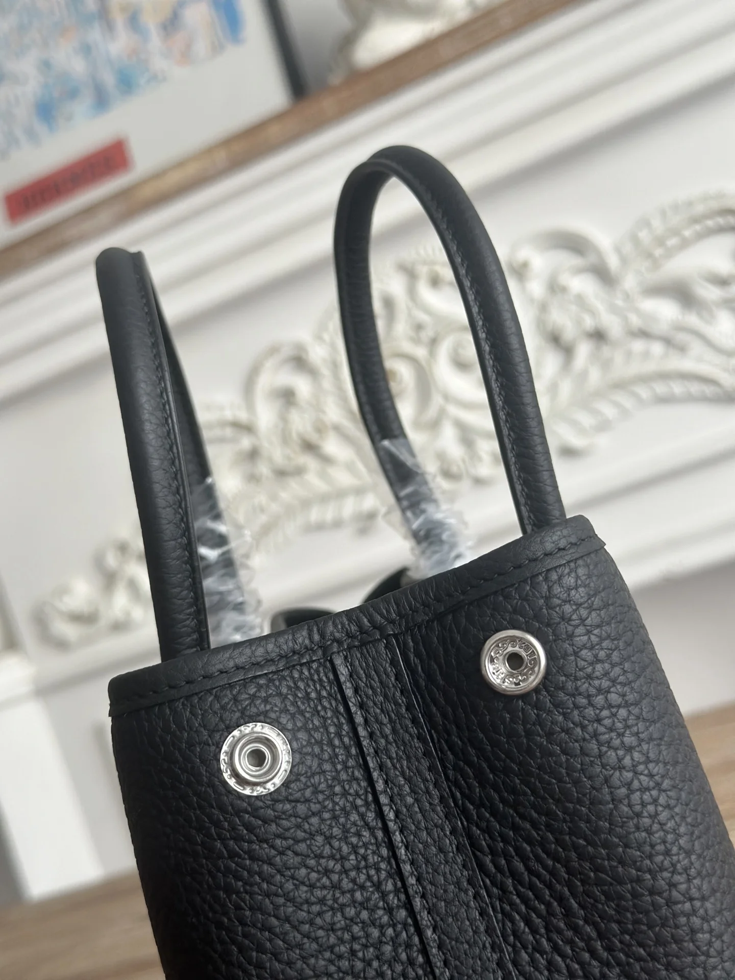 Semi-handmade Ntogo Leather Garden Party Bag Mini - Lightweight and suitable for commuting or as a diaper bag. Combines aesthetics and practicality. Waxed thread, semi-handmade. Color: Black. Size: 23cm.