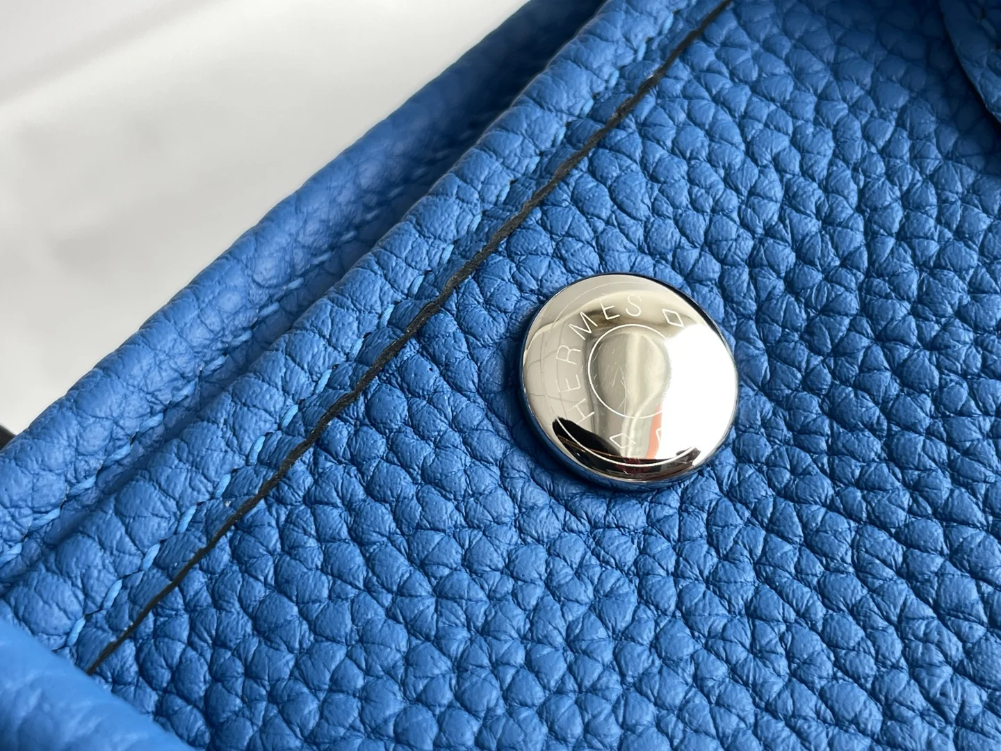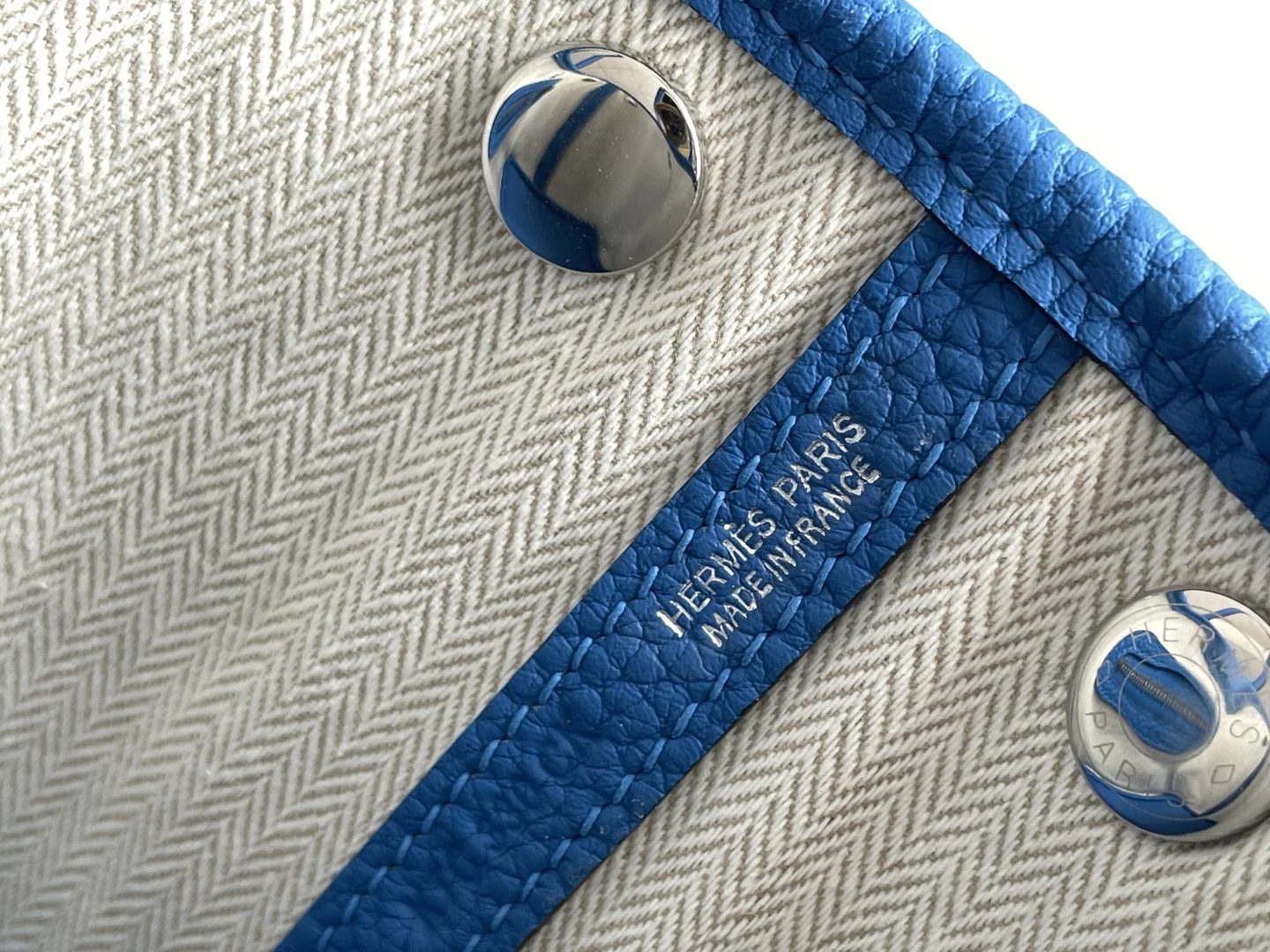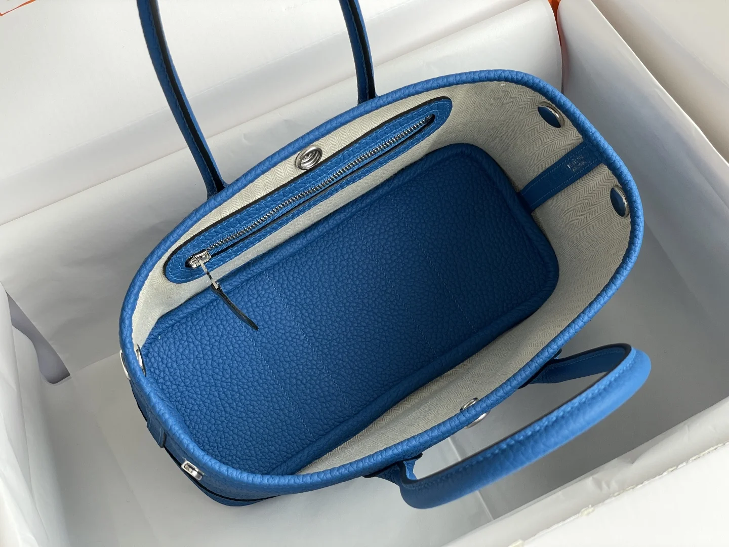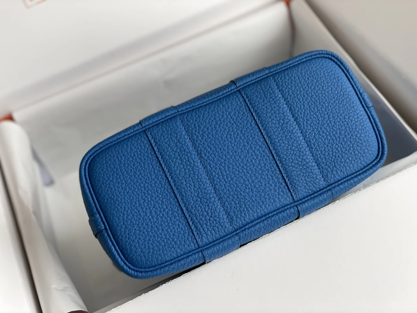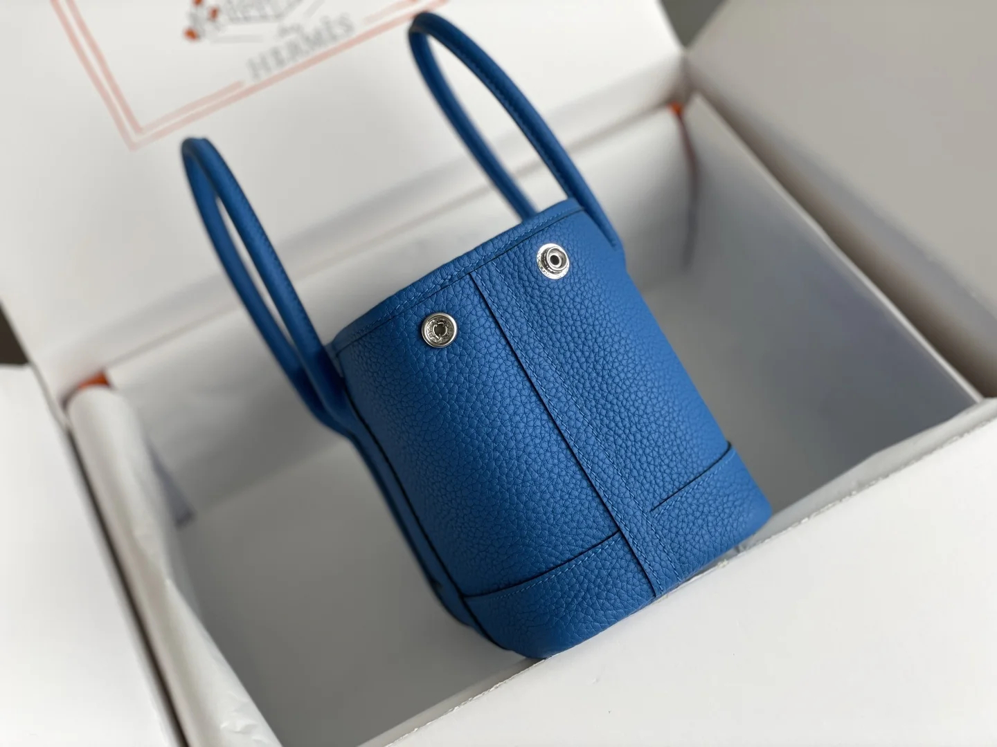 Semi-handmade Garden Party Mini Bag, Water Sprite Blue. Hardware: Electroplated pure steel. Leather: Grade A Ntogo, hand-stitched with beeswax thread matching the original. Dimensions: 23*16*10cm