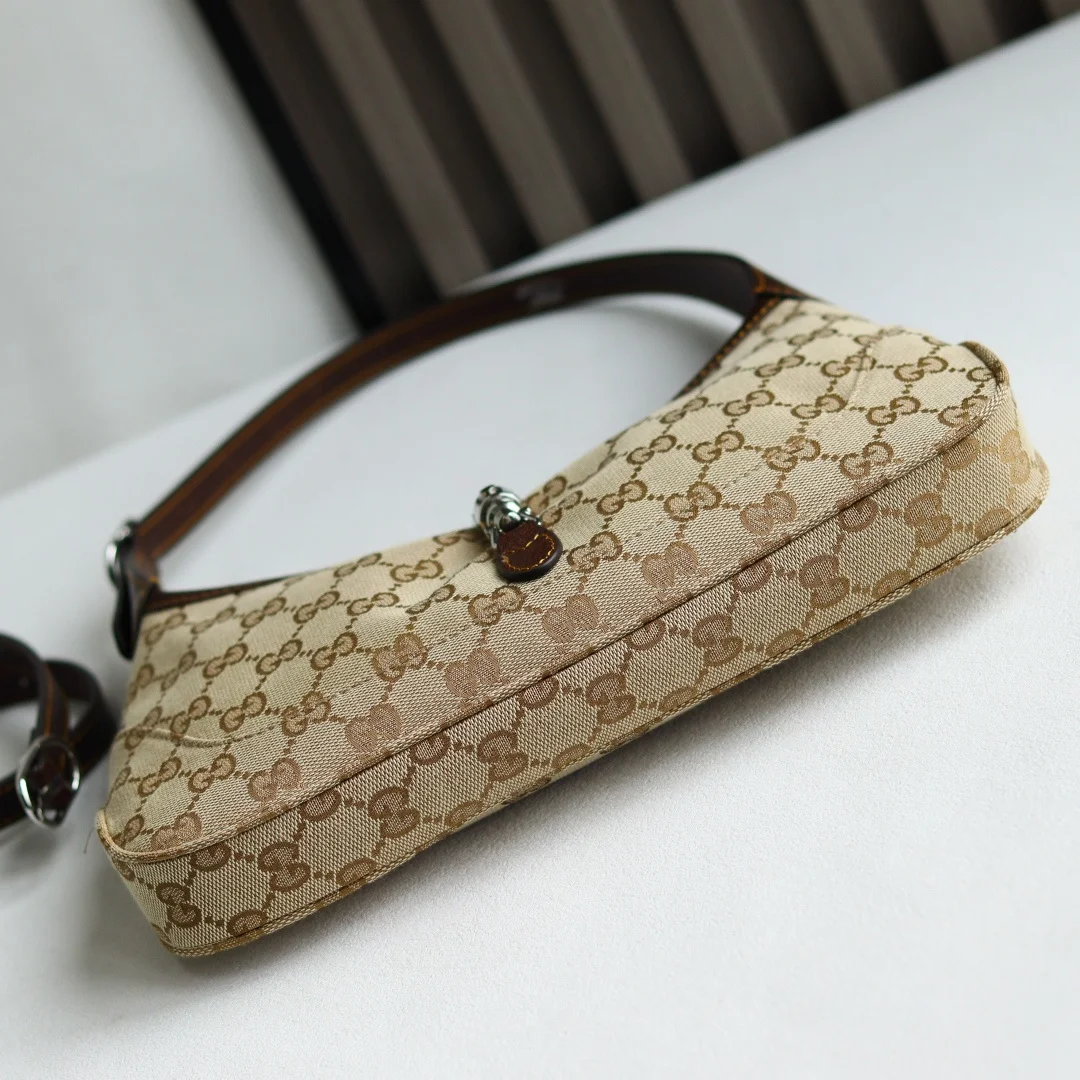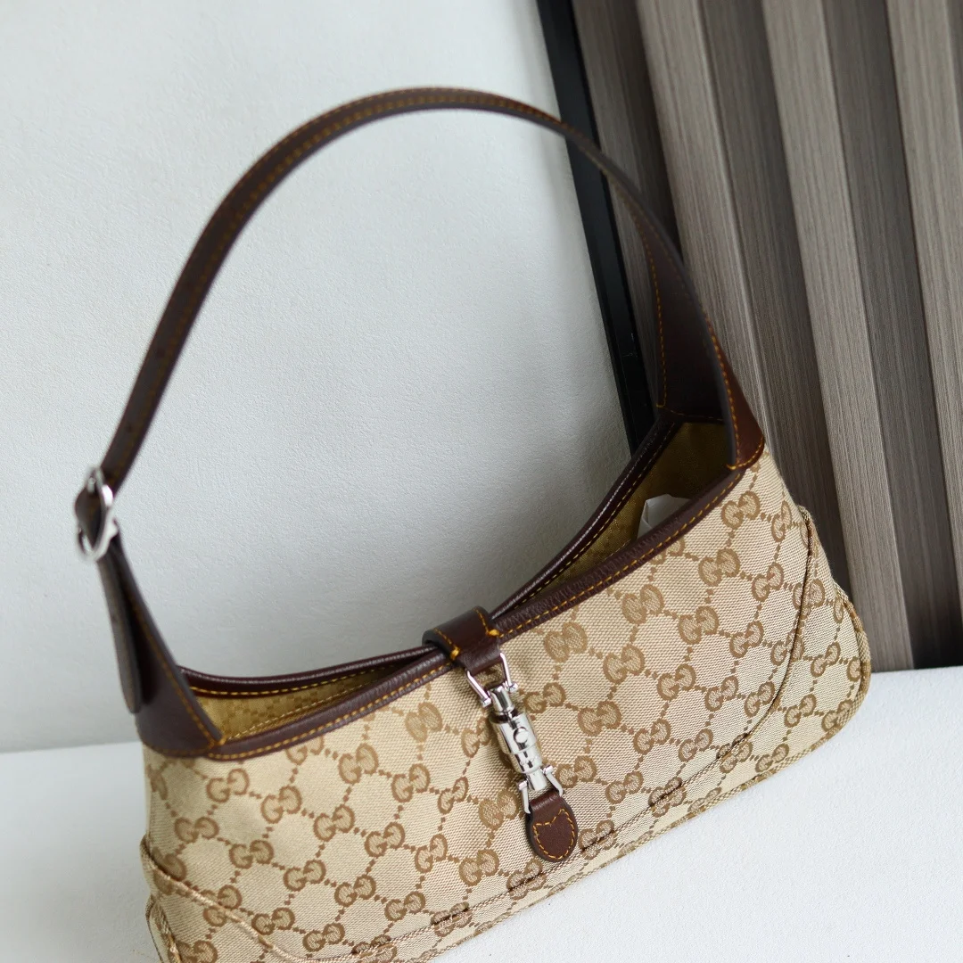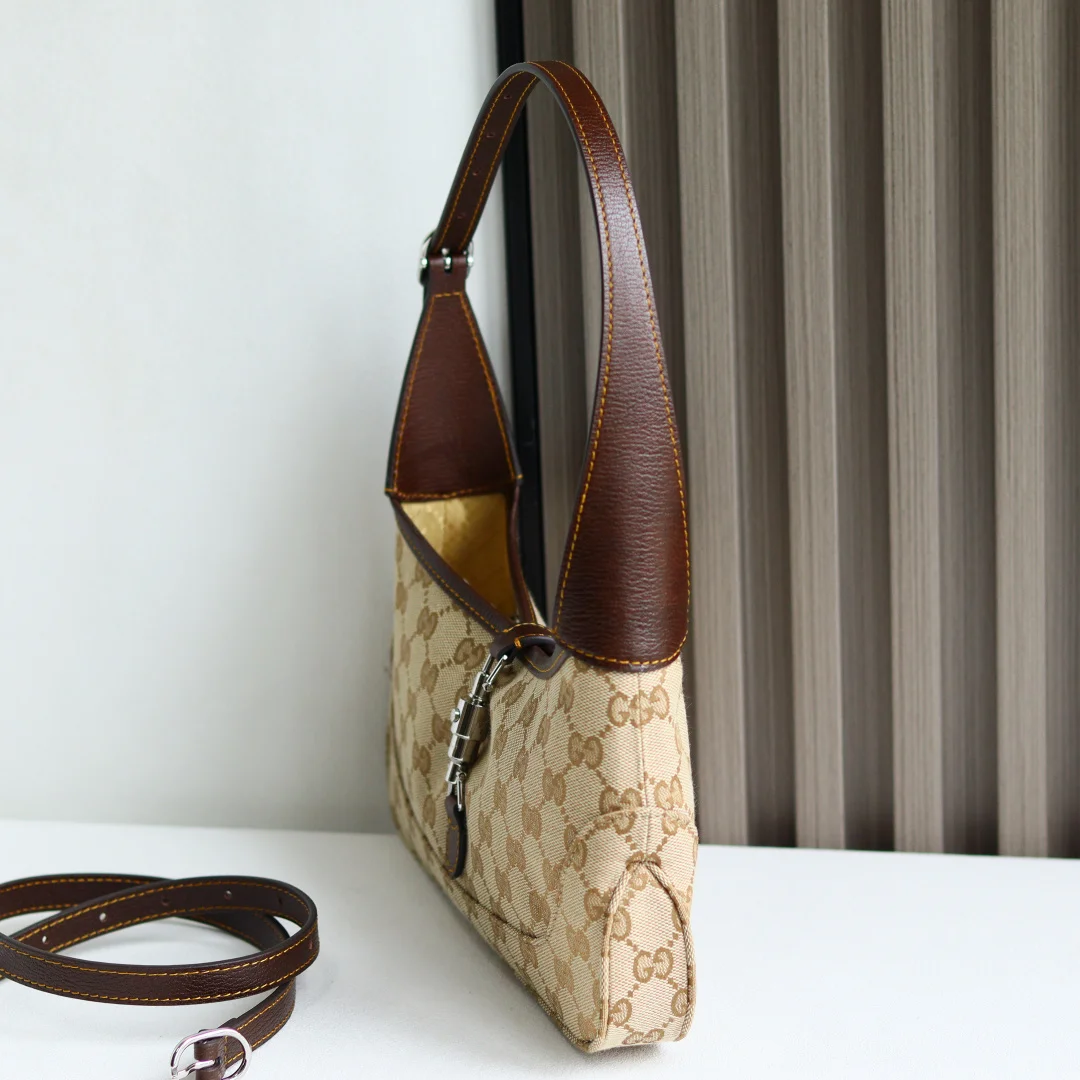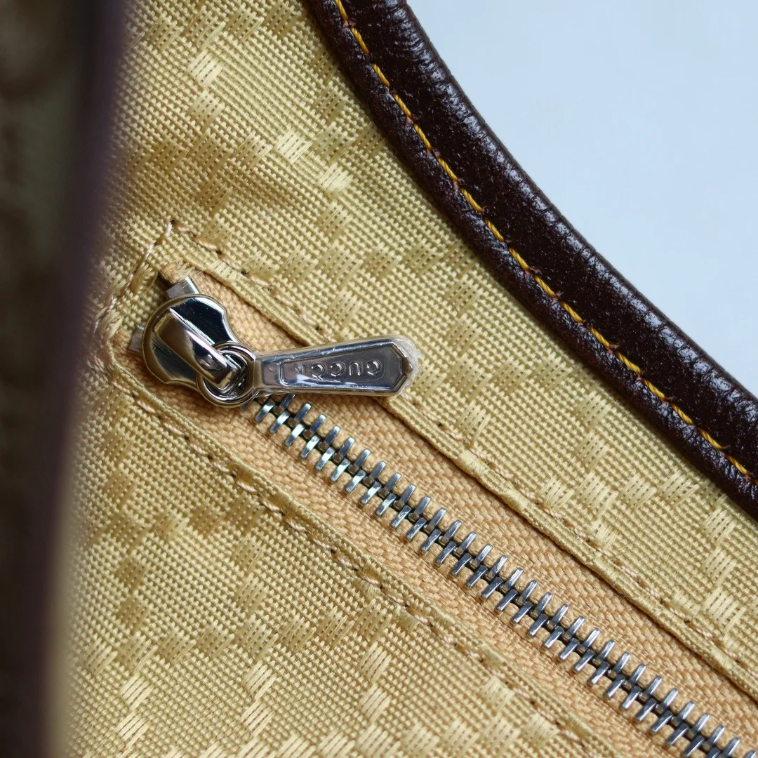 Gucci s new collection is a smash hit! Demna s design vision is incredible, making Gucci the dark horse of Fashion Week! Demna s La Famiglia collection elevates Gucci s vintage luxury to new heights. Every detail of the new products reveals the designer s ingenuity, with classic elements reinterpreted for greater recognition. From everyday shoulder bags to evening tassel bags, the style spans a wide range while maintaining a unified and sophisticated aesthetic. Beige and dark brown GG canvas, brown leather trim, brown linen lining. Interior: 1 zip pocket. Model: 863137. Dimensions: 27x13x6cm. Color: Apricot Fabric, Brown Leather. Made in Italy.