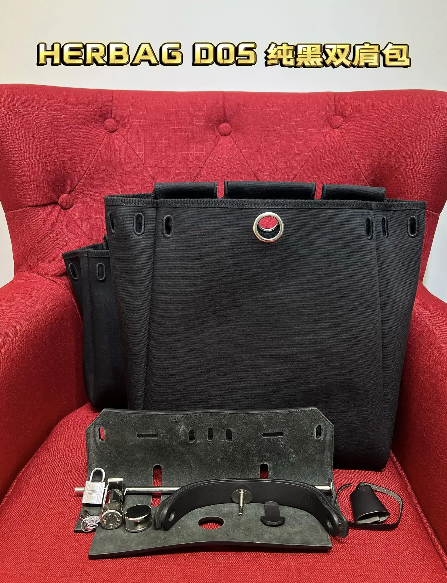 Semi-handcrafted, beeswax-stitched Herbag backpack A DOS series, limited edition all-black vintage model. Configured with two interchangeable bag bodies for versatile use (backpack shoulder bag transformation). The A DOS, a long-standing vintage model in the Herbag line, functions not only as a backpack but also transforms into a shoulder bag by detaching the internal shoulder straps. Dimensions: Large bag: width 30, height 35, depth 10; Small bag: width 30, height 25, depth 10.