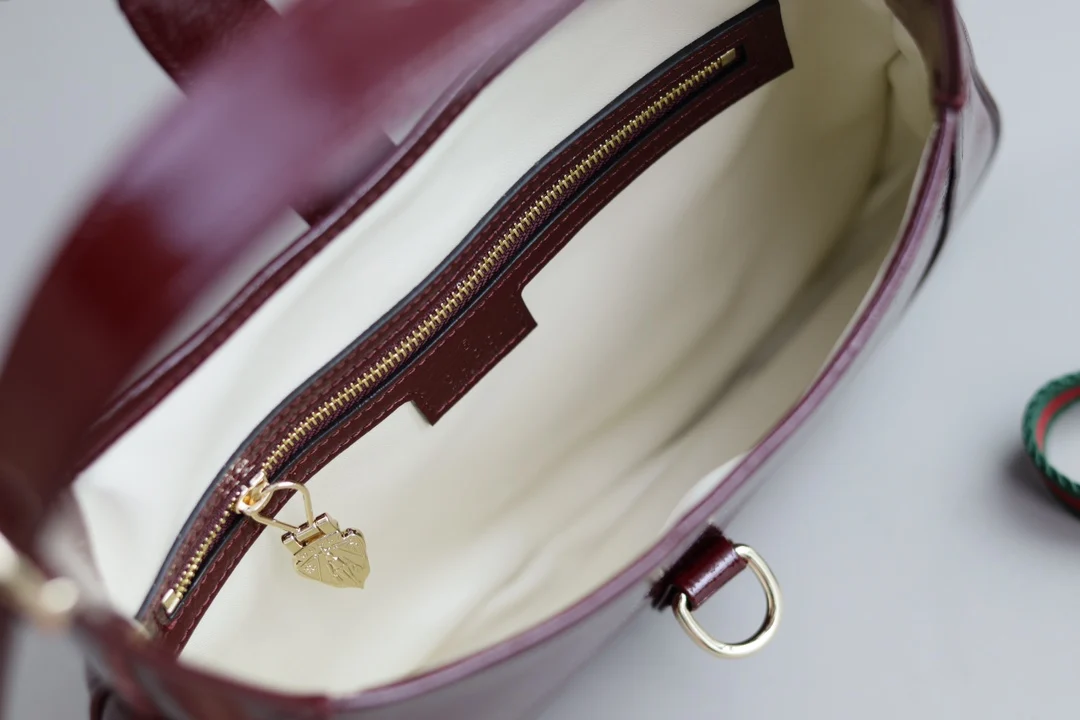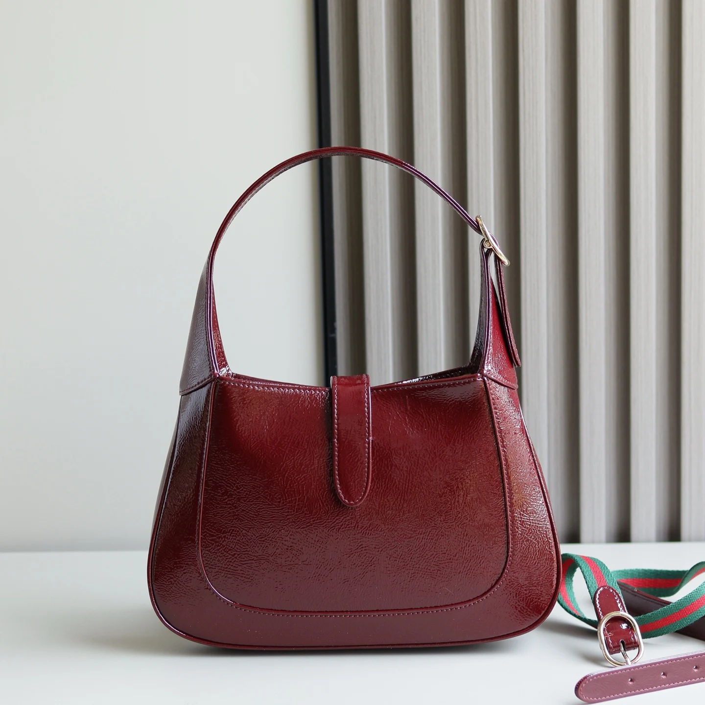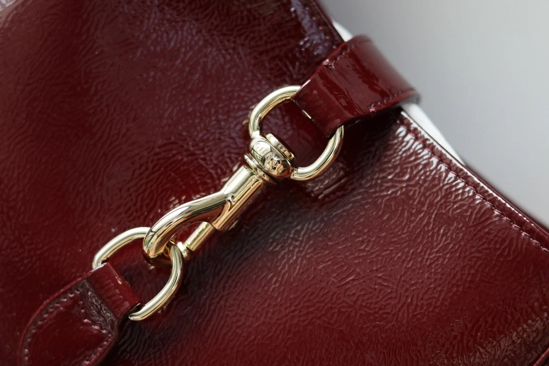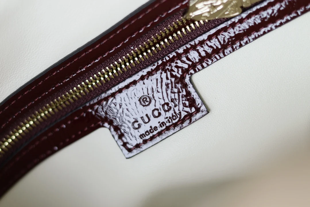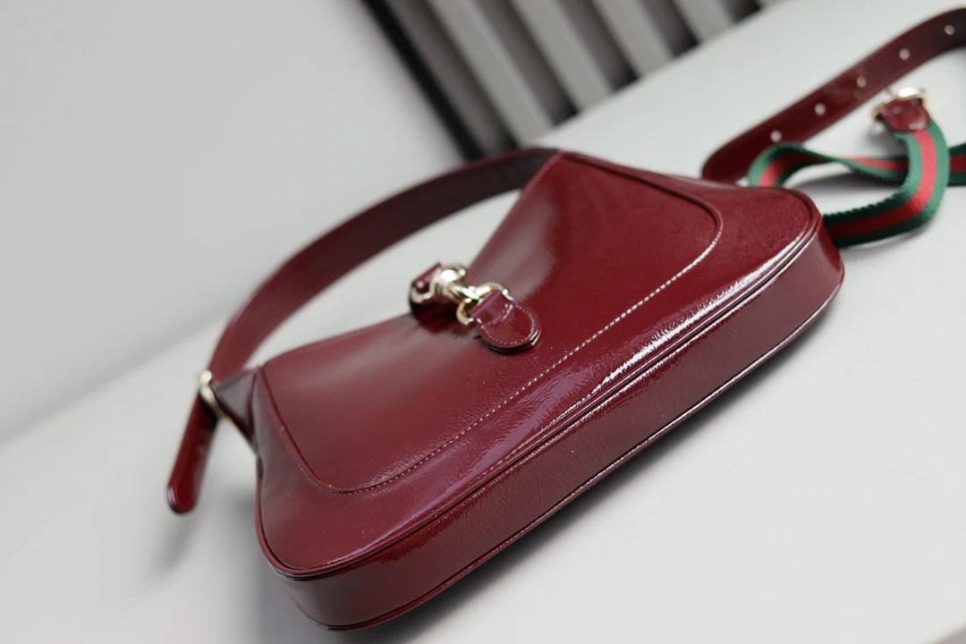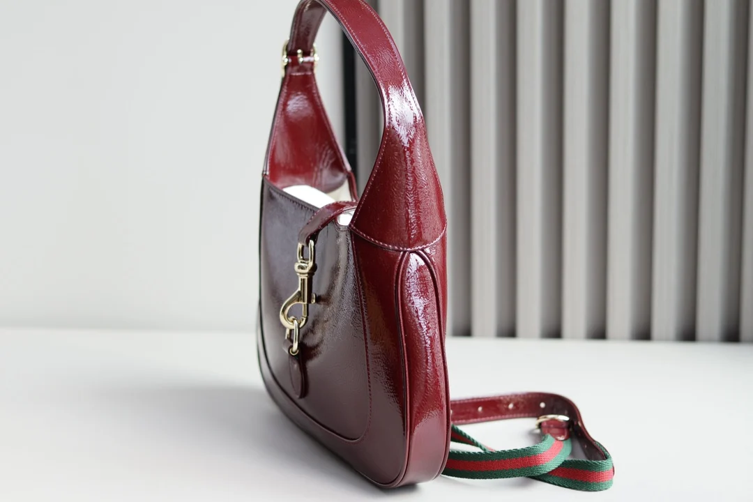 This new Jackie 1961 bag is crafted from high-quality leather, showcasing the brand s exquisite craftsmanship, crescent shape, and stylish design of the classic shoulder bag. The combination of light gold-toned hardware, leather trim, and an additional strap with the Web stripe offers more styling options for this small Jackie shoulder bag in red patent leather.- Red patent leather- Light gold-toned hardware- Leather lining- Interior: one zipper pocket with Gucci logo zipper pull- Handle with 18cm drop- Detachable web strap with 52cm drop- Piston closure- G782849- Dimensions: 27.5 x 19 x 4cm