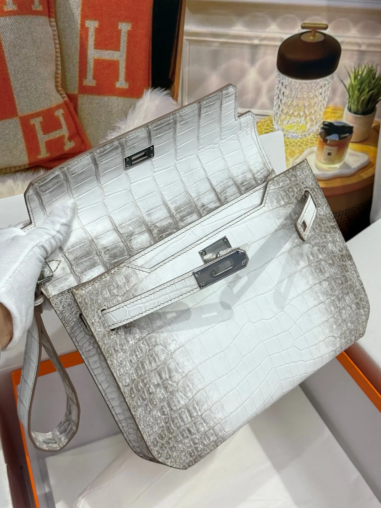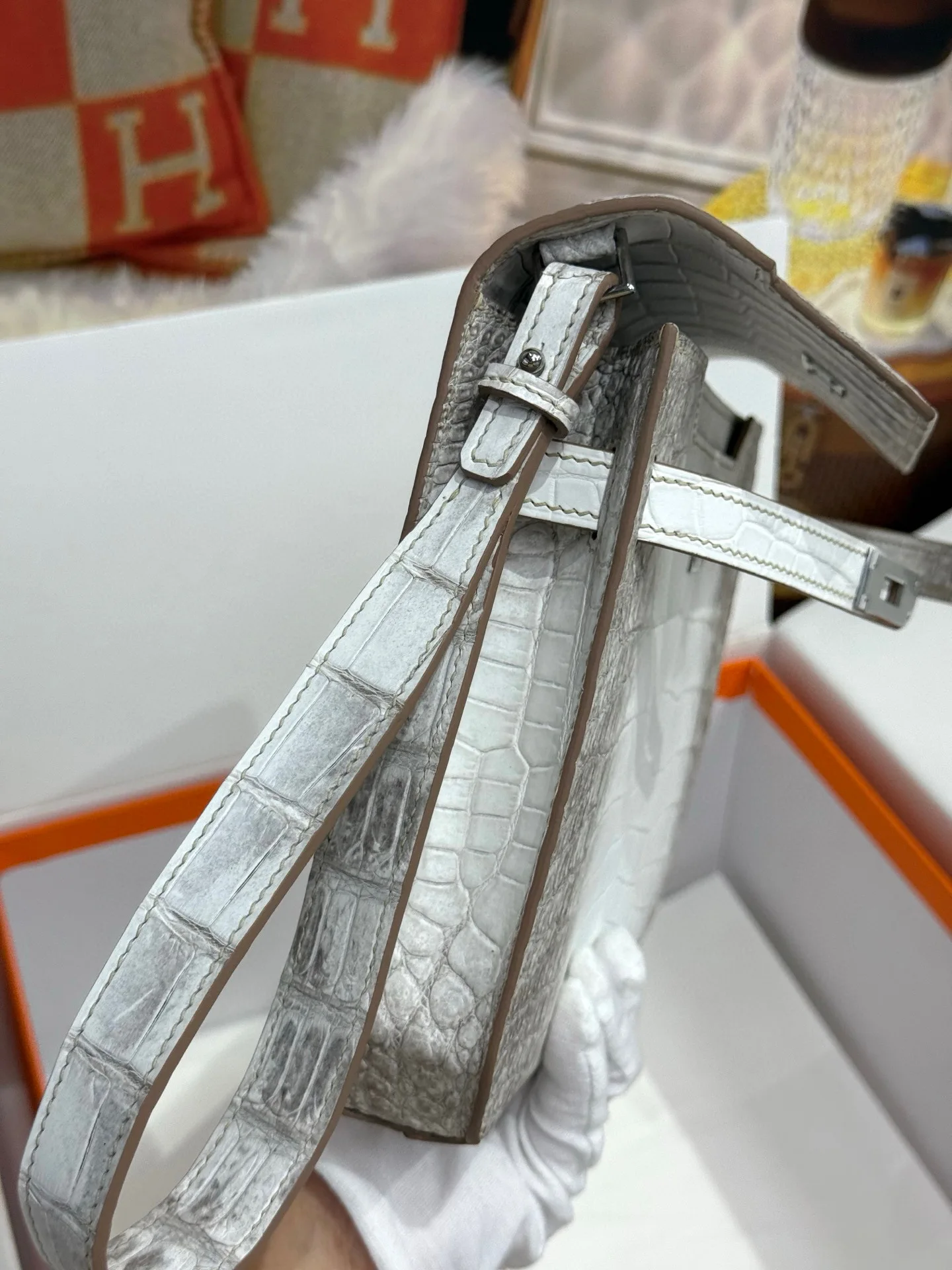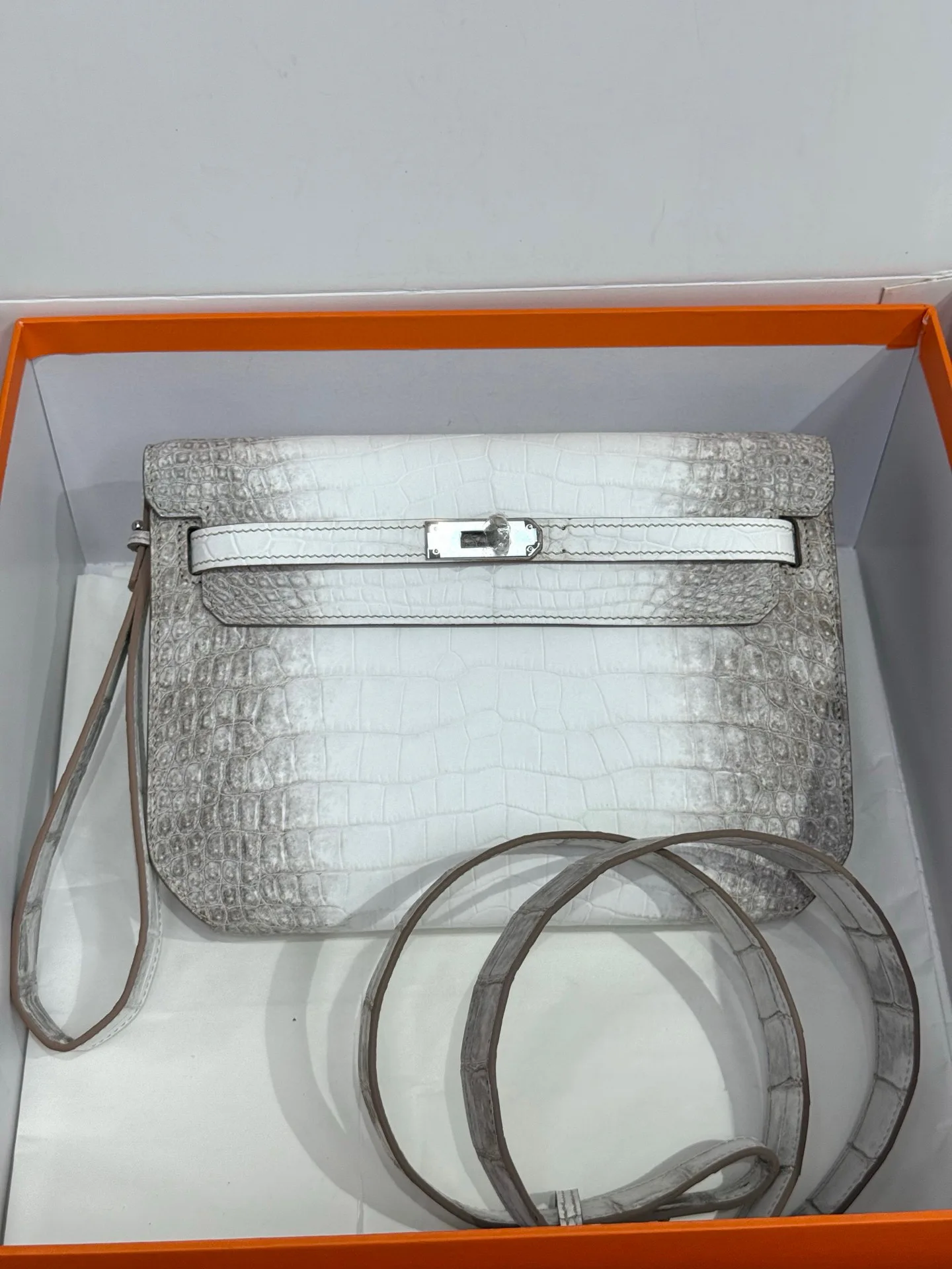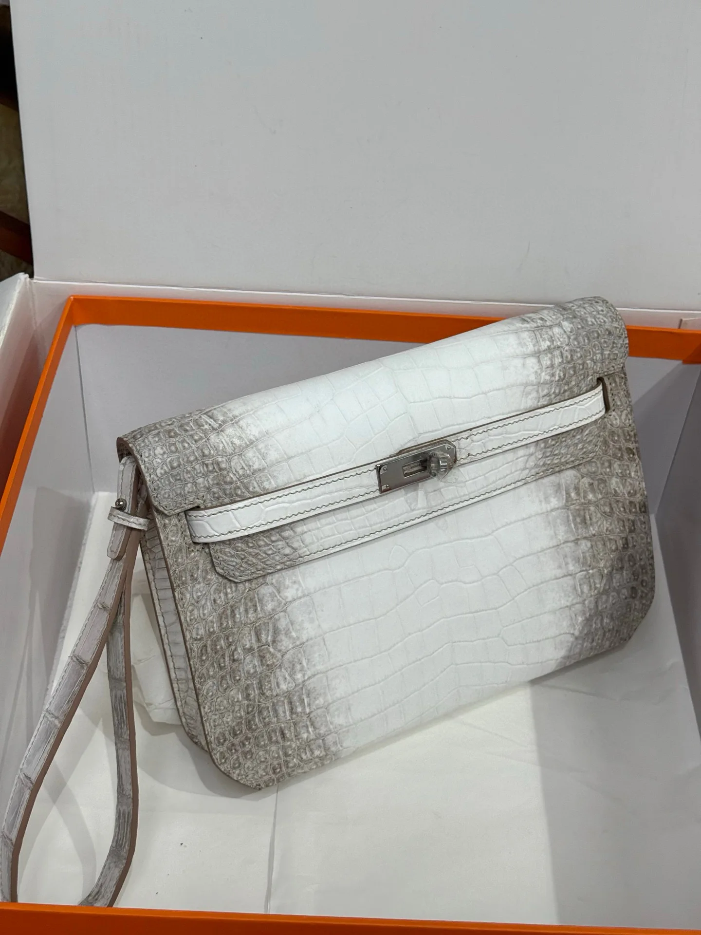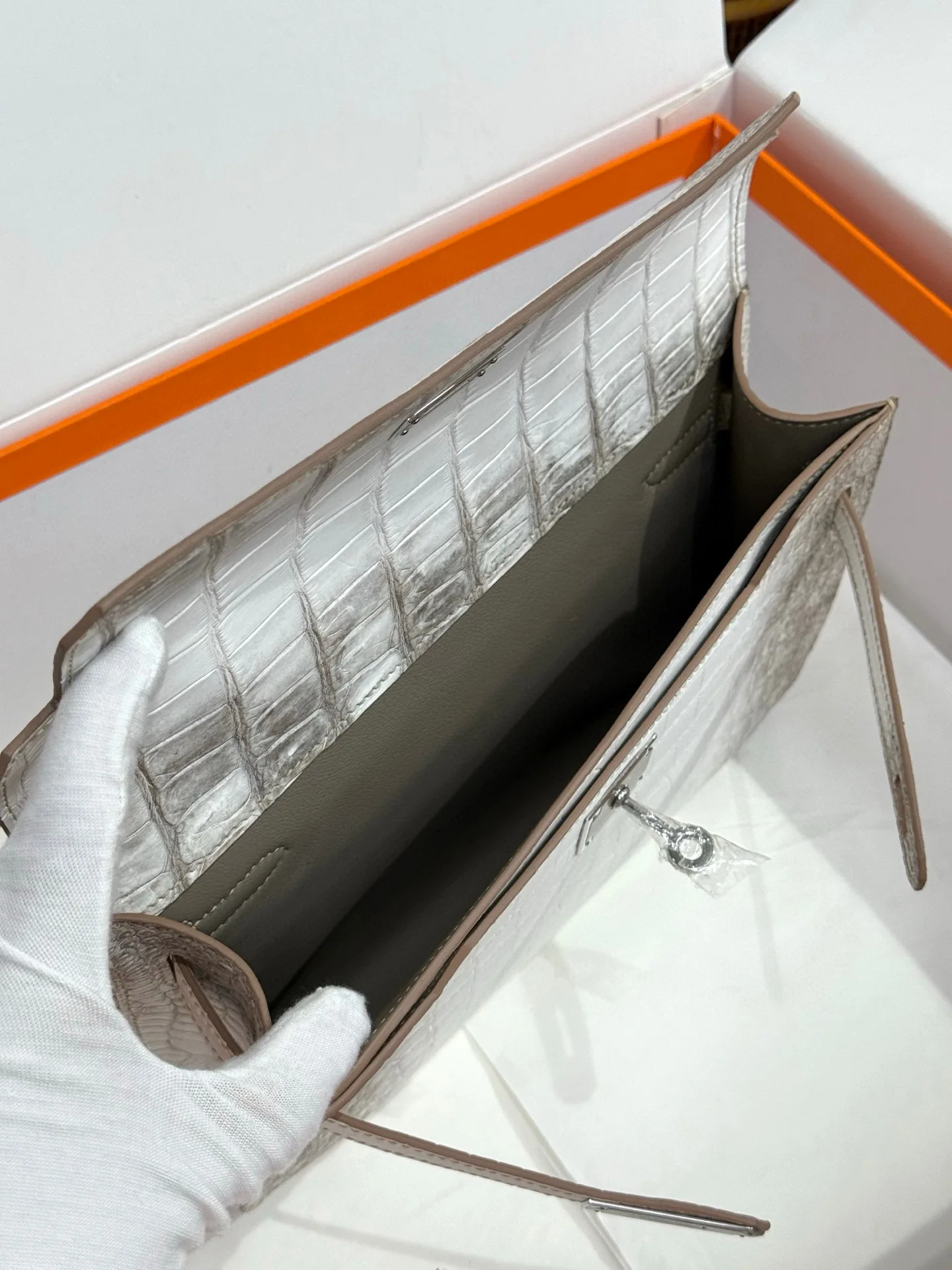 Kelly Depeches 25cm Clutch, Imported Matte Crocodile Belly Himalayan White, Full Set of Hand-Hammered Hardware, Hand-Sewn Wax Thread