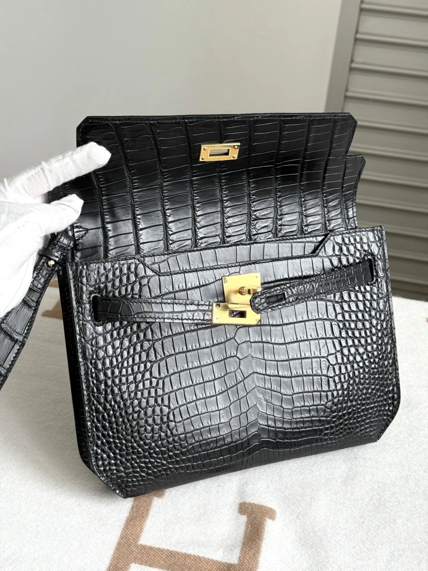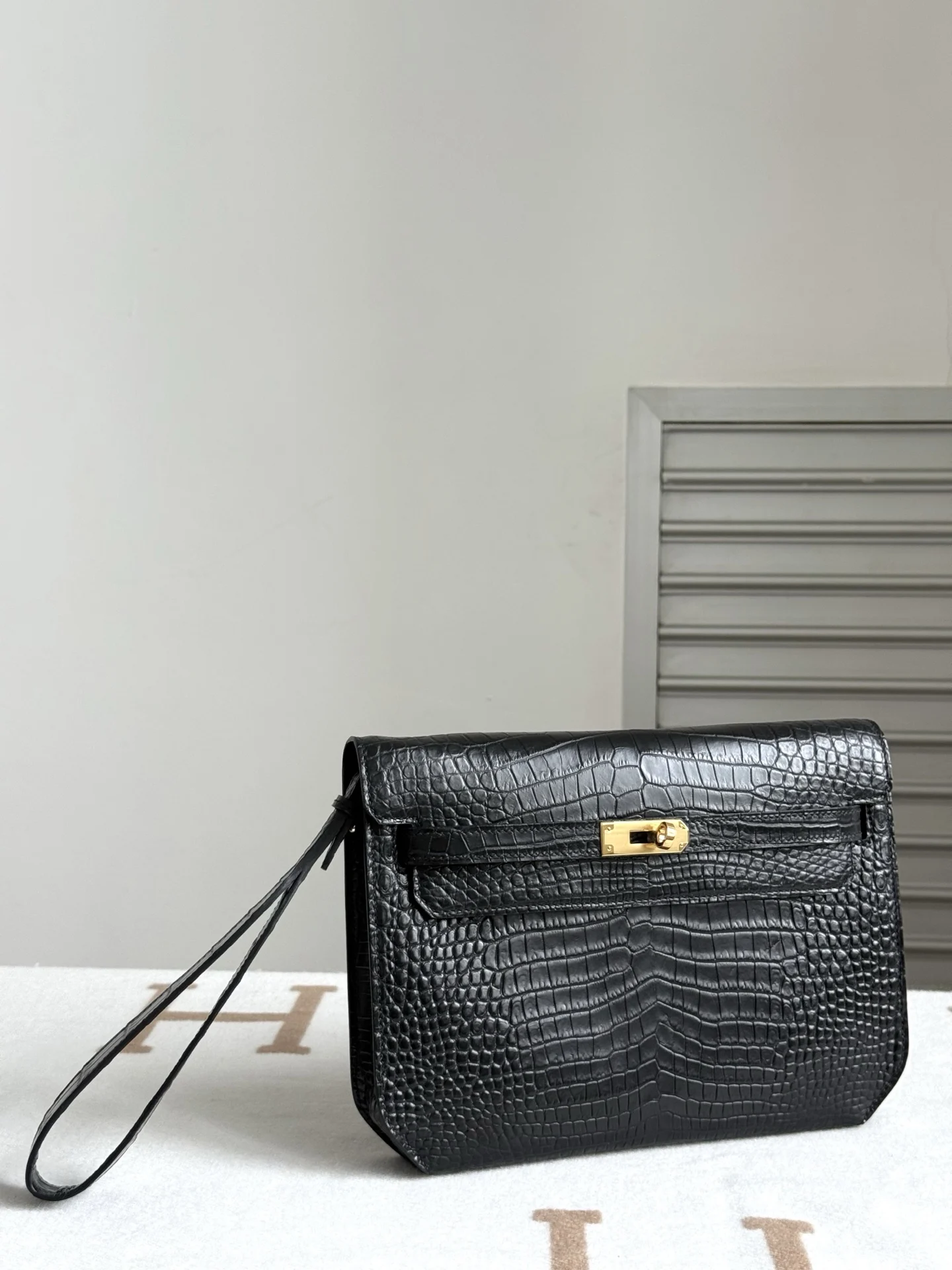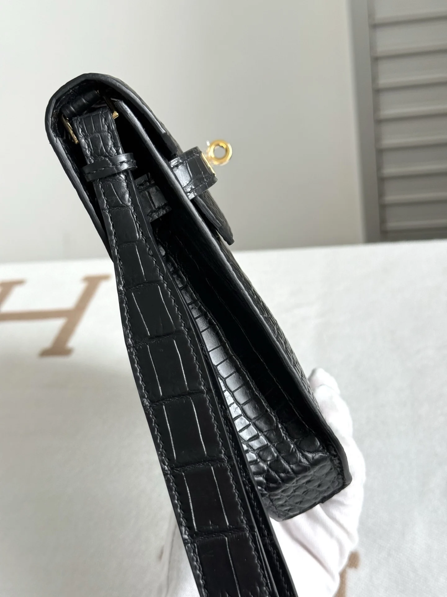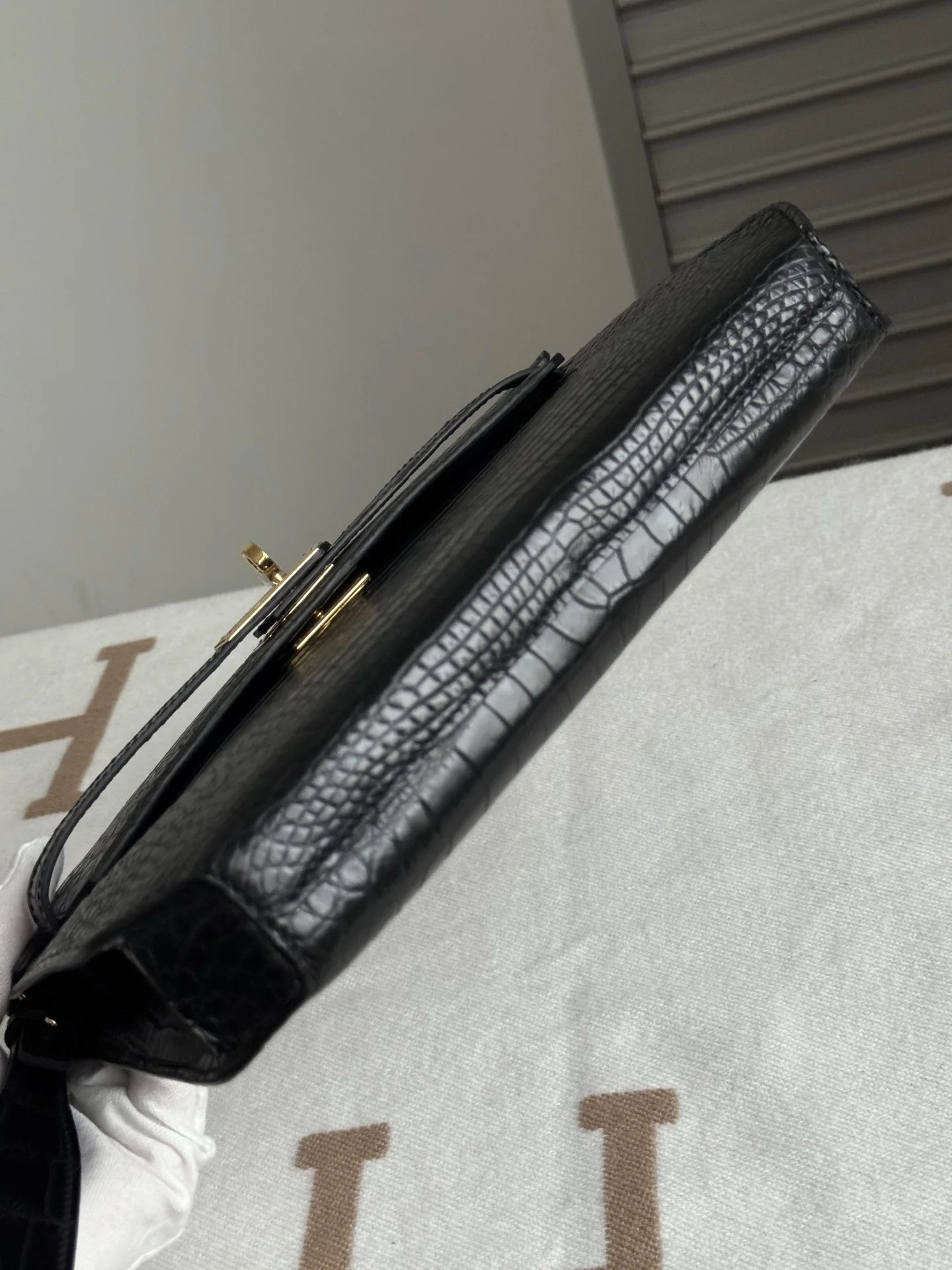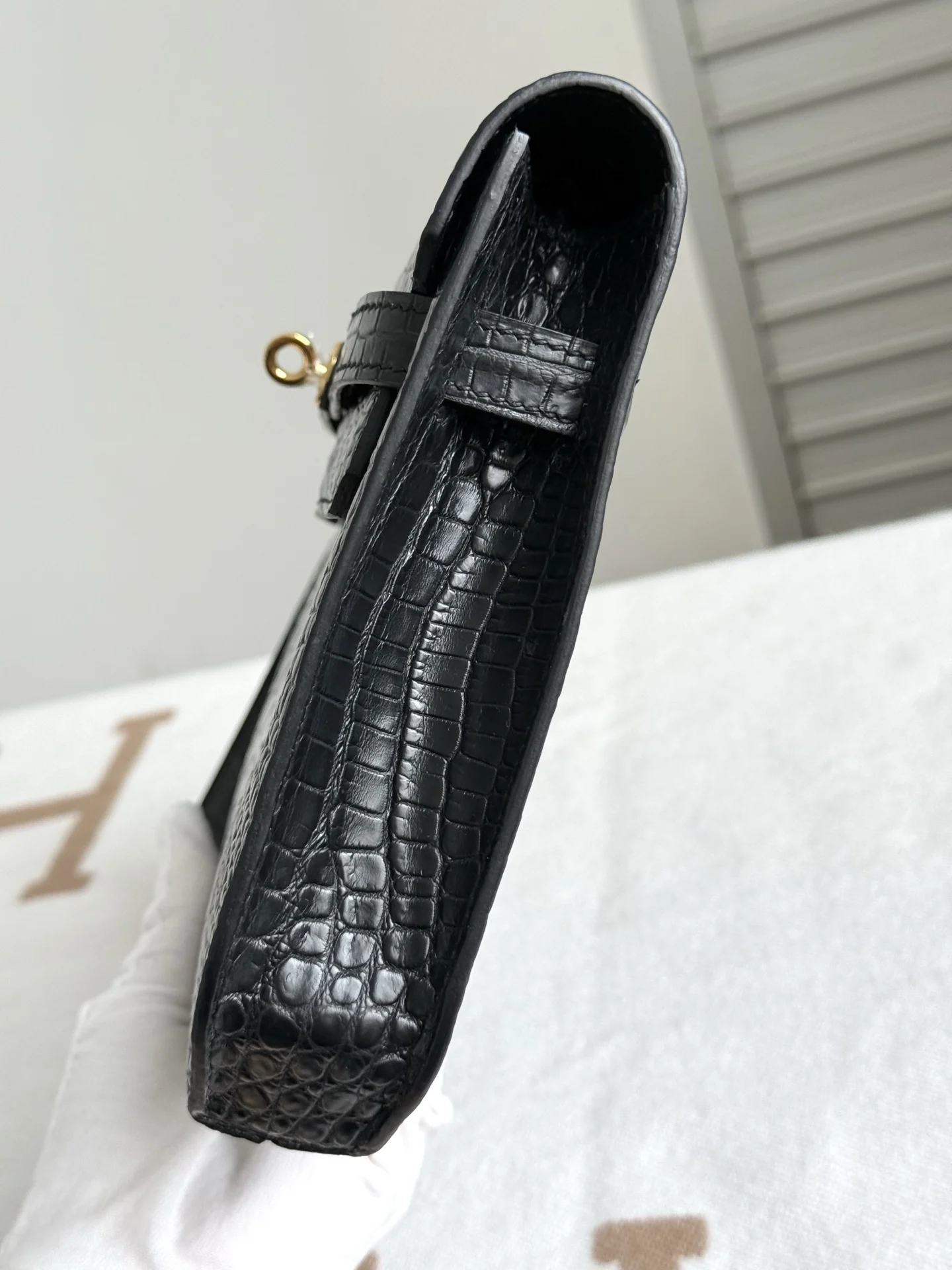 Kelly Depeches 25cm Clutch, Imported Matte Alligator Belly Leather in Black, Gold Hardware, Full Set of Hand-Hammered Hardware, Hand-Sewn Waxed Thread