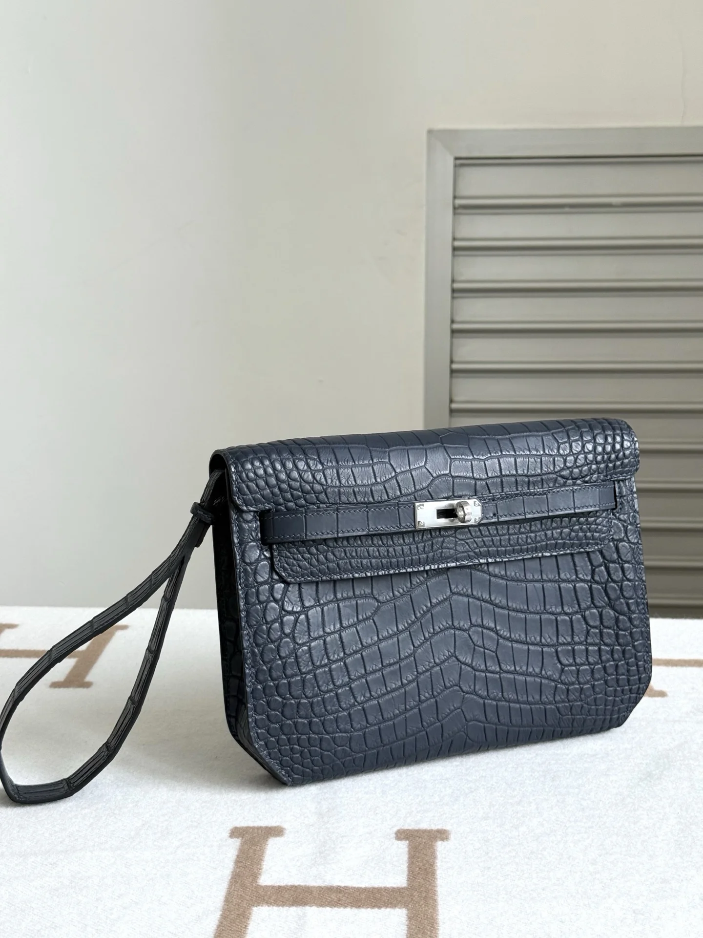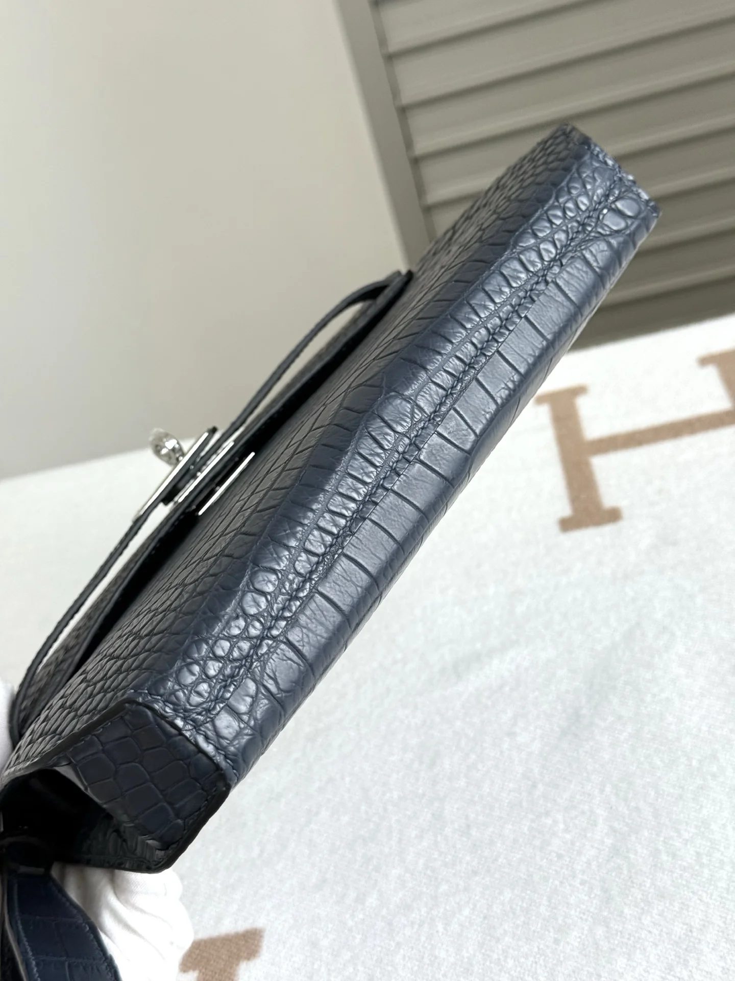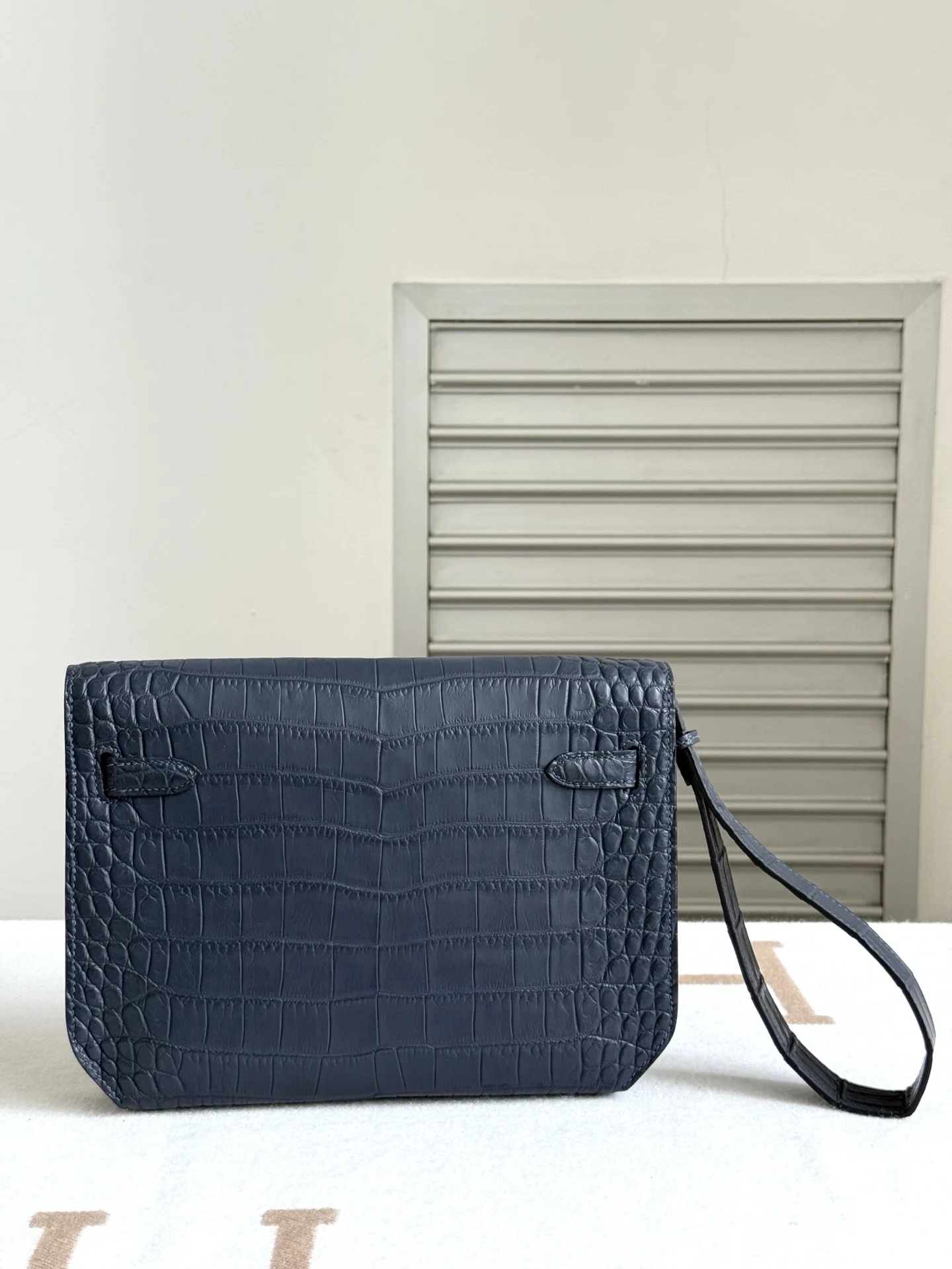 Kelly Depeches 25cm Clutch, Imported Matte Crocodile Leather in Denim Blue, Full Set of Hand-Hammered Hardware, Lined with Imported Lambskin, Hand-Sewn with Waxed Thread