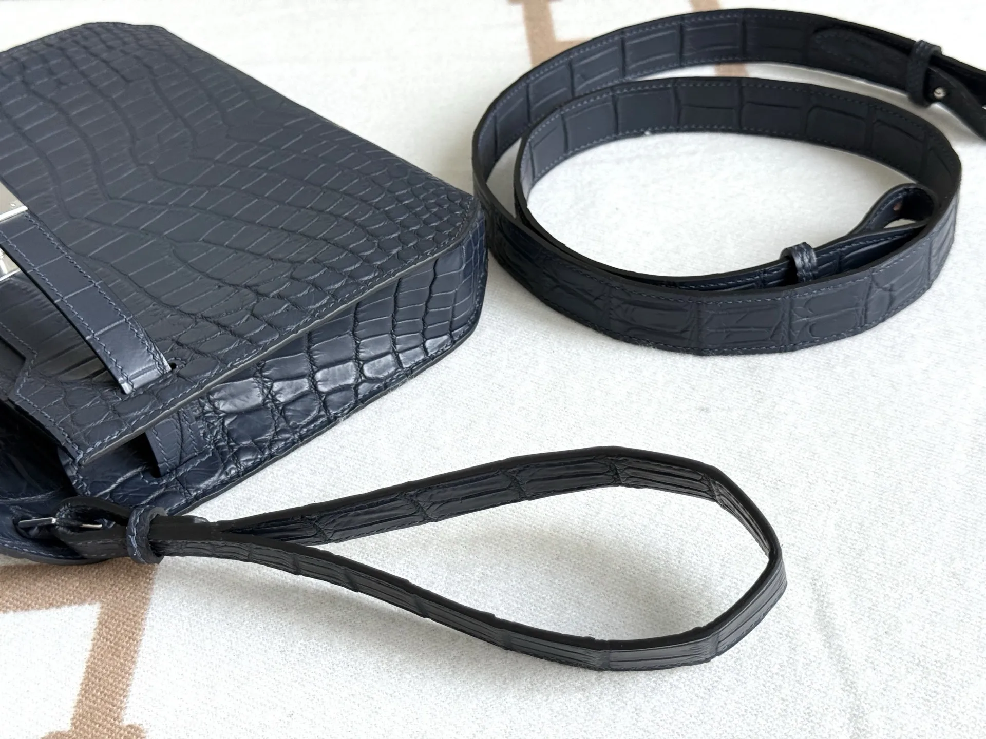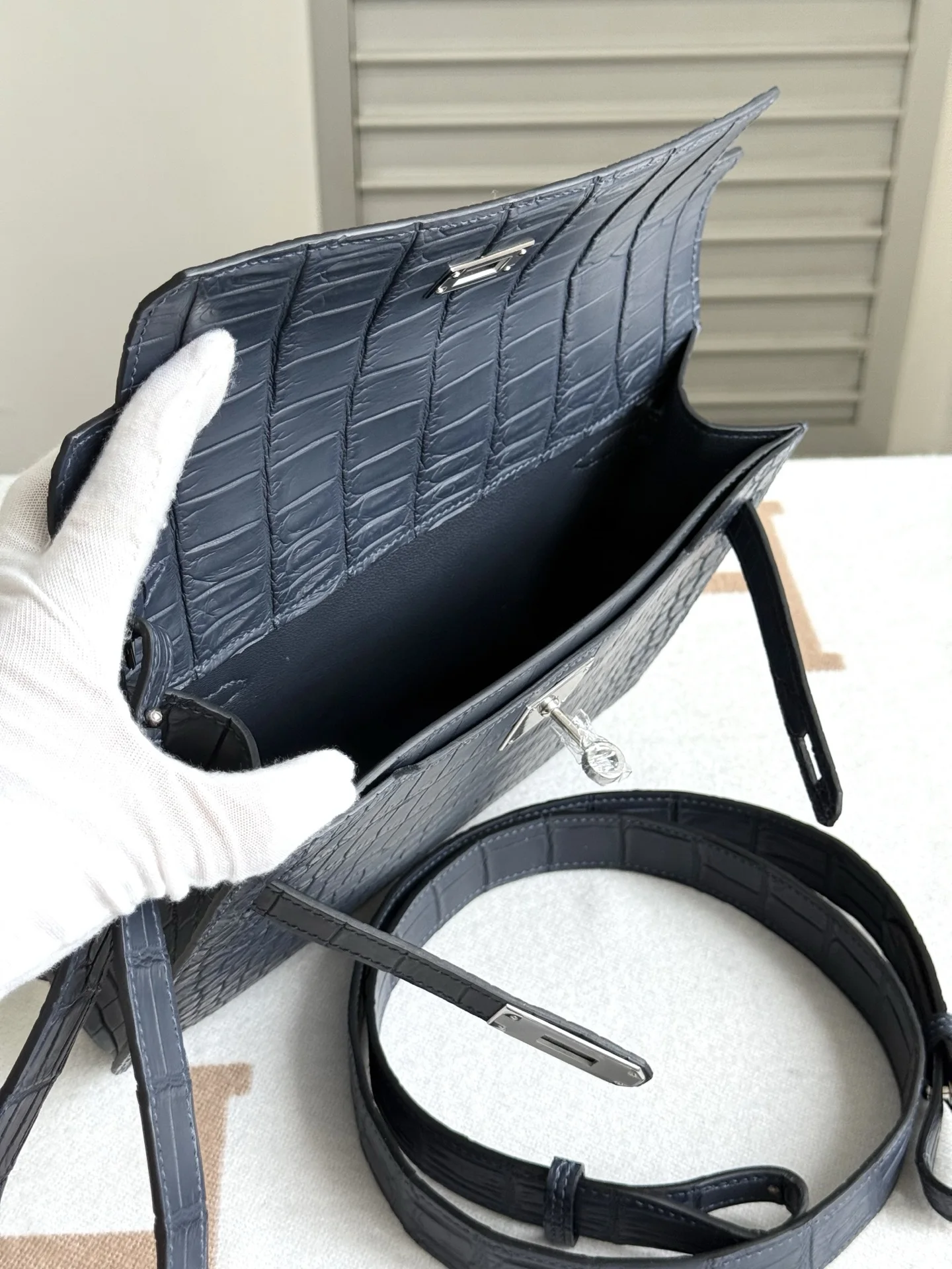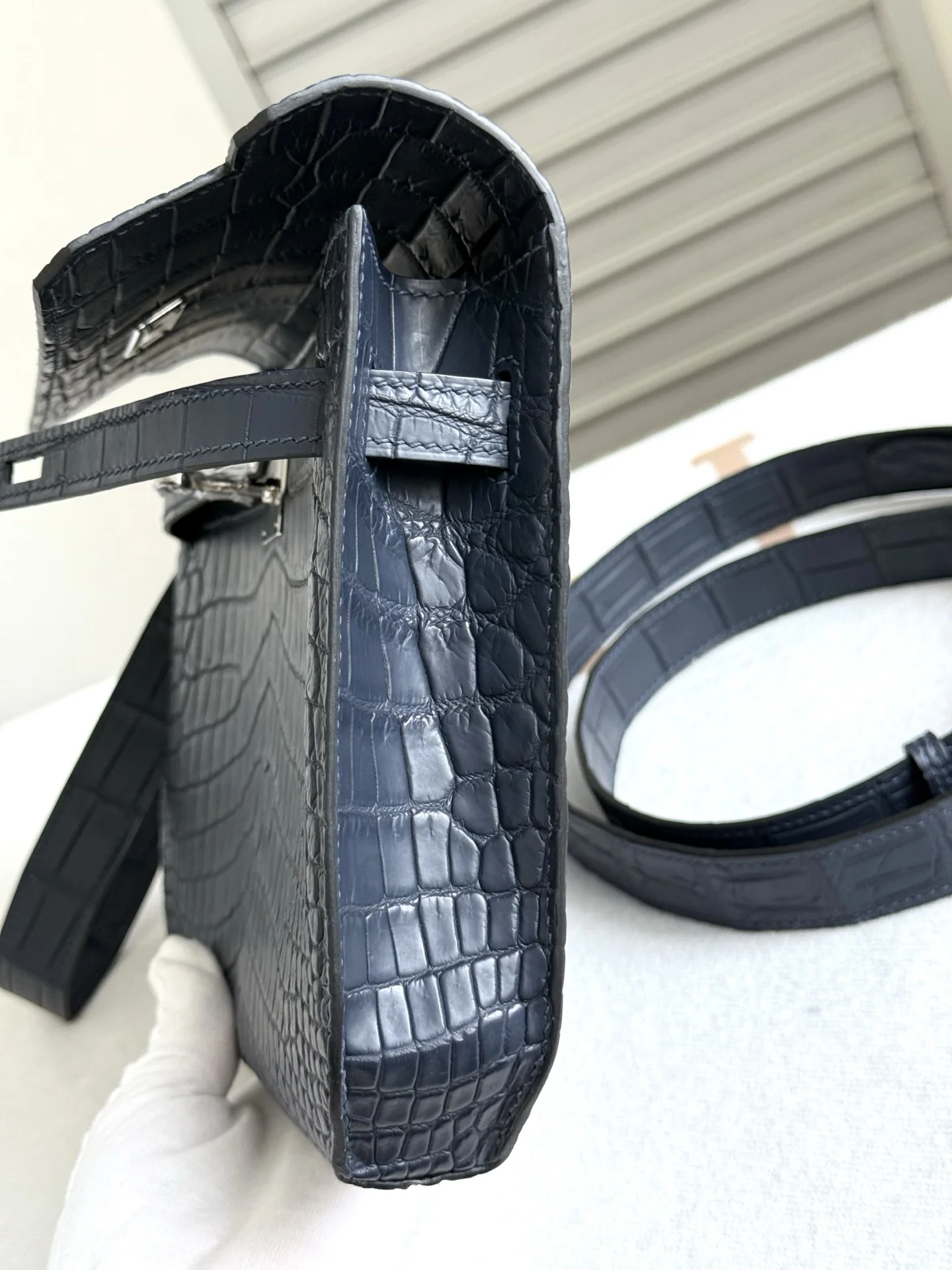 Kelly Depeches 25cm Clutch, Imported Matte Crocodile Leather in Denim Blue, Full Set of Hand-Hammered Hardware, Lined with Imported Lambskin, Hand-Sewn with Waxed Thread