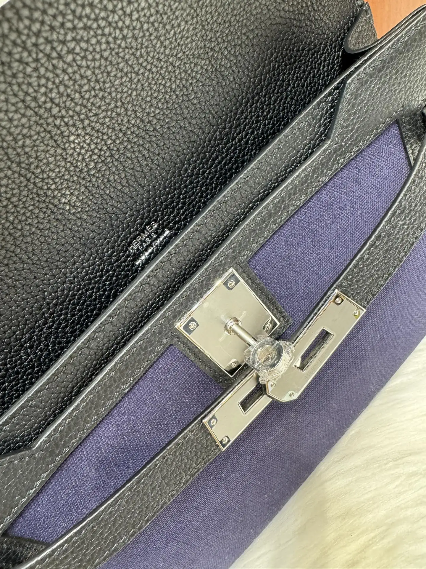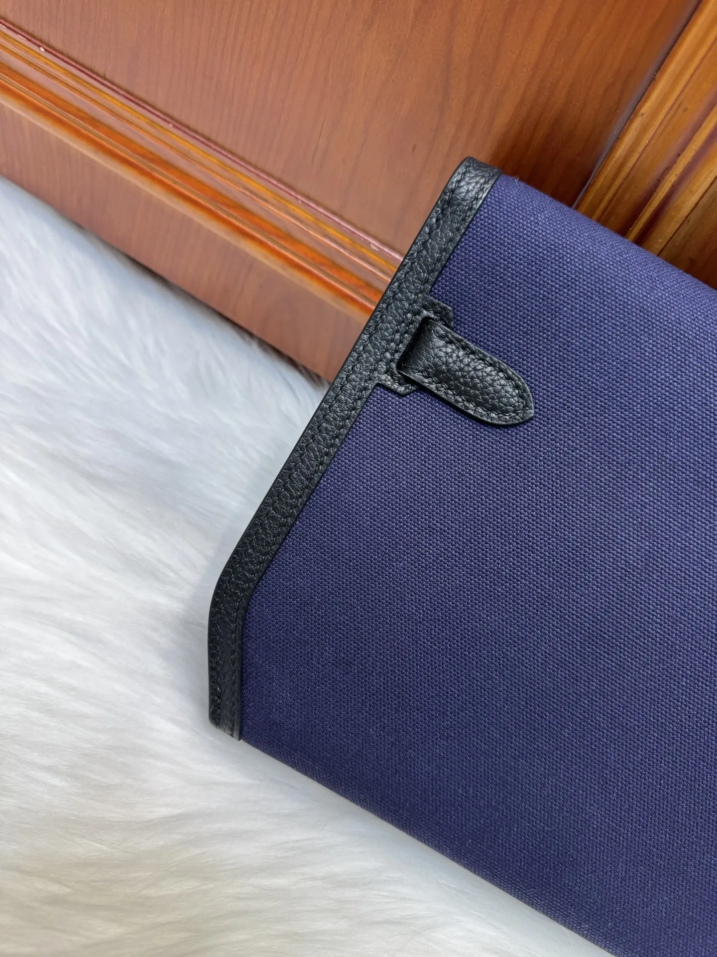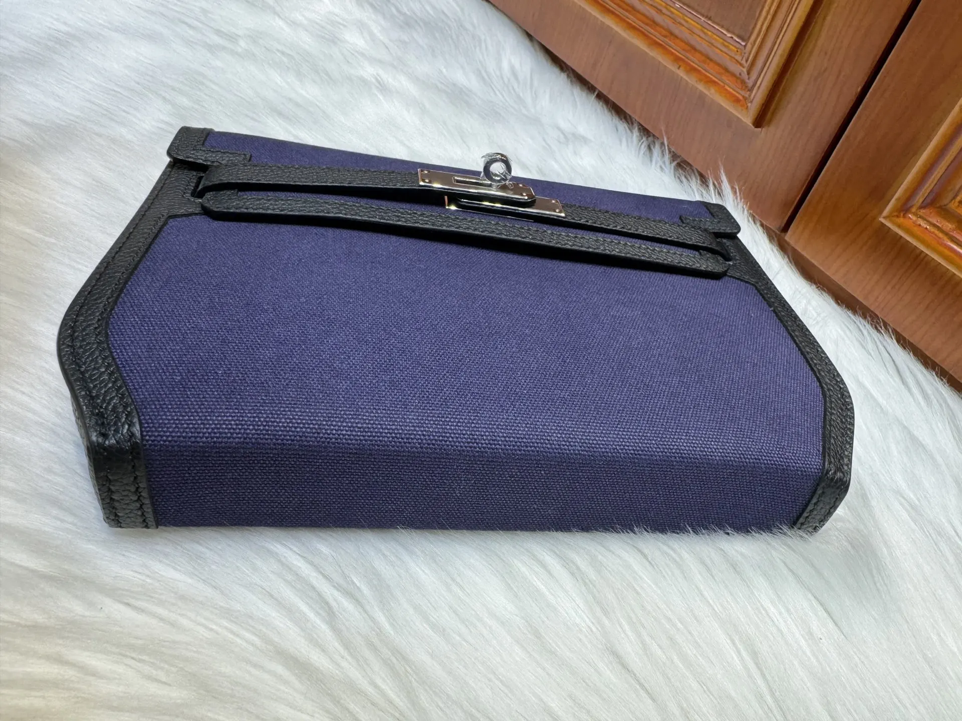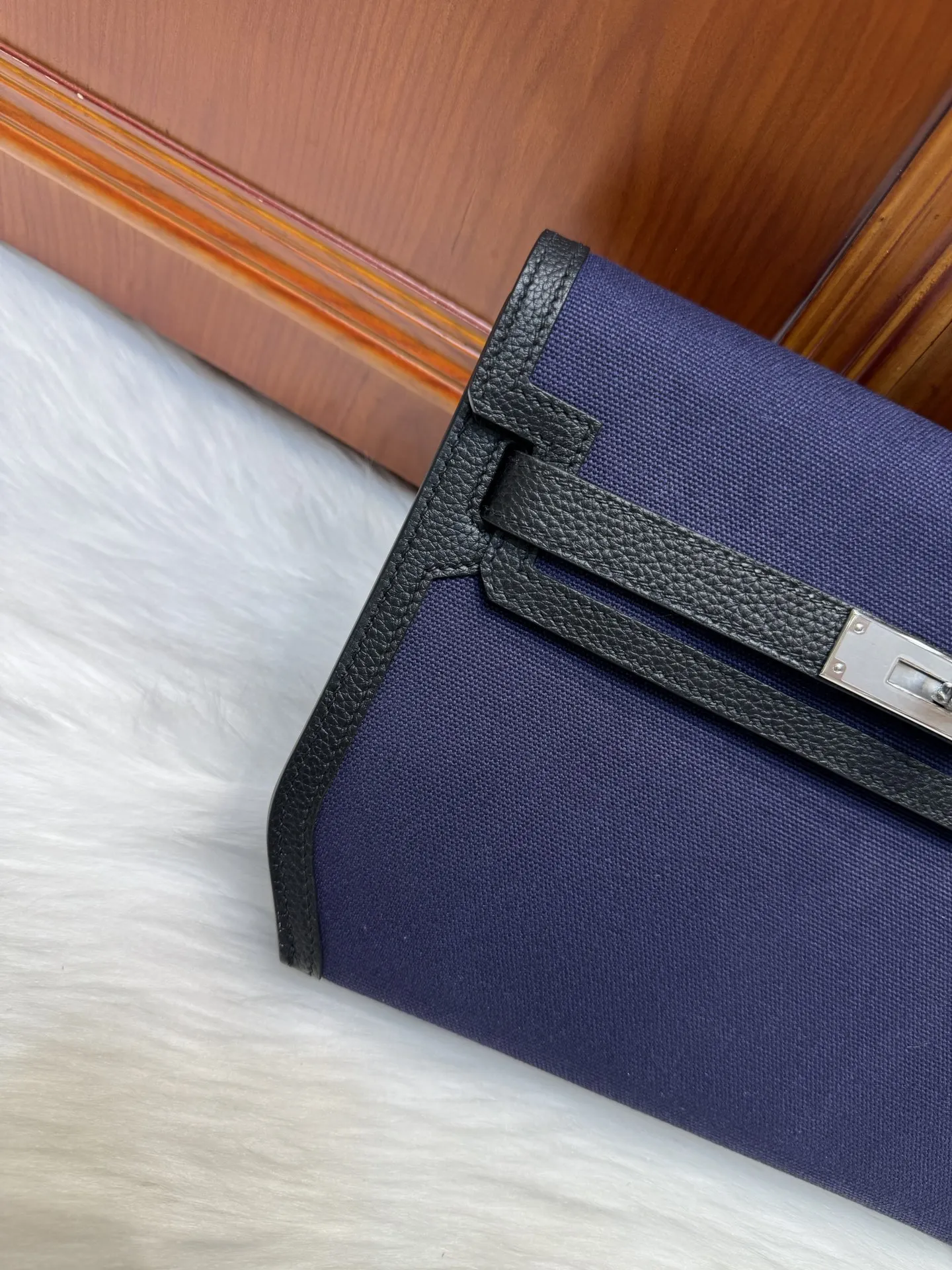 Semi-handmade and super trendy, the Kelly Depeches is newly designed with a canvas and leather combination. This clever pairing offers a refreshing alternative to the all-leather style. It can be carried by hand or worn over the shoulder with a Kelly strap, making it a versatile choice for both men and women. Size: 25cm