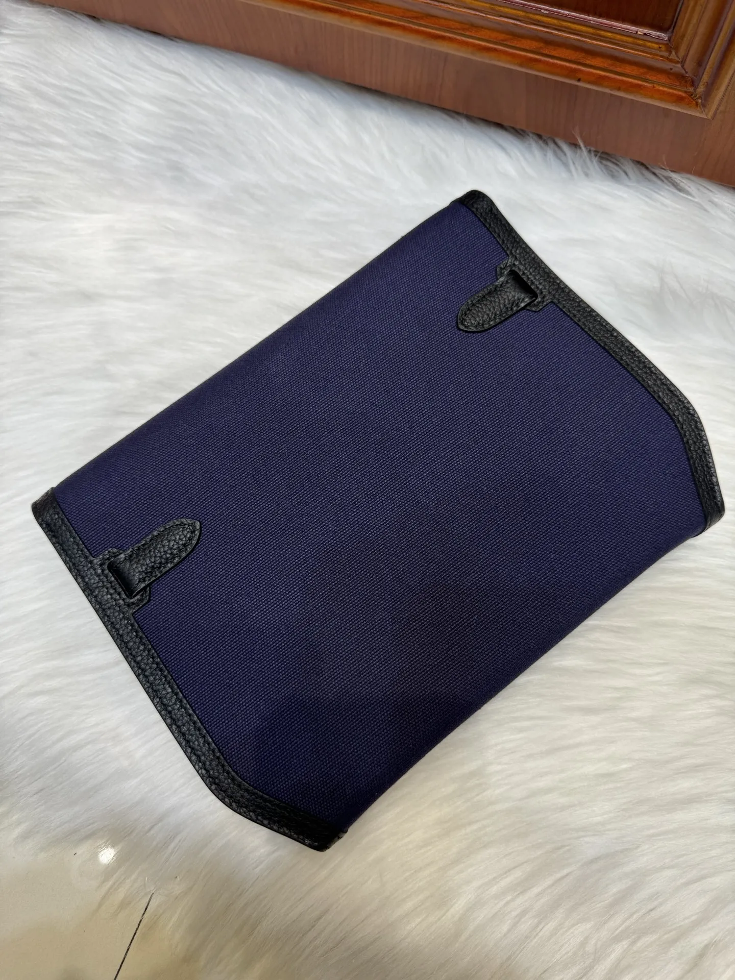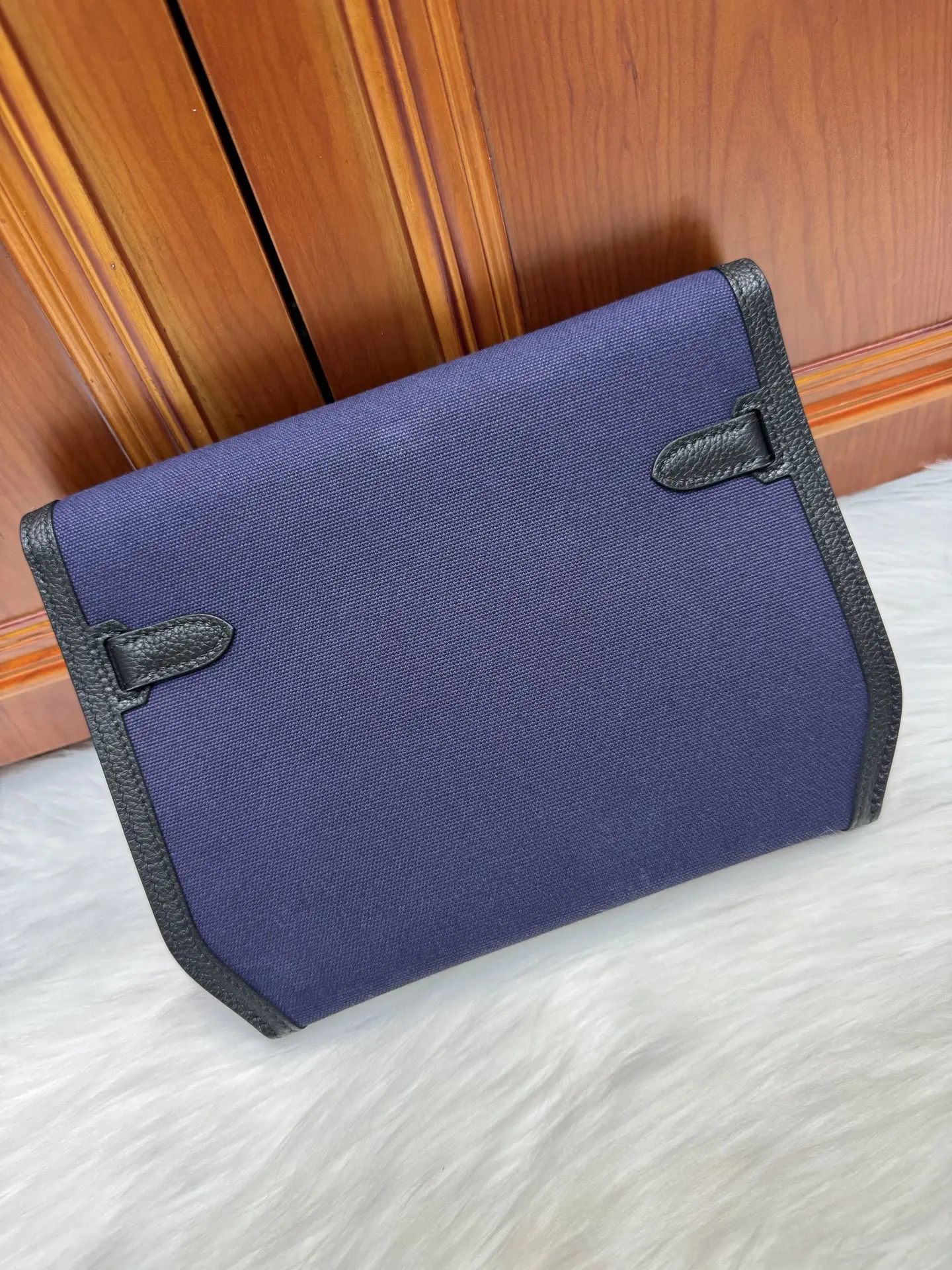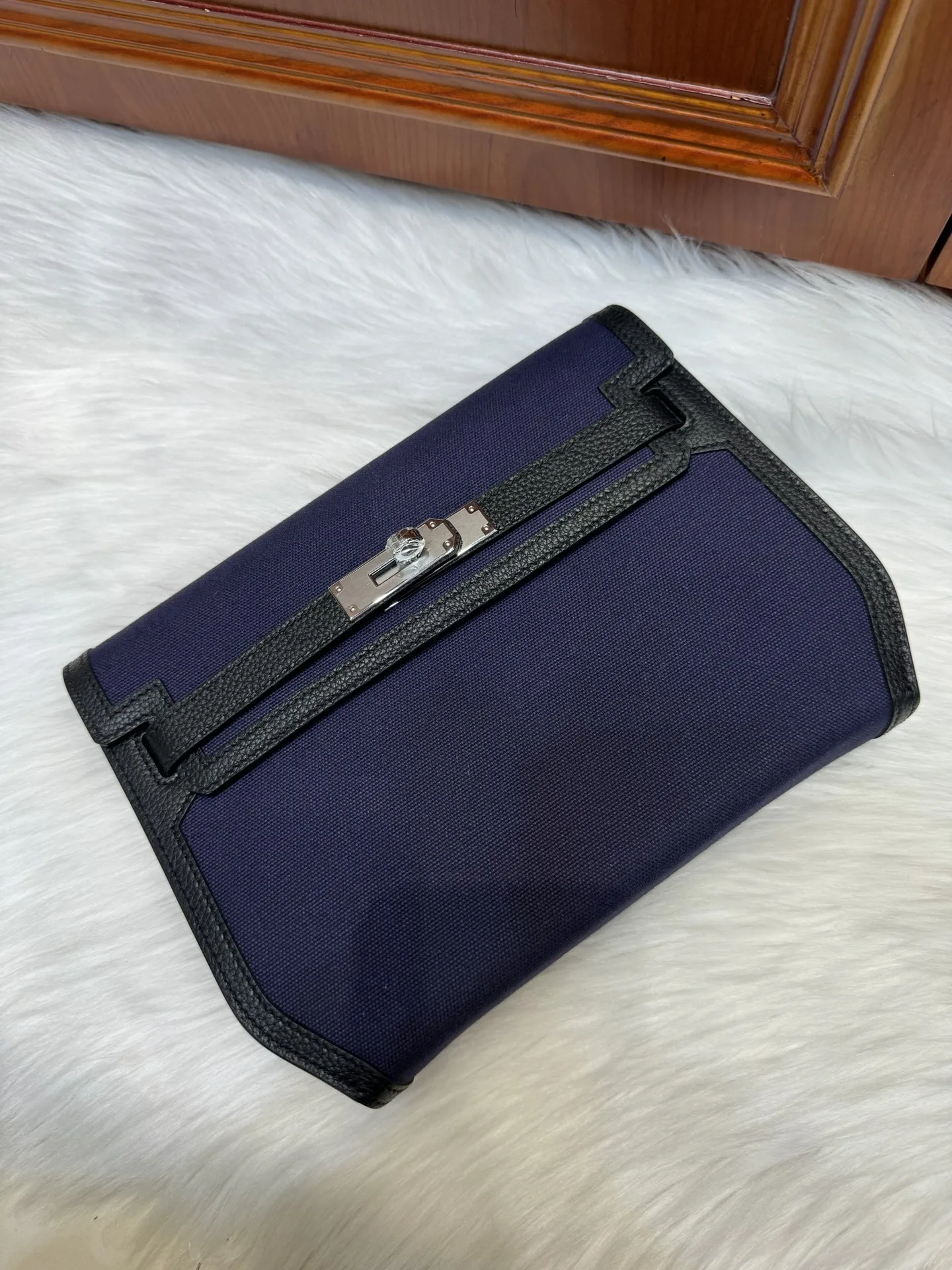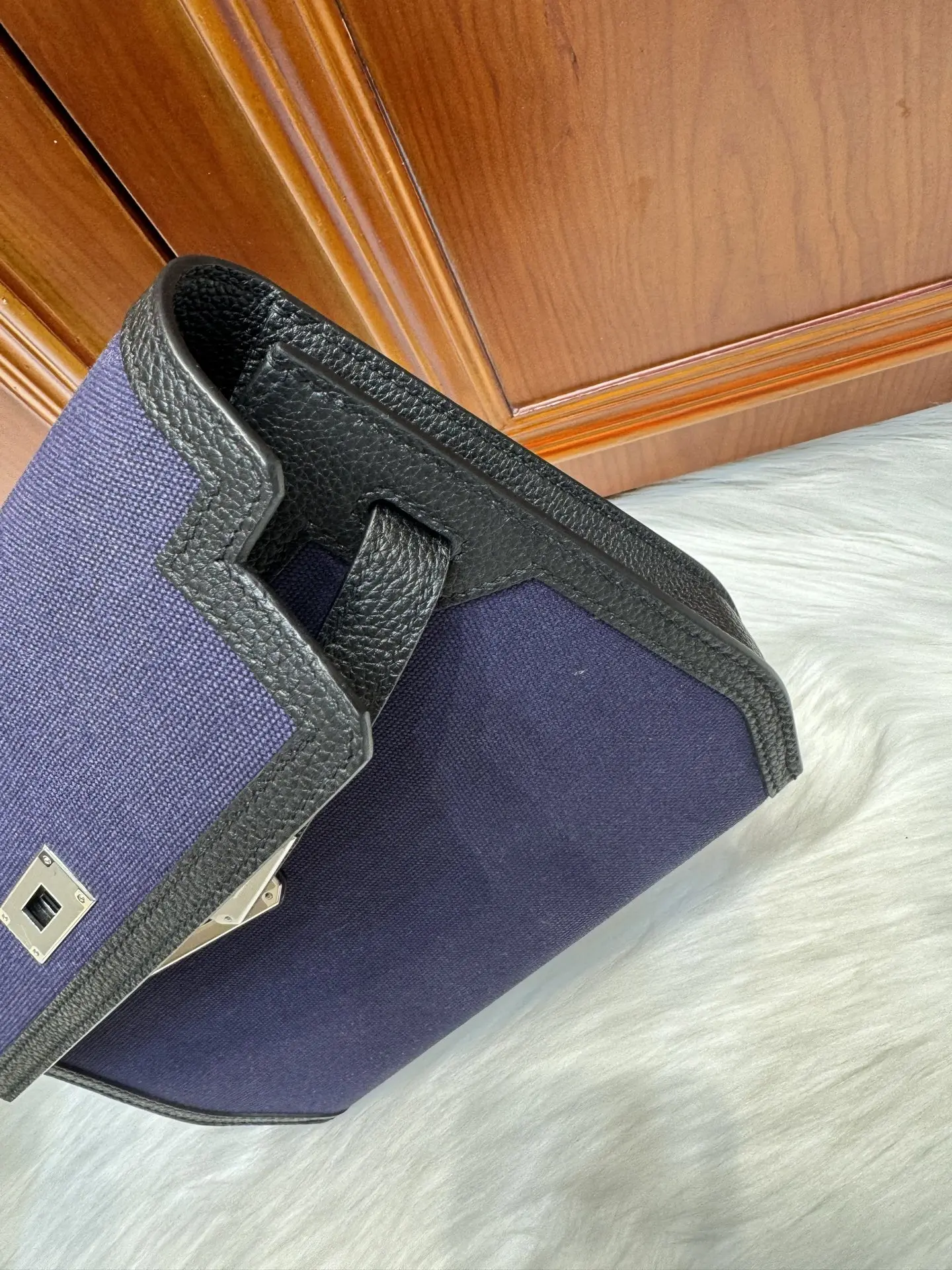 Semi-handmade and super trendy, the Kelly Depeches is newly designed with a canvas and leather combination. This clever pairing offers a refreshing alternative to the all-leather style. It can be carried by hand or worn over the shoulder with a Kelly strap, making it a versatile choice for both men and women. Size: 25cm