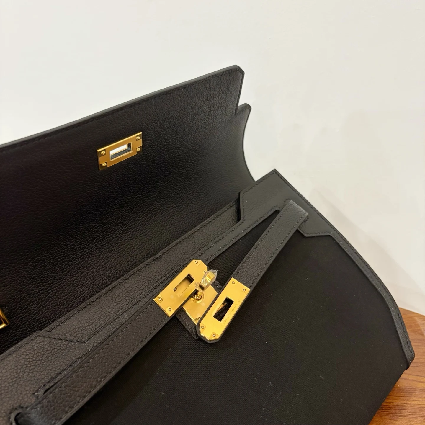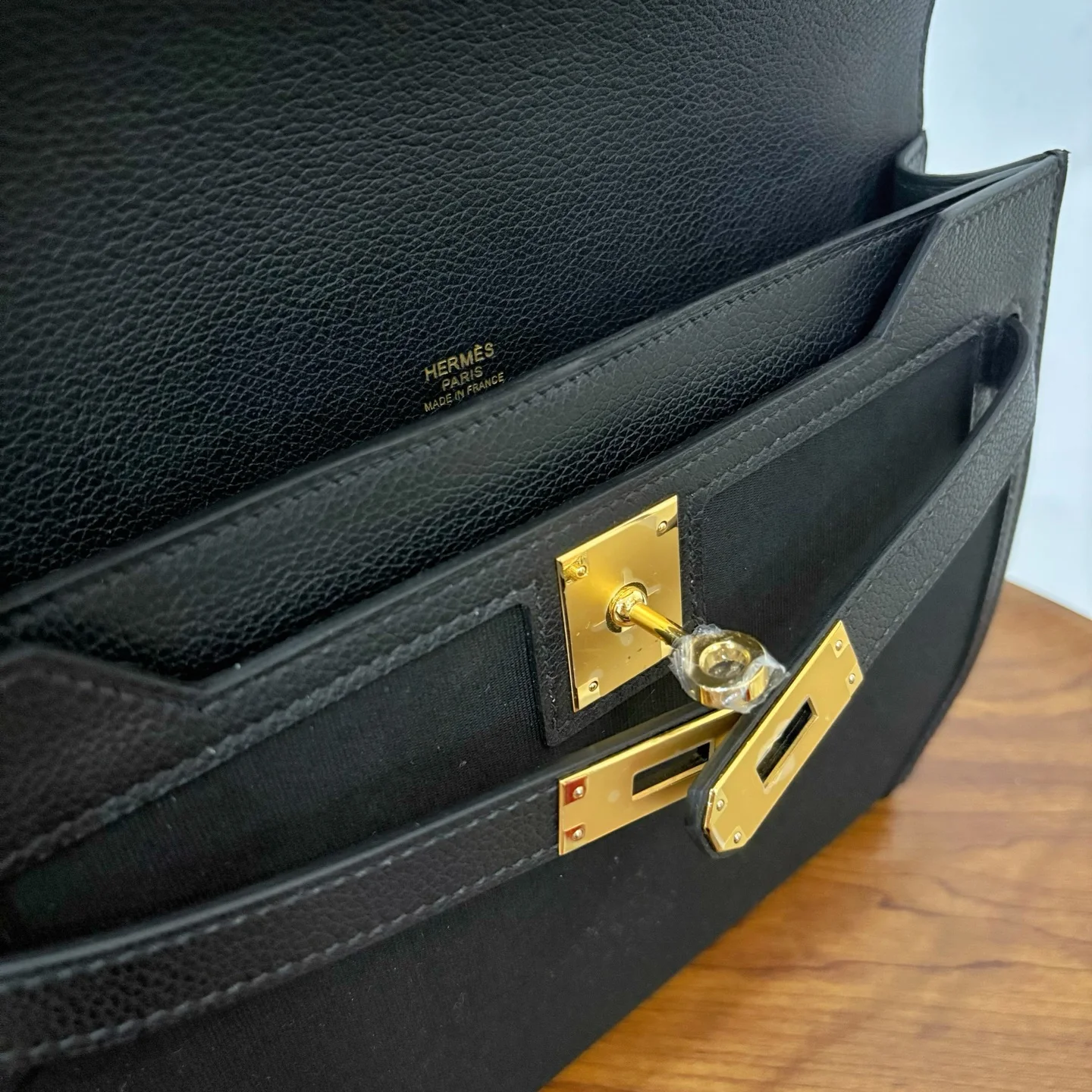 Semi-handmade and super trendy, the Kelly Depeches is newly designed with a canvas and leather combination. This clever pairing offers a refreshing alternative to the all-leather style. It can be carried by hand or worn over the shoulder with a Kelly strap, making it a versatile choice for both men and women. Size: 25cm