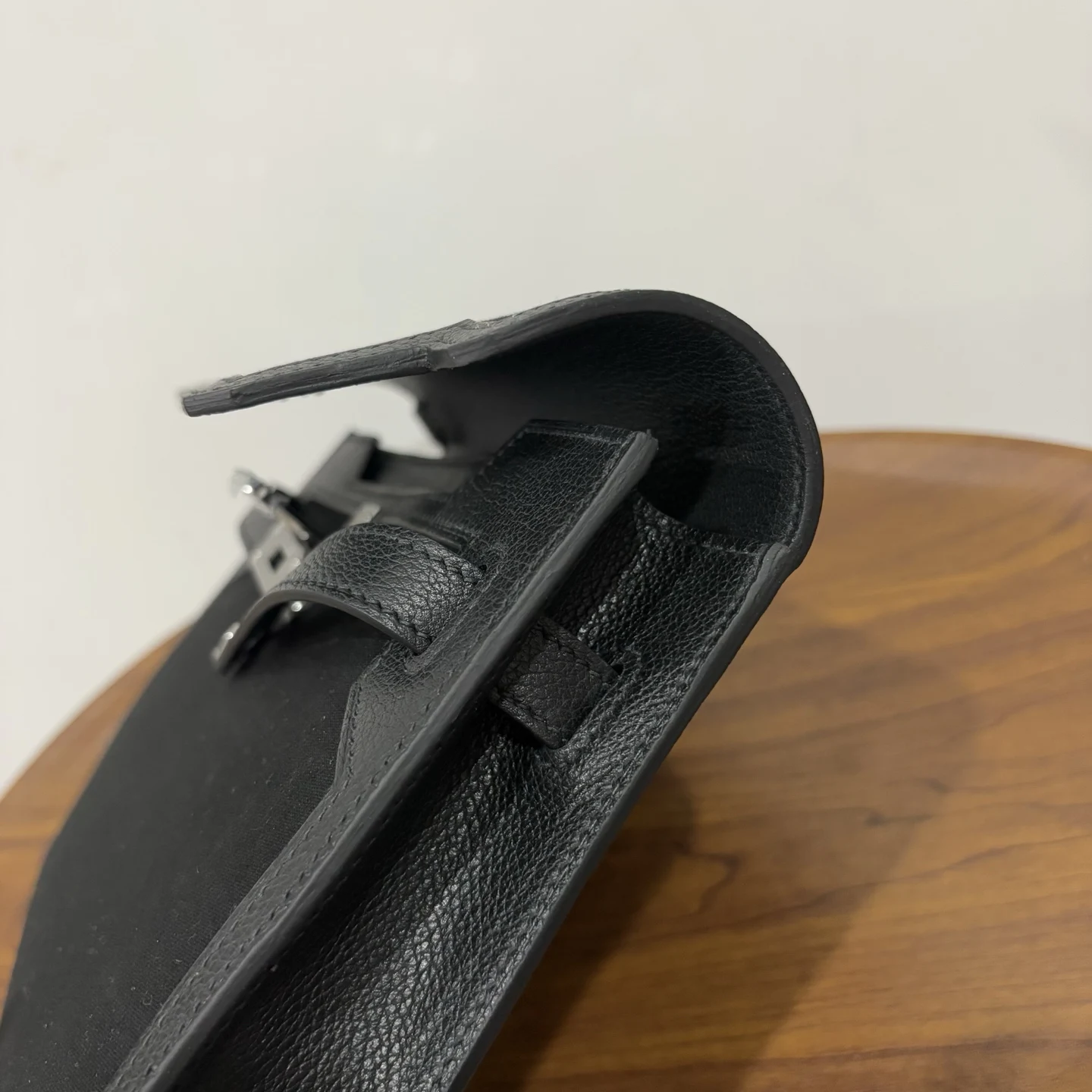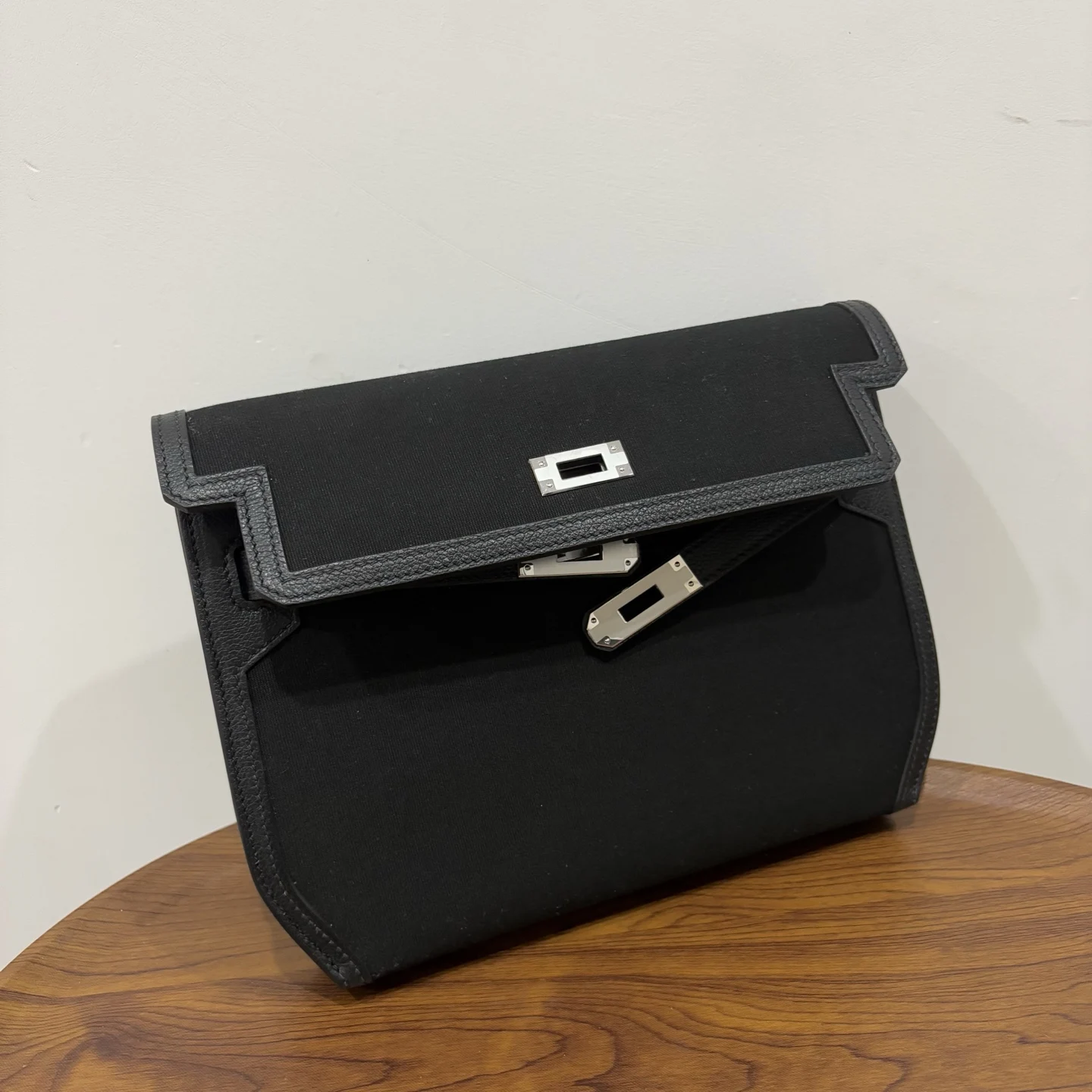 Semi-handmade and super trendy, the Kelly Depeches is newly designed with a canvas and leather combination. This clever pairing offers a refreshing alternative to the all-leather style. It can be carried by hand or worn over the shoulder with a Kelly strap, making it a versatile choice for both men and women. Size: 25cm