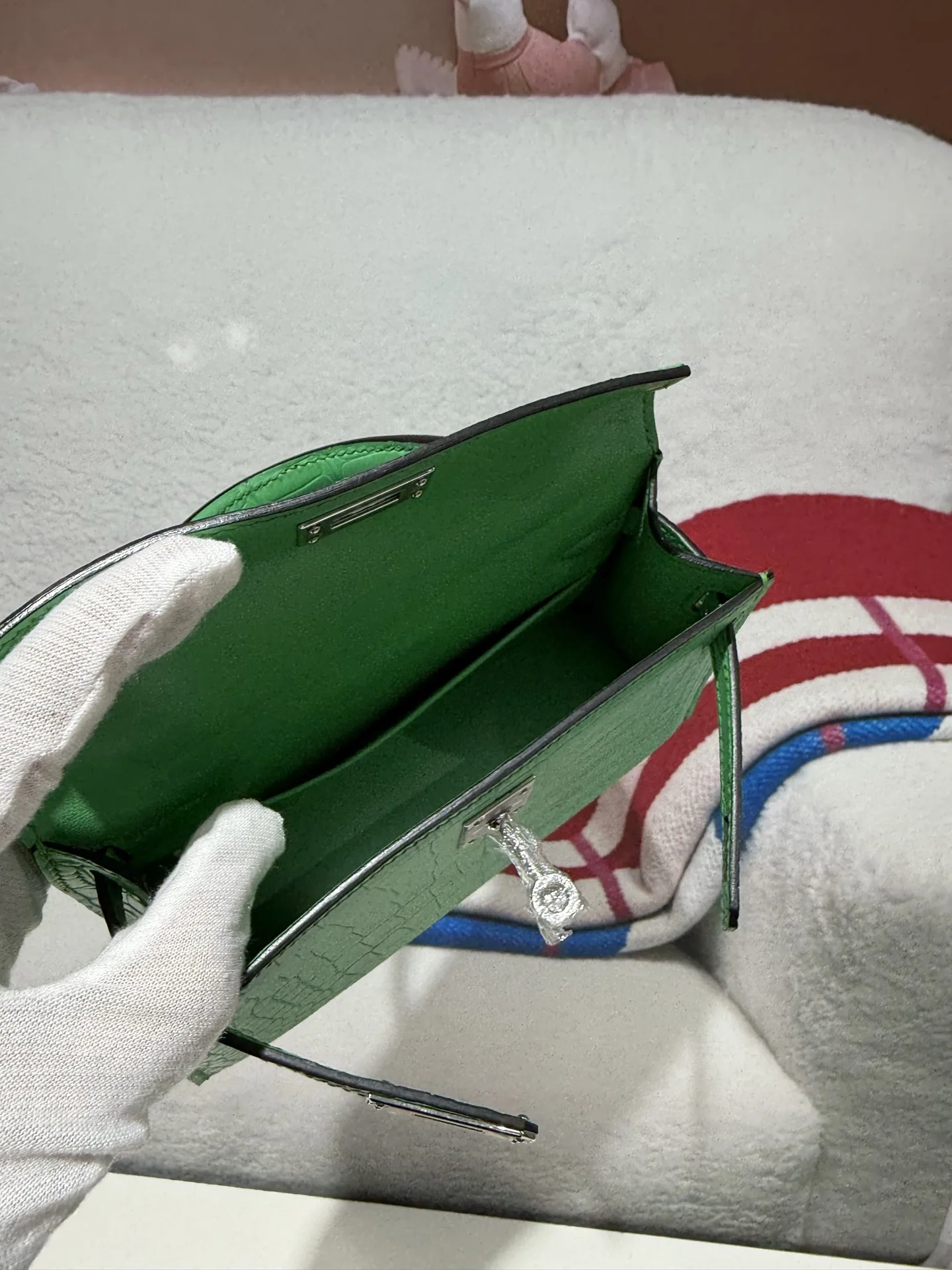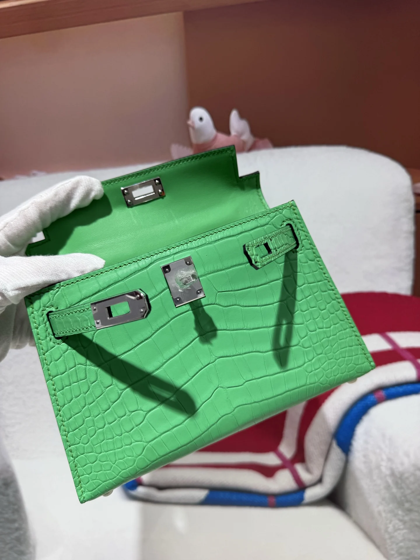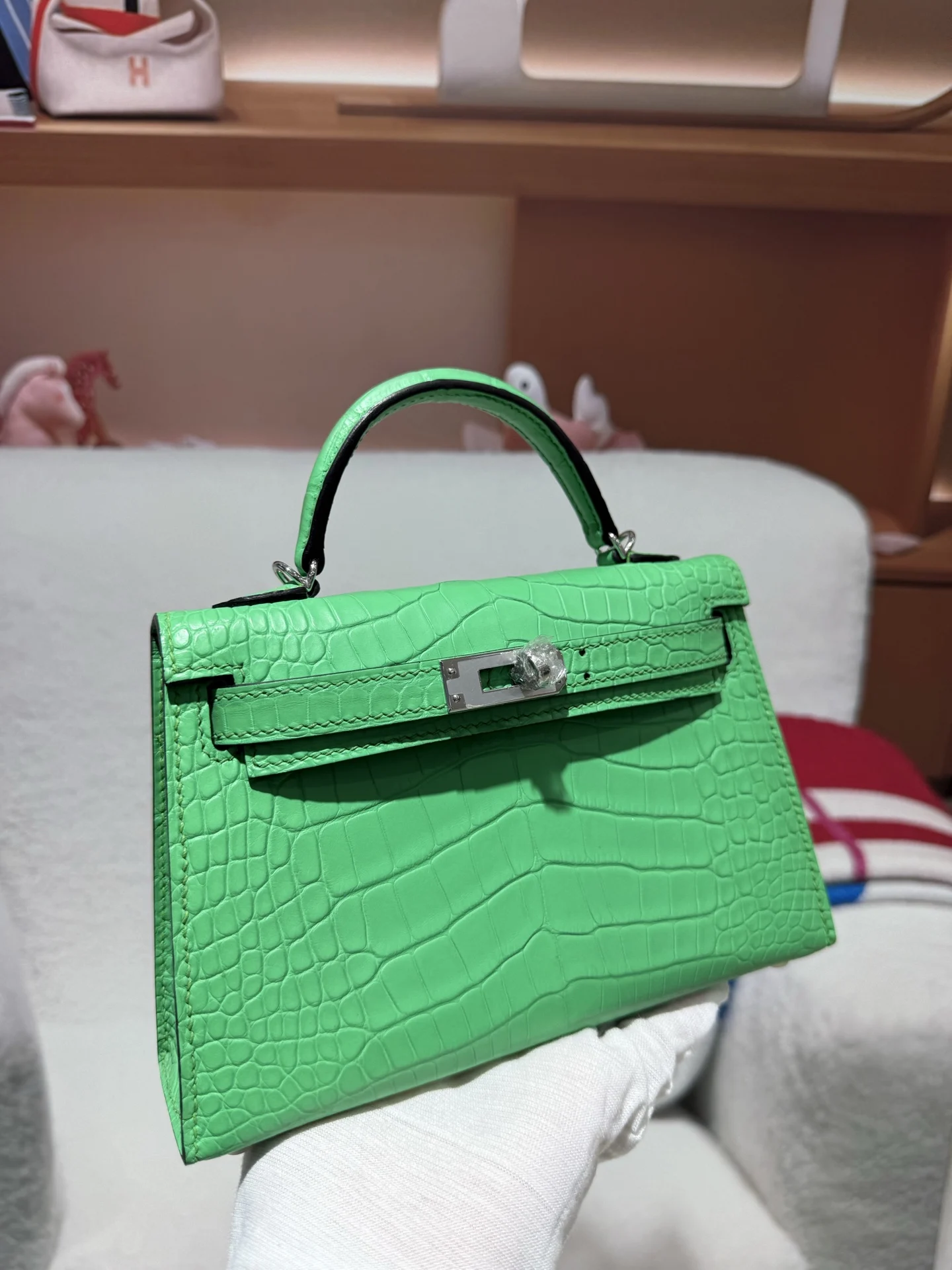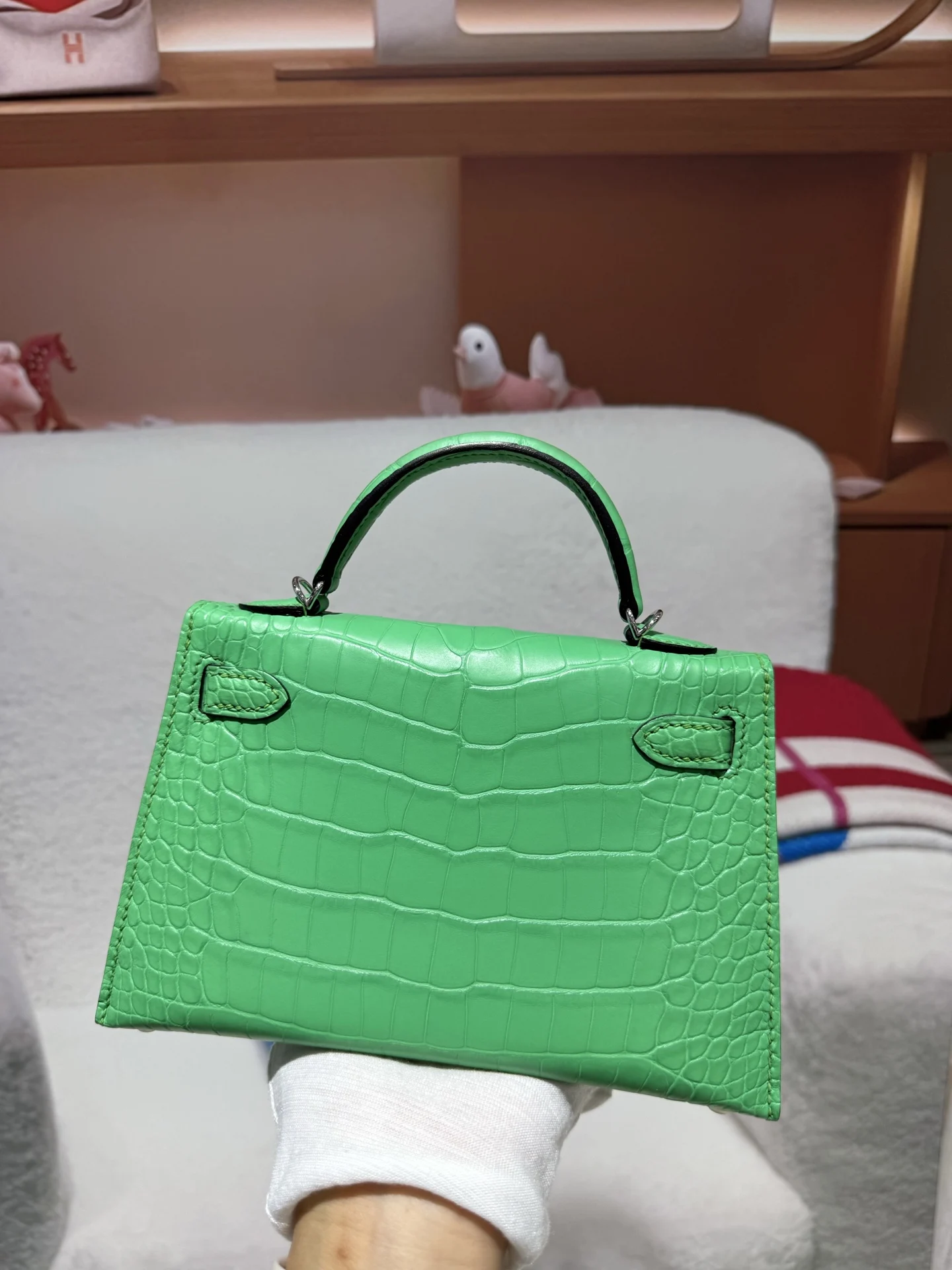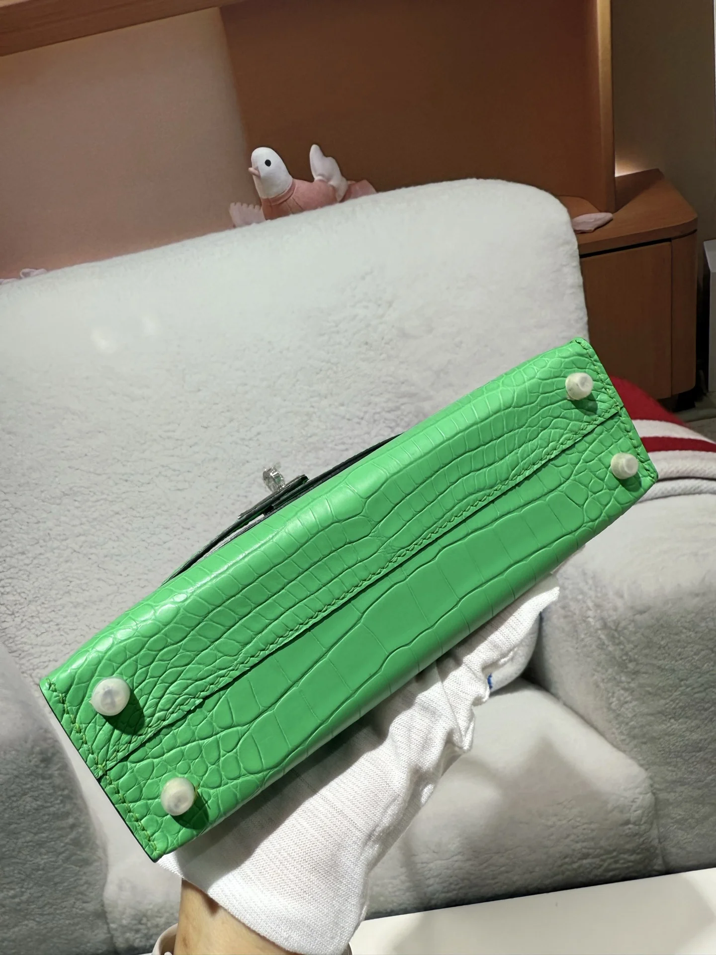 Kelly II 19 cm Imported American Matte Alligator Leather, Comic Green, Silver Hardware, Hand-stitched, Exact Replica of Boutique American Alligator