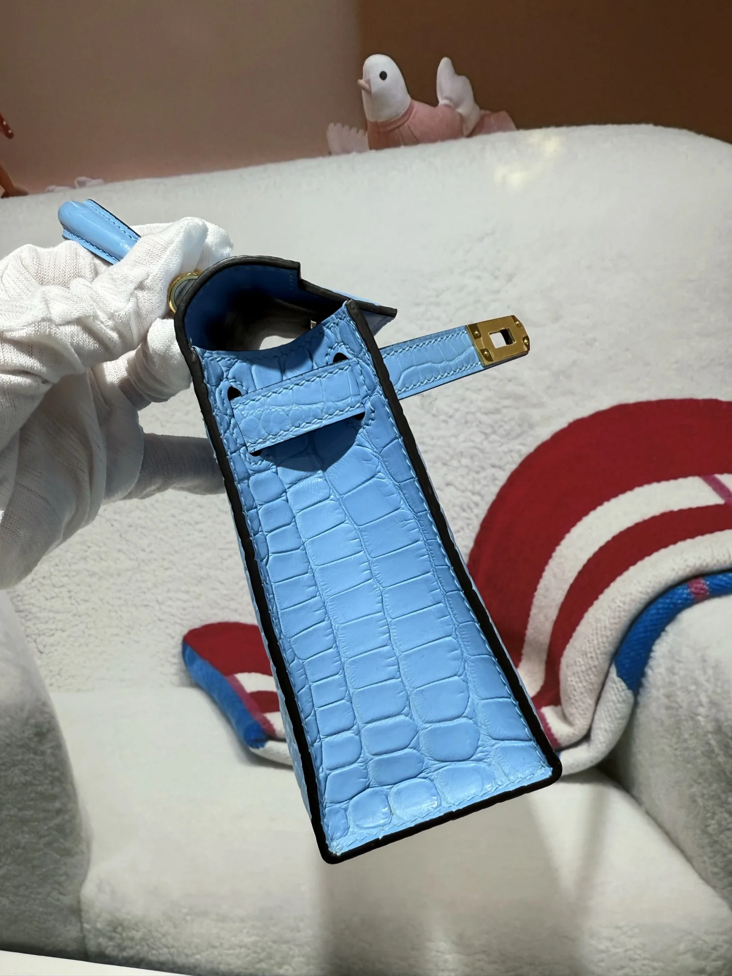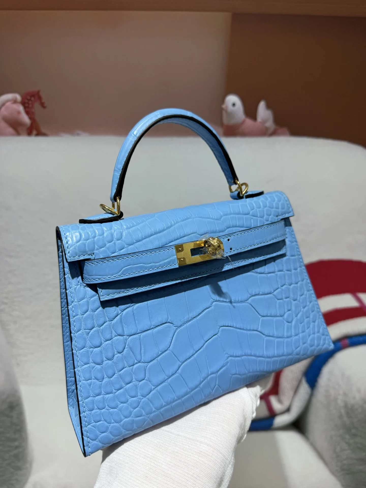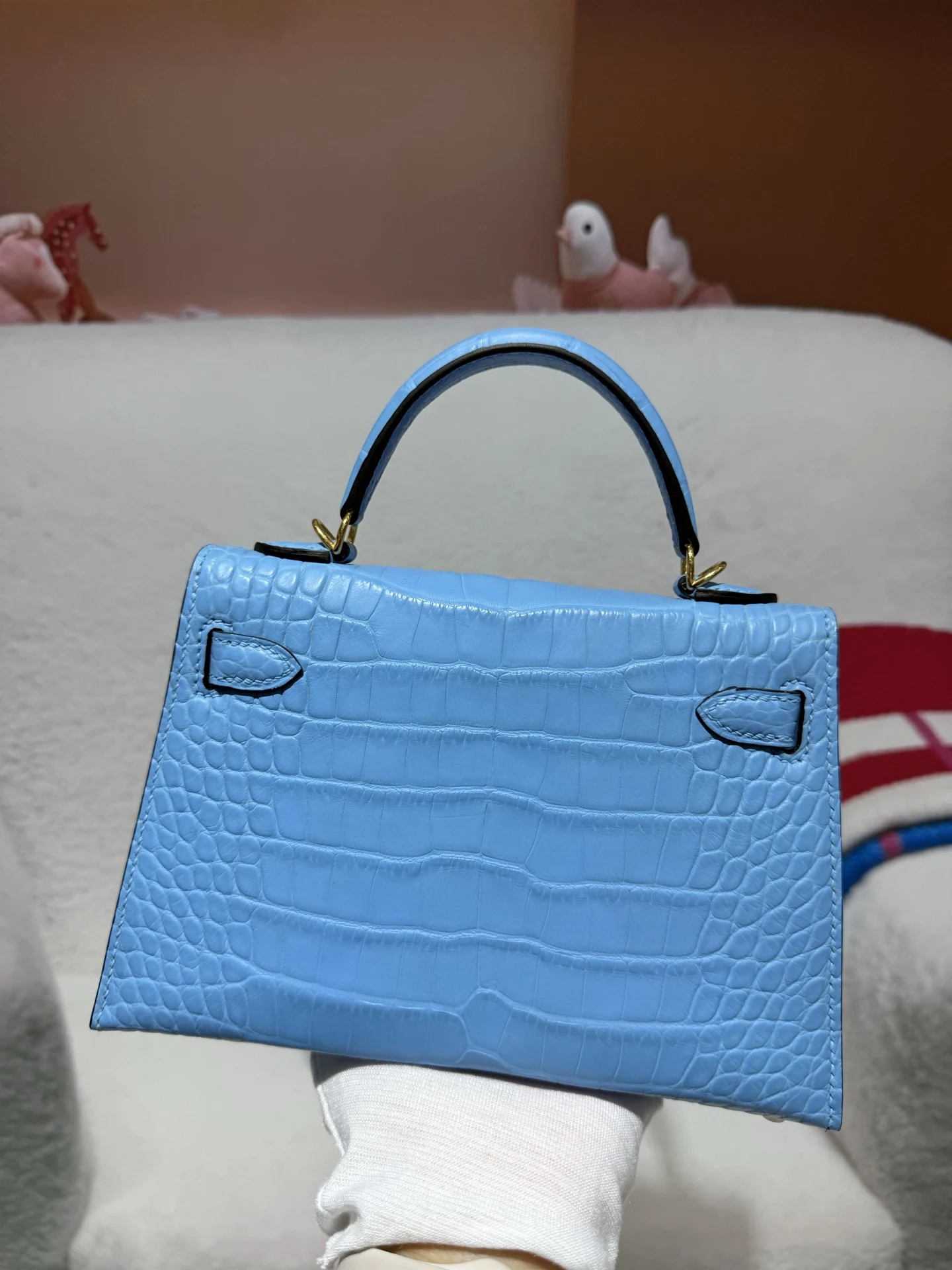 Kelly II 19cm Imported American Alligator Matte Leather in Blue with Gold Hardware, Hand-stitched. True to Original American Alligator.