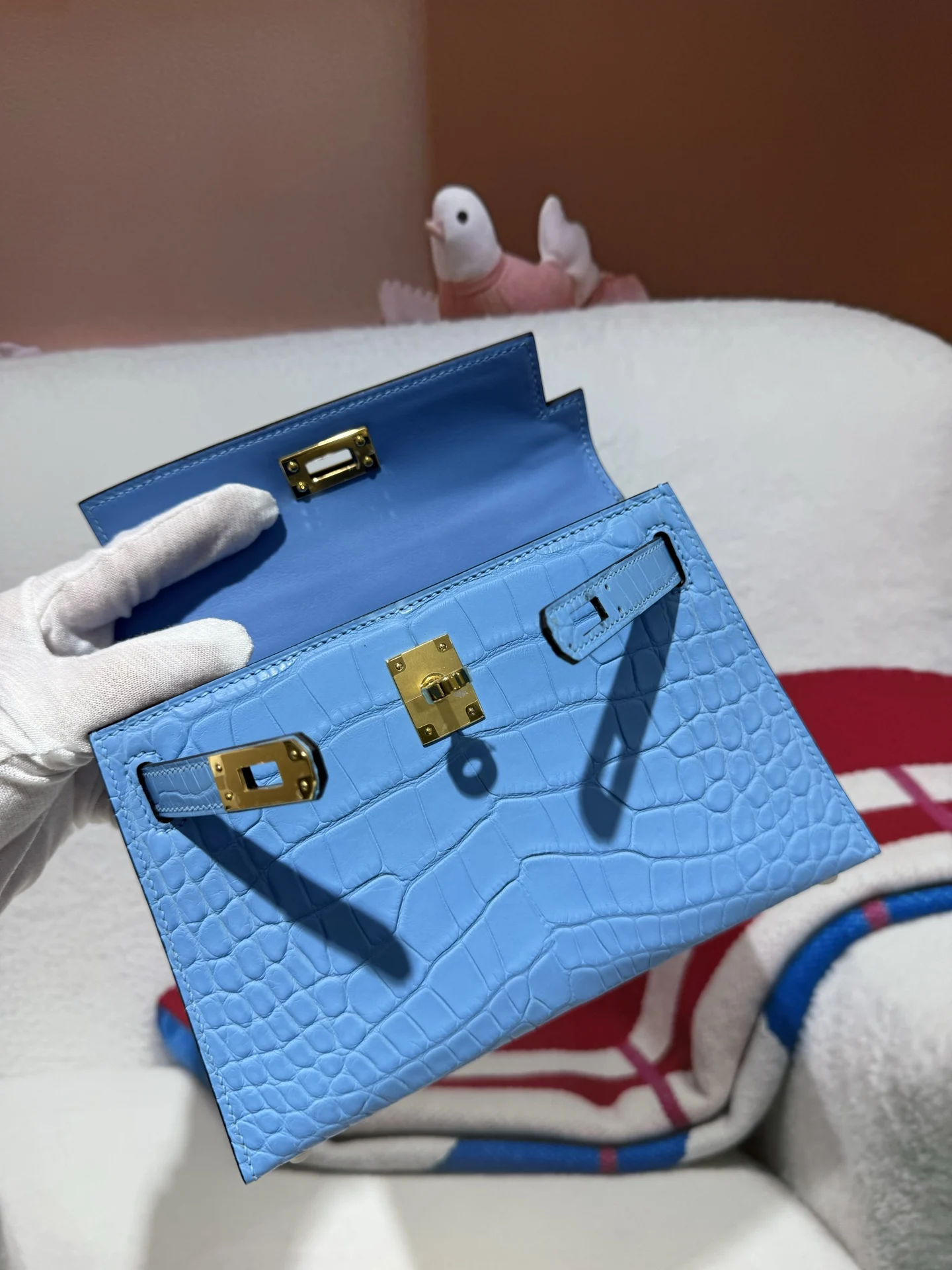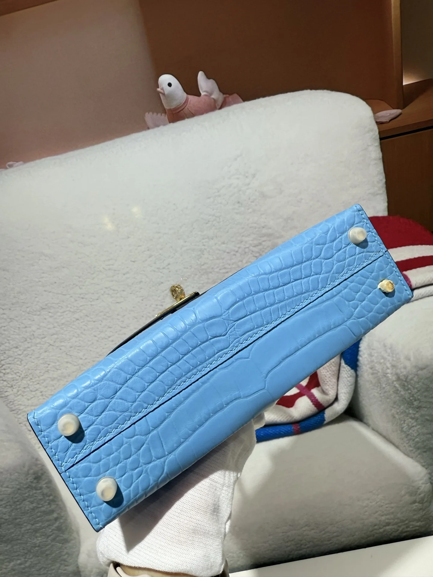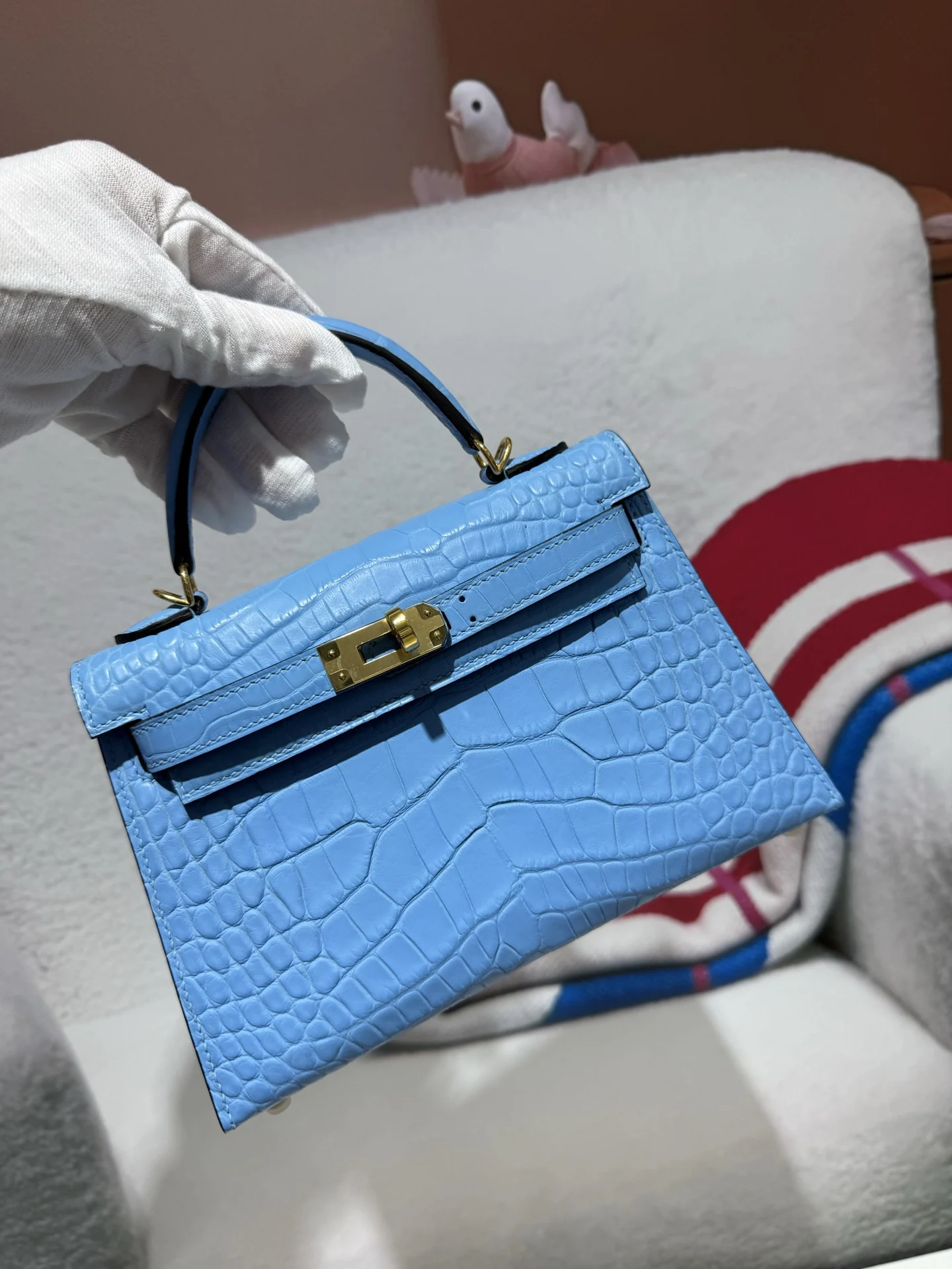 Kelly II 19cm Imported American Alligator Matte Leather in Blue with Gold Hardware, Hand-stitched. True to Original American Alligator.