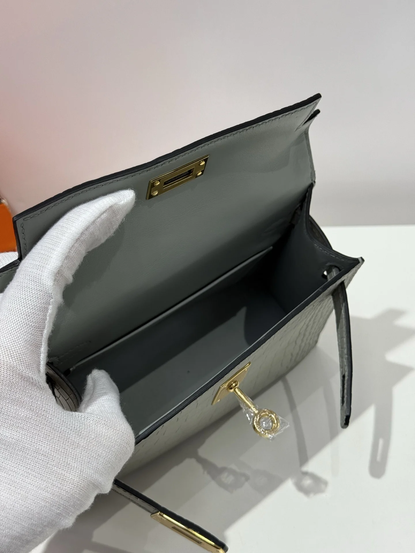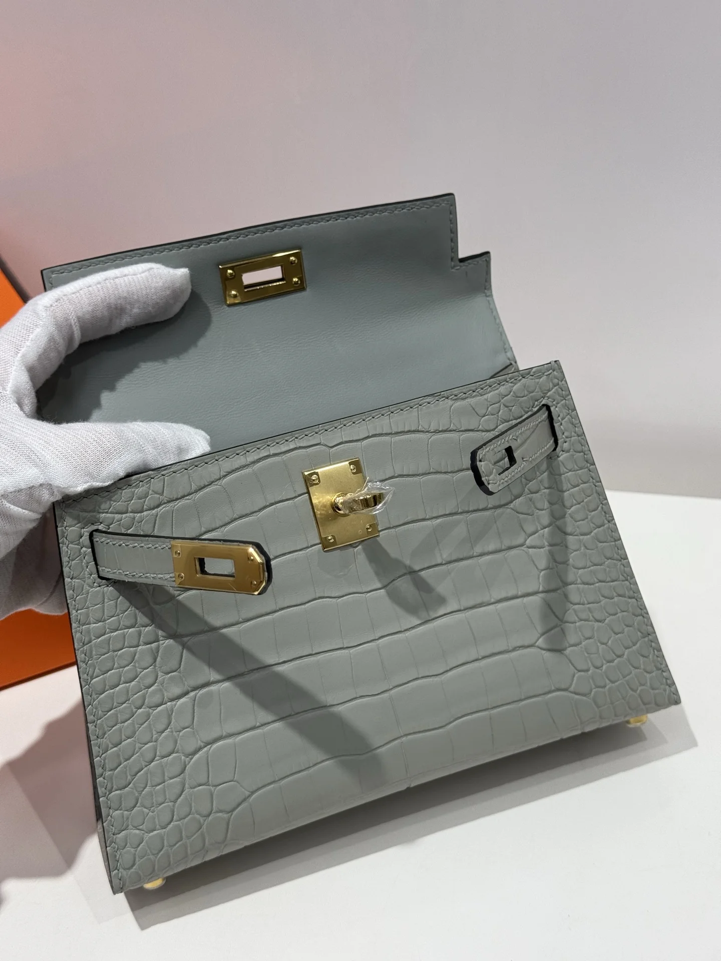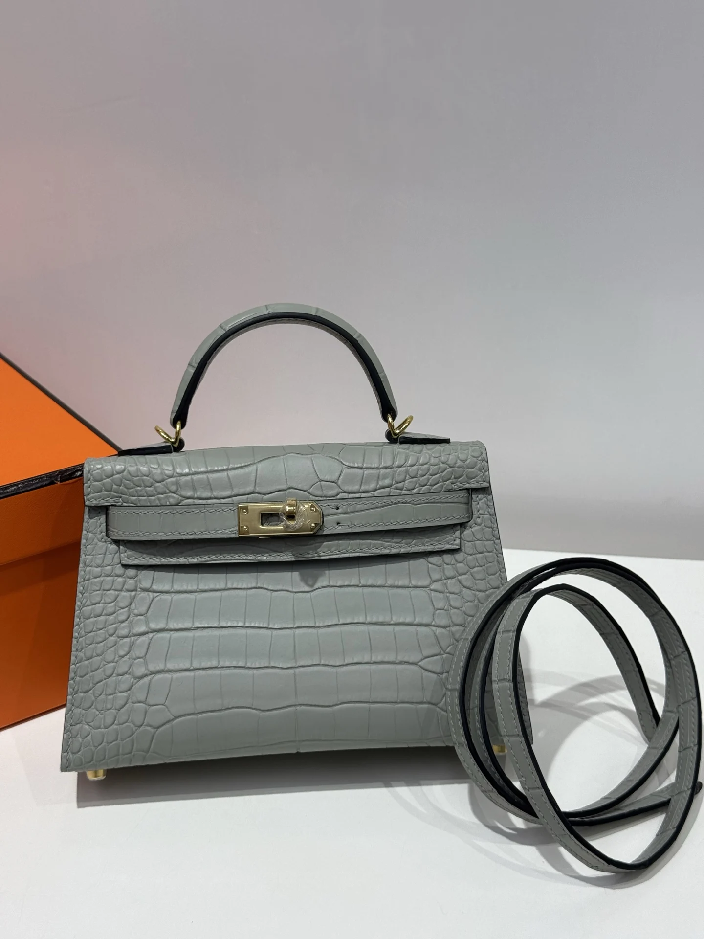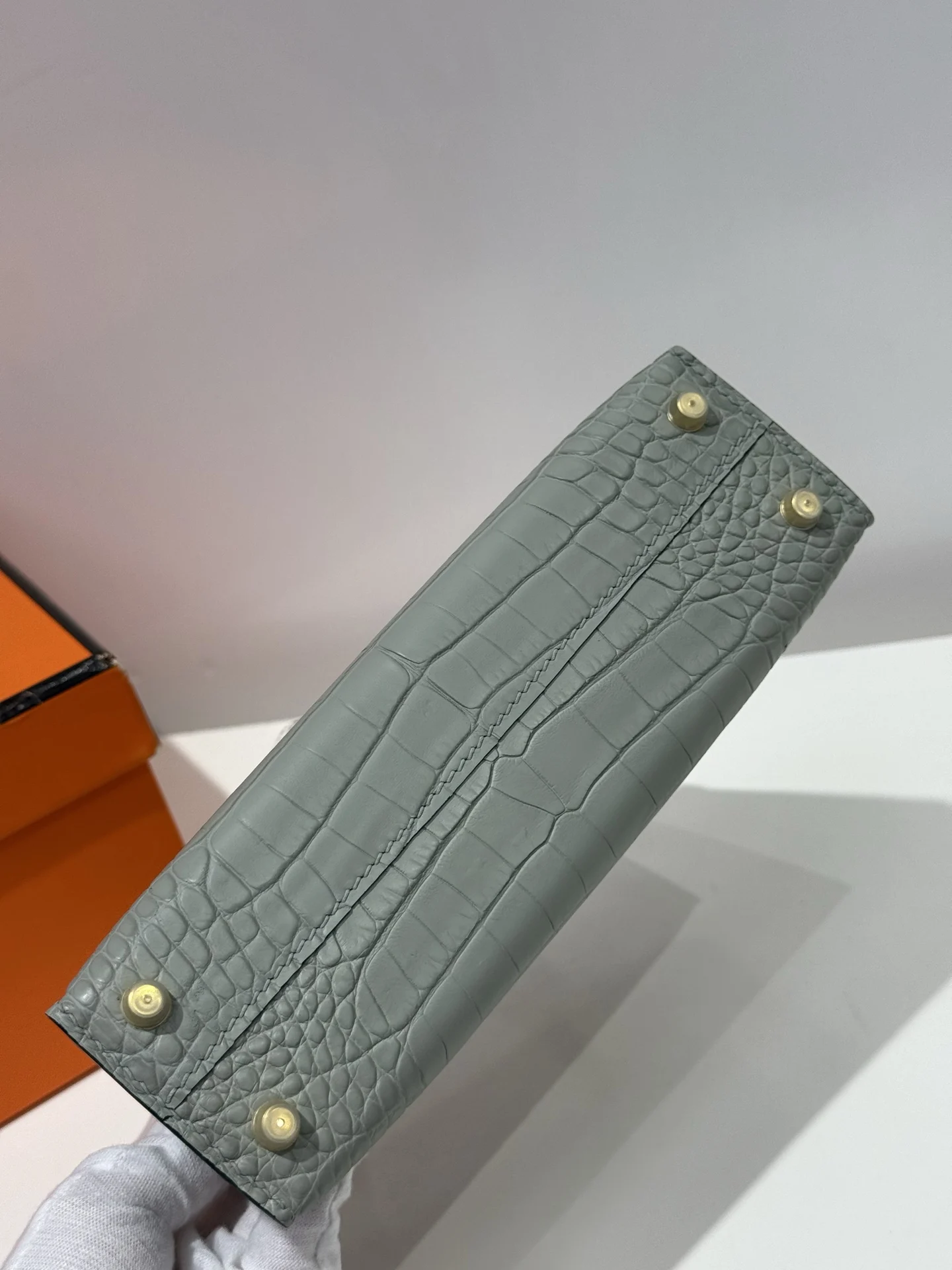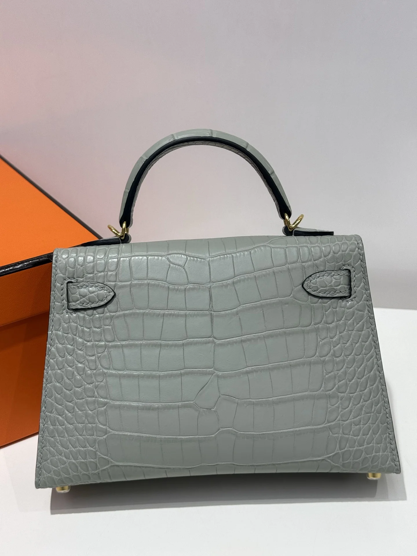 Kelly II 19cm, imported American alligator with matte finish, 80 pearl grey, hand-stitched with waxed thread, full set of hand-hammered hardware, actual product photos, accurate replica of the authentic American alligator leather.