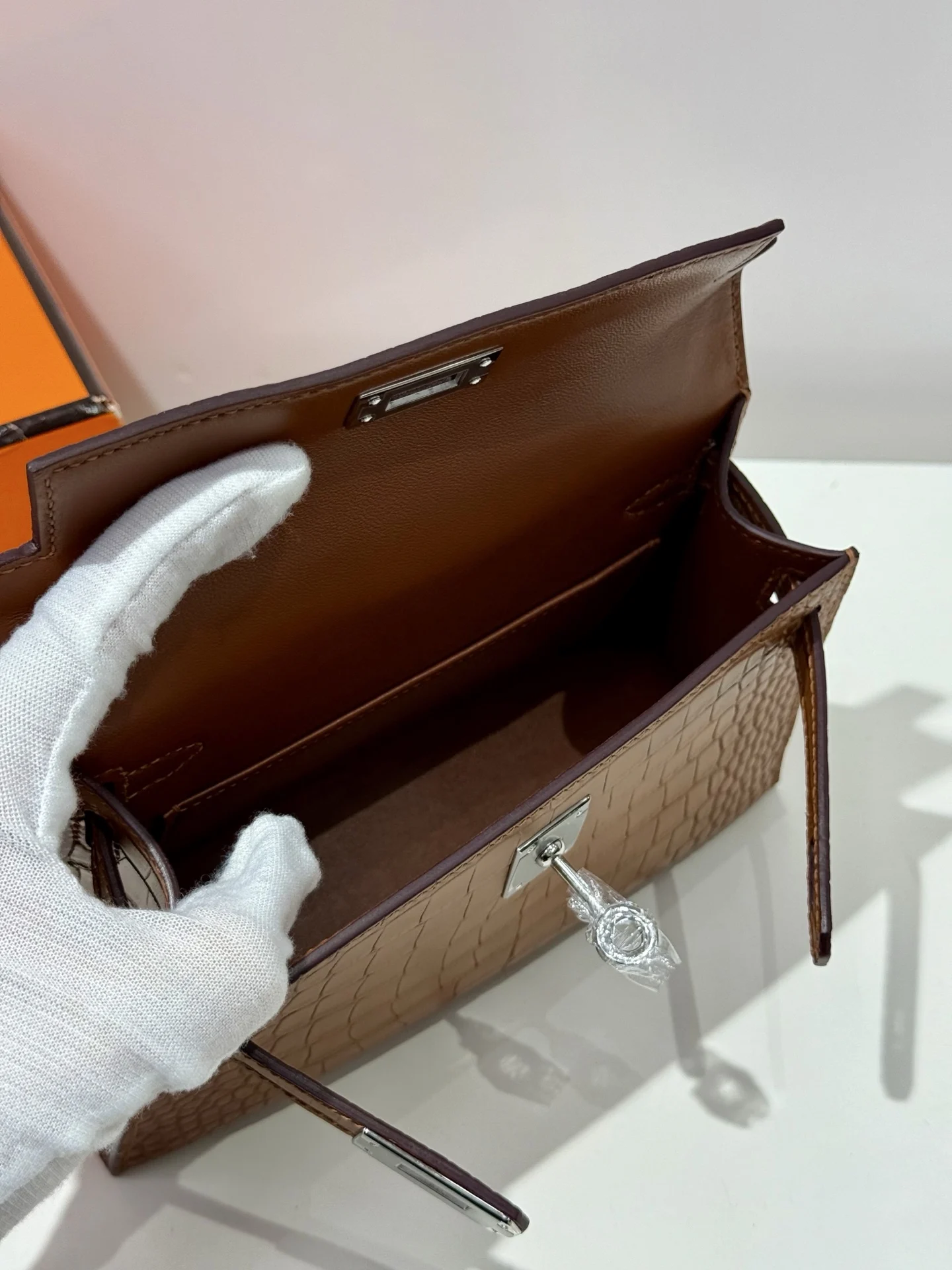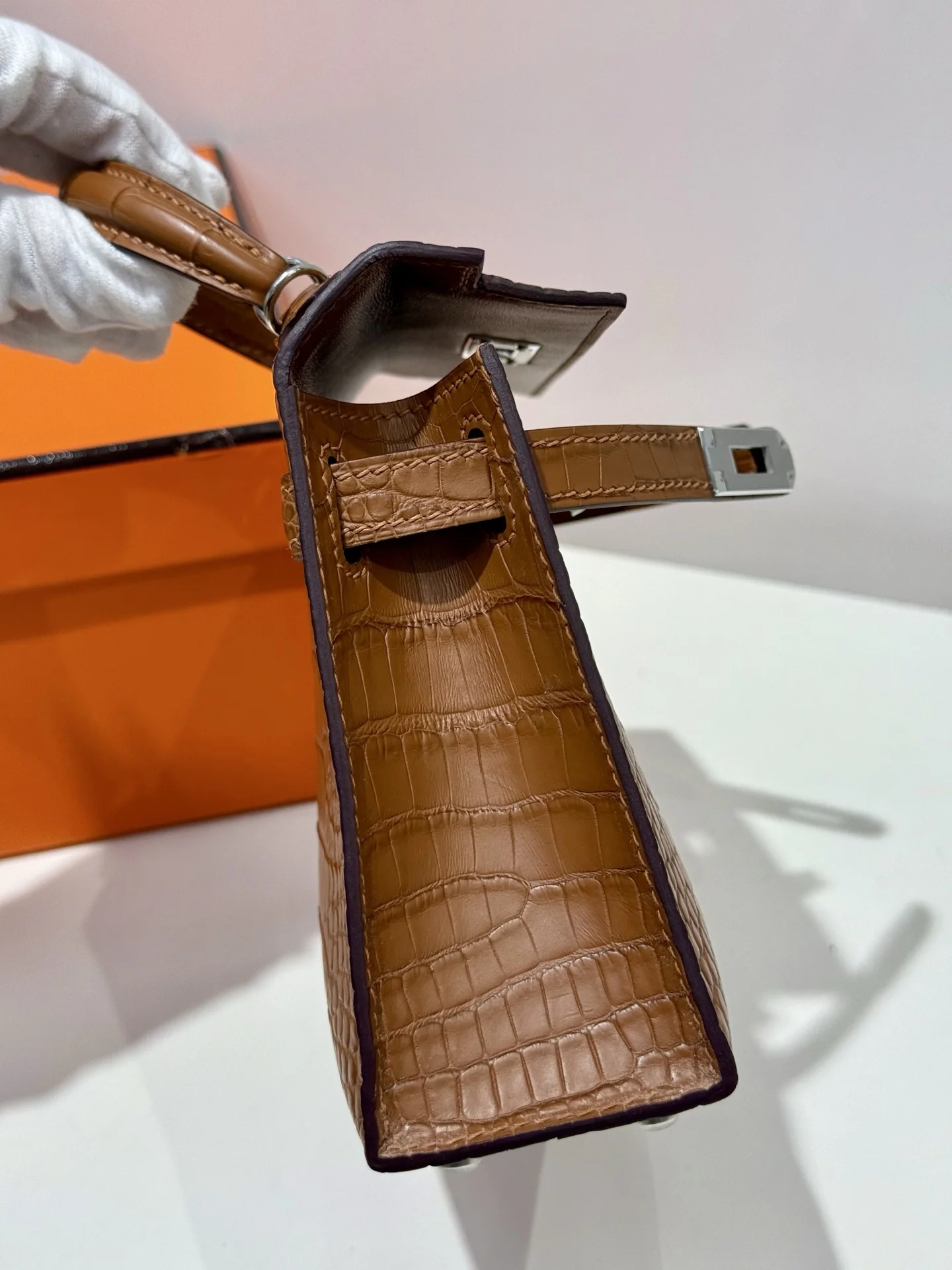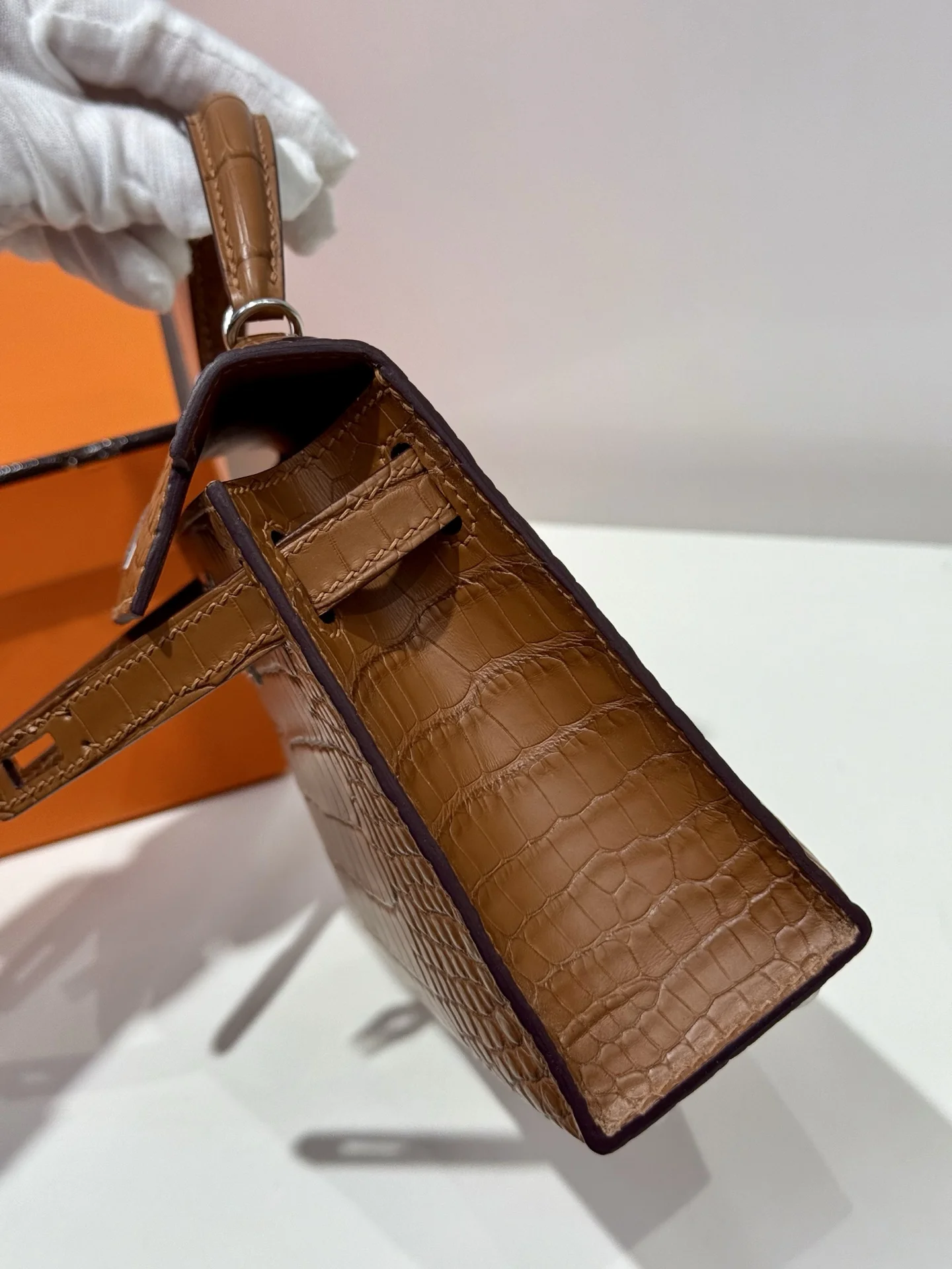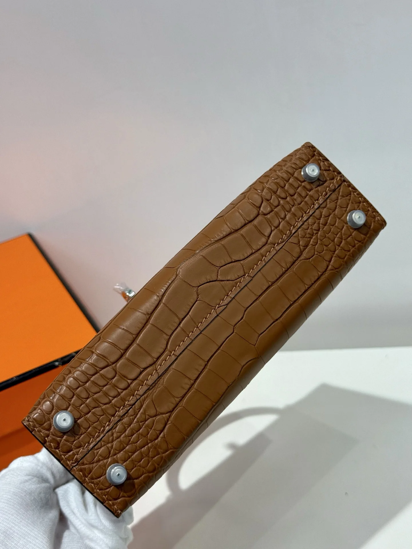 Kelly II 19cm, imported American matte alligator leather, gold brown, hand-stitched with waxed thread, full set of hand-hammered hardware, actual product photos, perfectly matches the authentic American alligator leather.