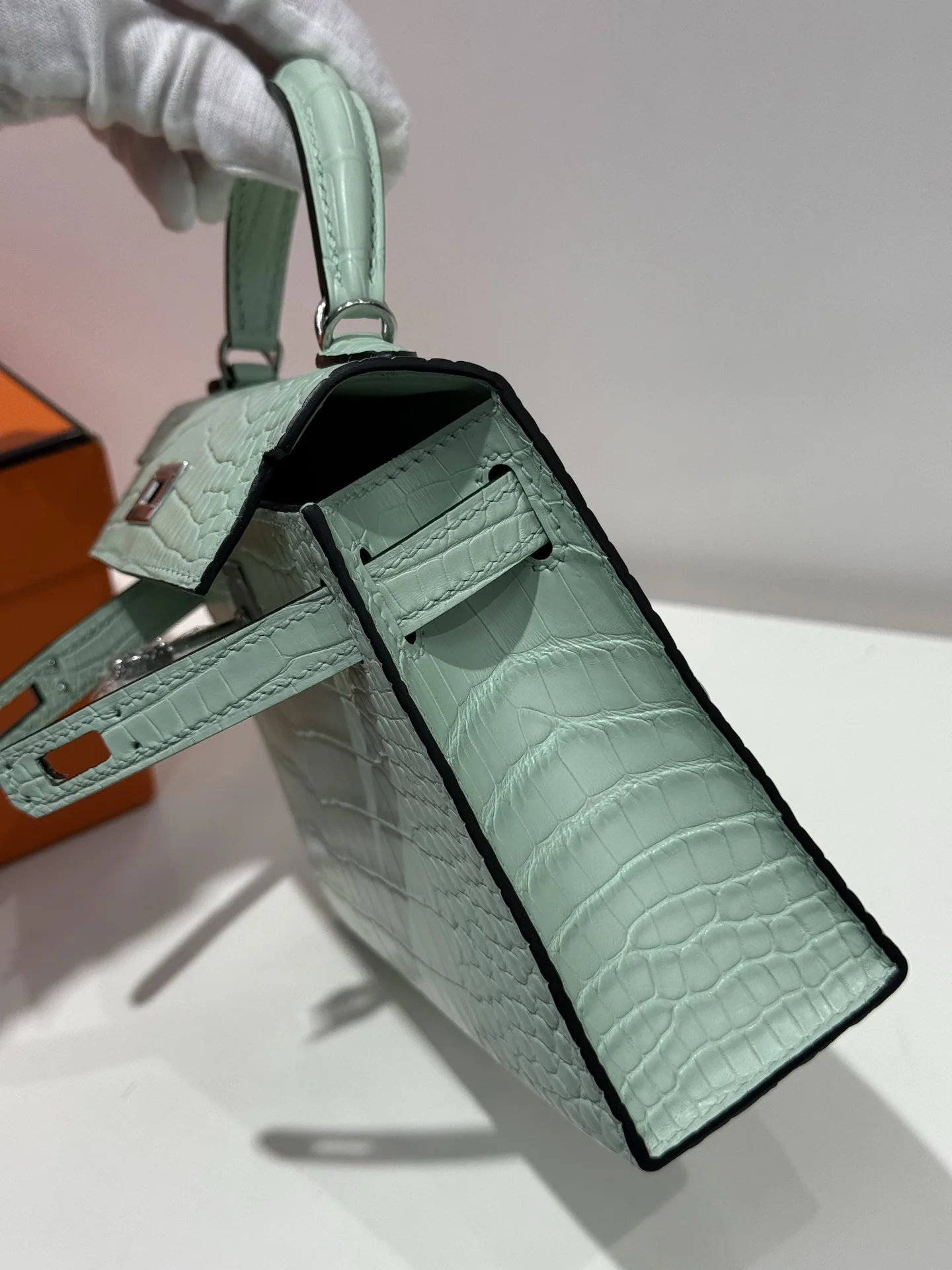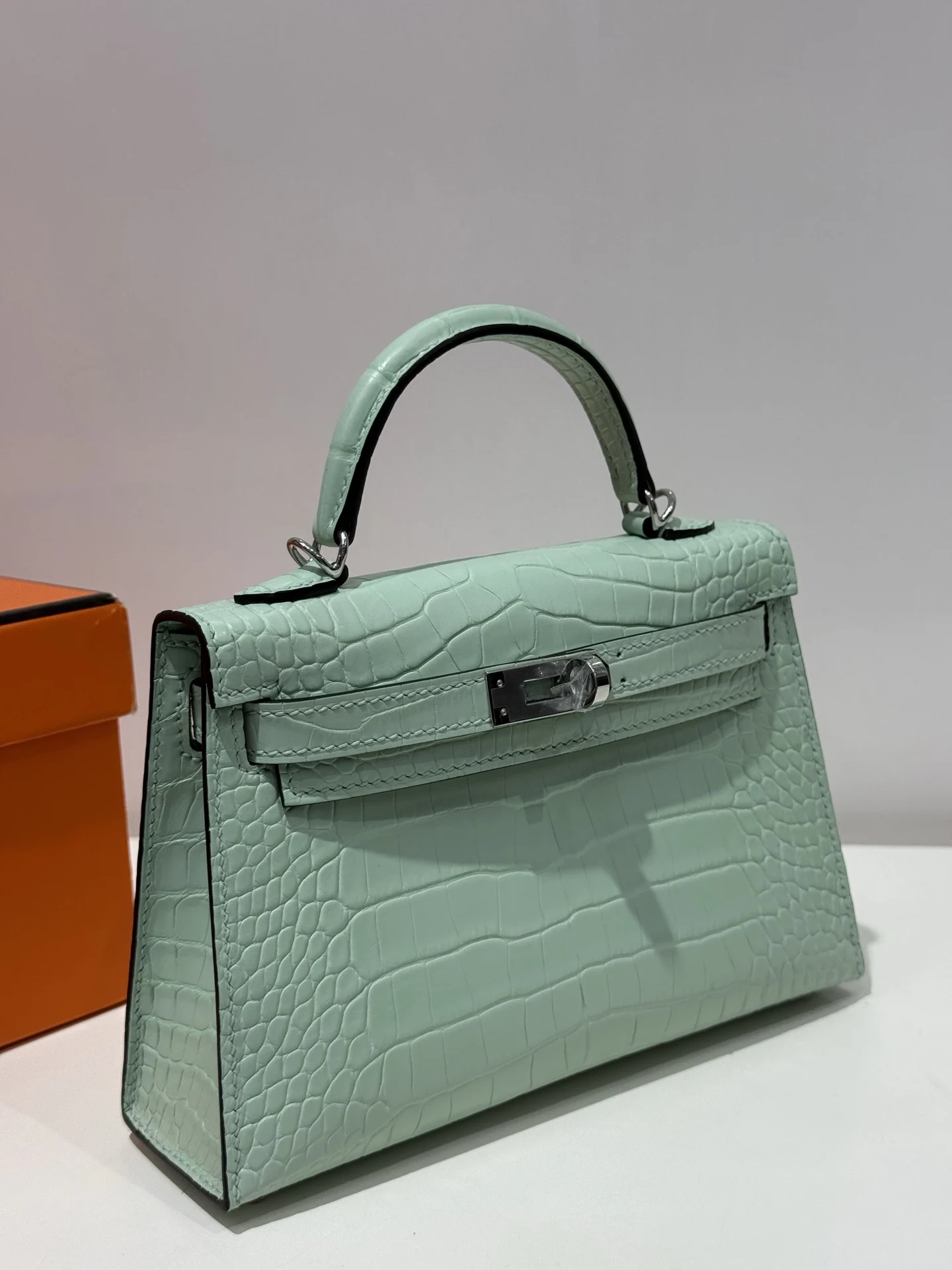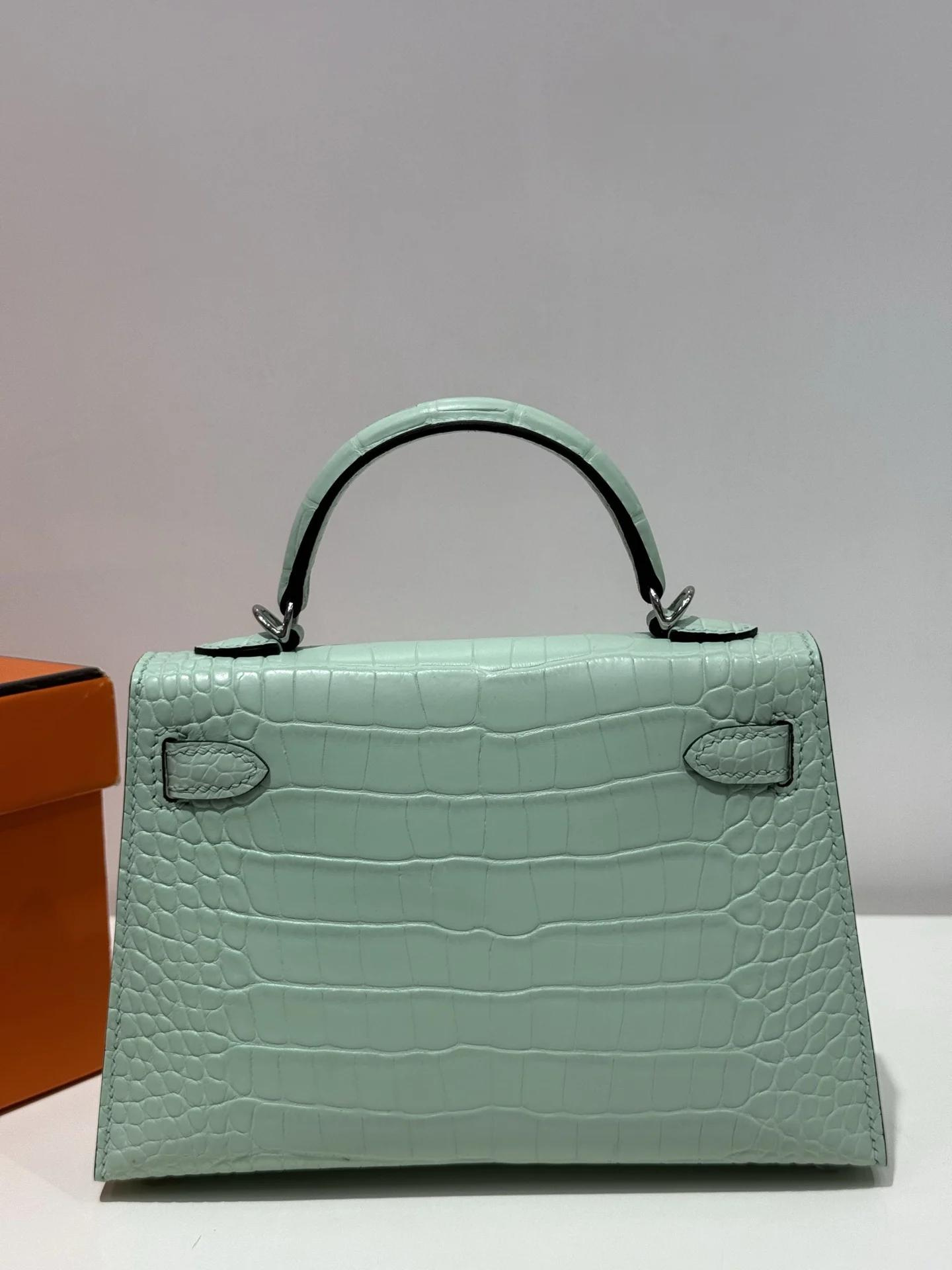 Kelly II 19cm, Imported American Matte Alligator Leather, 6U Mint Green with Silver Hardware, Hand-stitched with Wax Thread, Actual Photos Accurate Reproduction of Boutique American Alligator