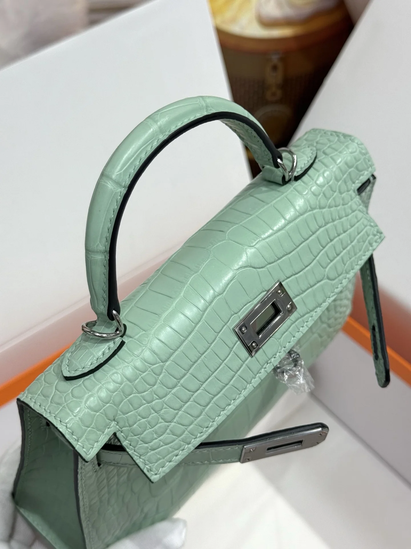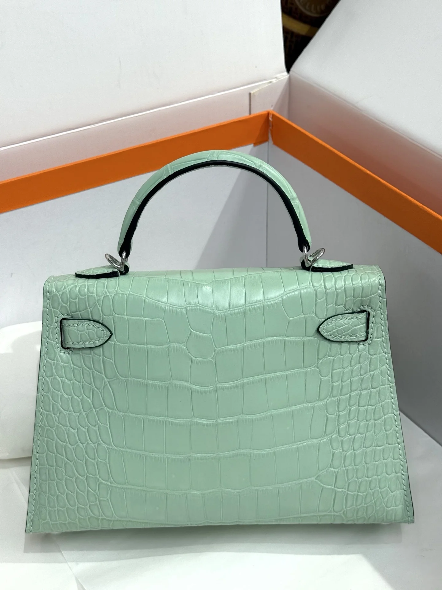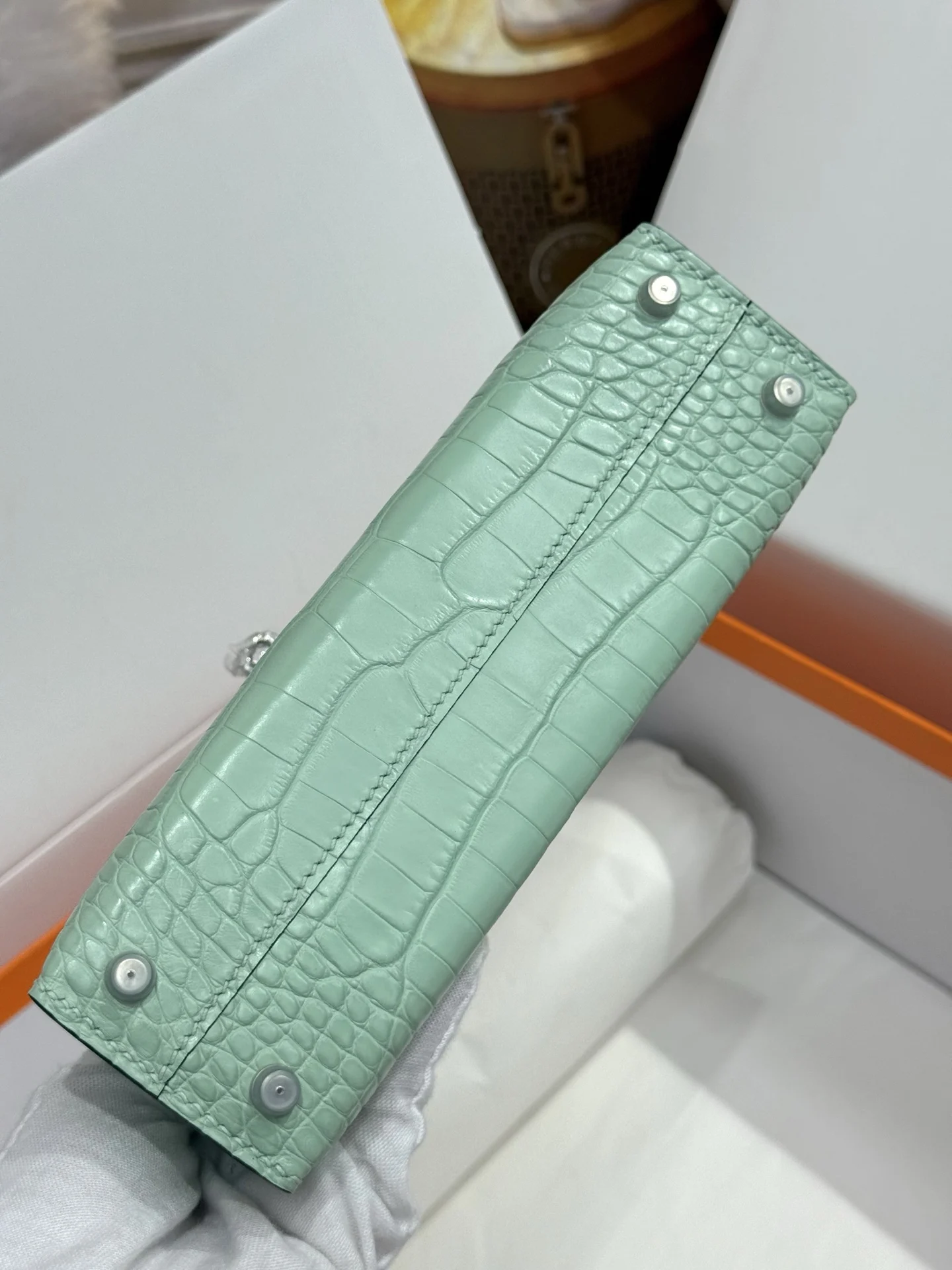 Kelly 2nd Generation 19cm Imported American Matte Alligator Leather 6U Mint Green with Silver Hardware Hand-stitched Waxed Thread Actual Photos Exact Replica of Boutique American Alligator