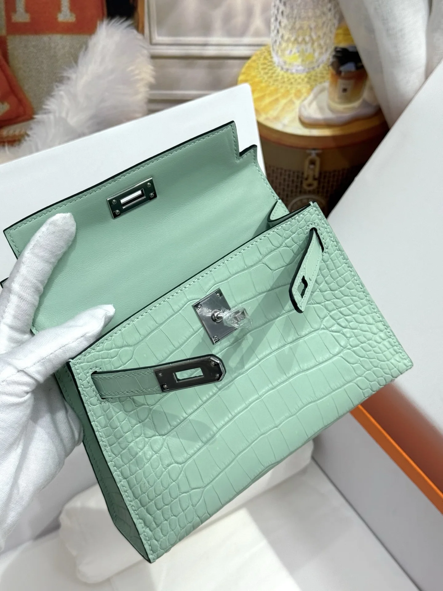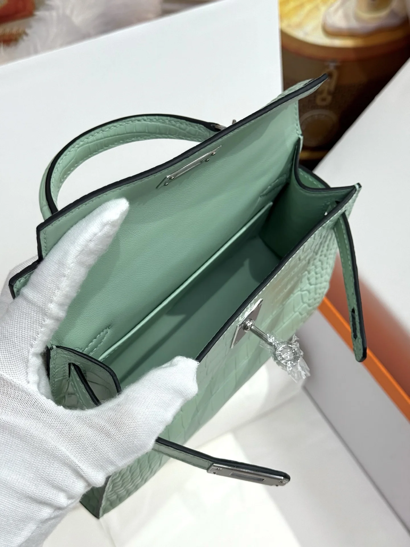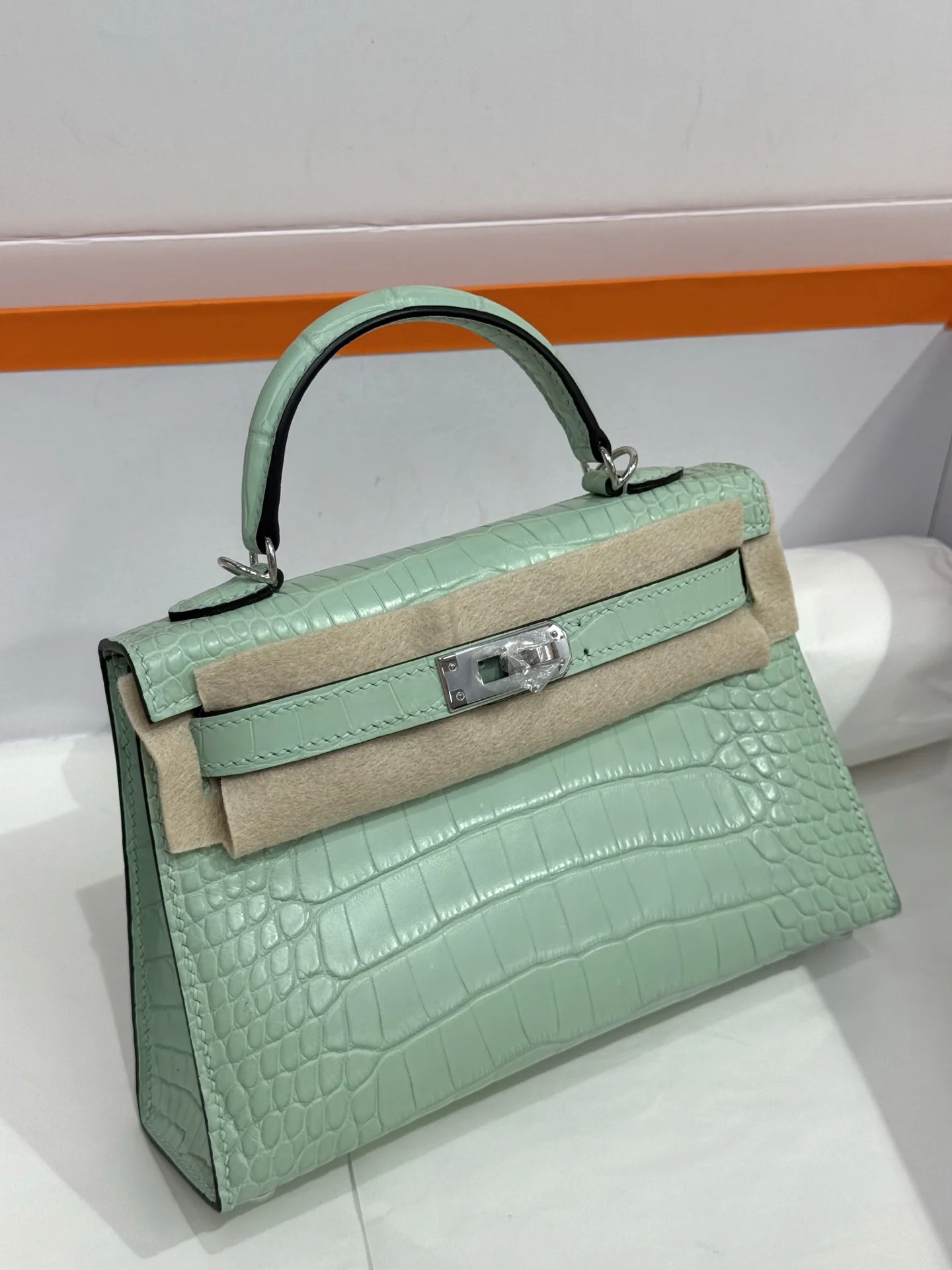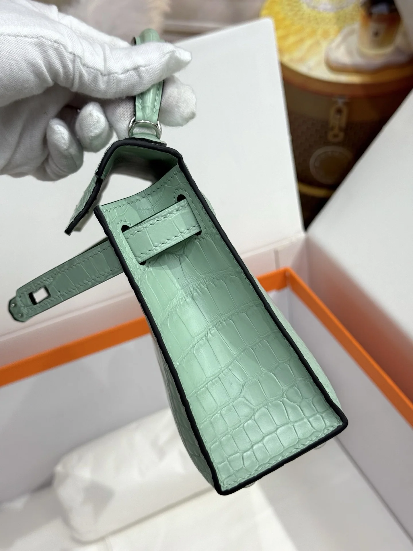 Kelly 2nd Generation 19cm Imported American Matte Alligator Leather 6U Mint Green with Silver Hardware Hand-stitched Waxed Thread Actual Photos Exact Replica of Boutique American Alligator