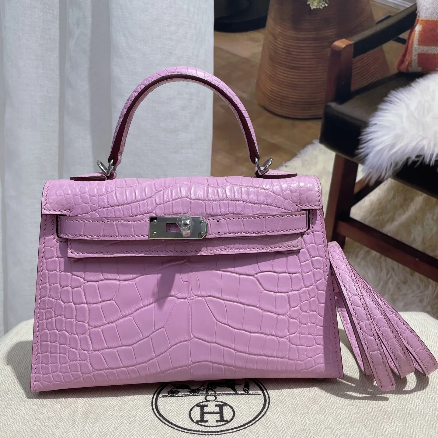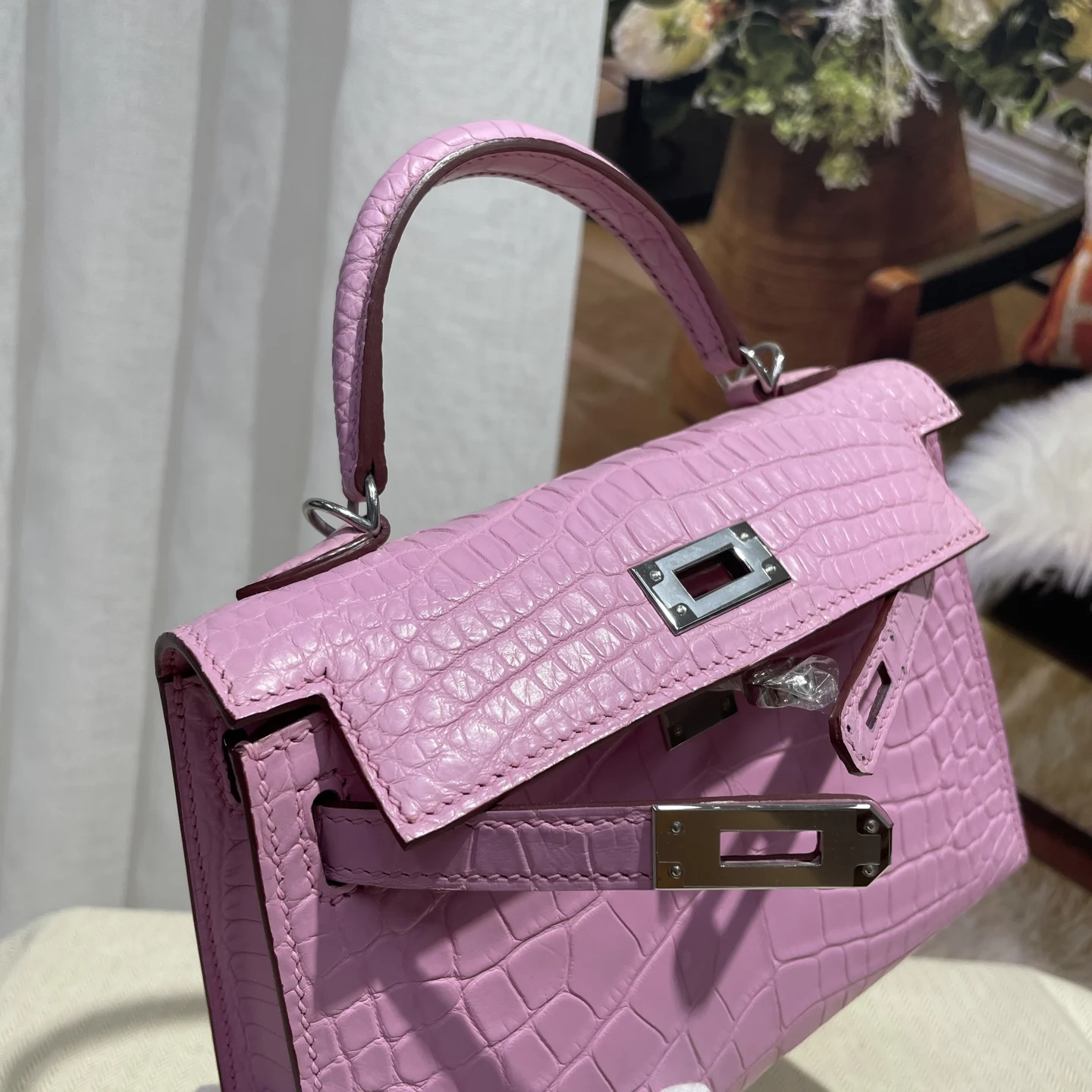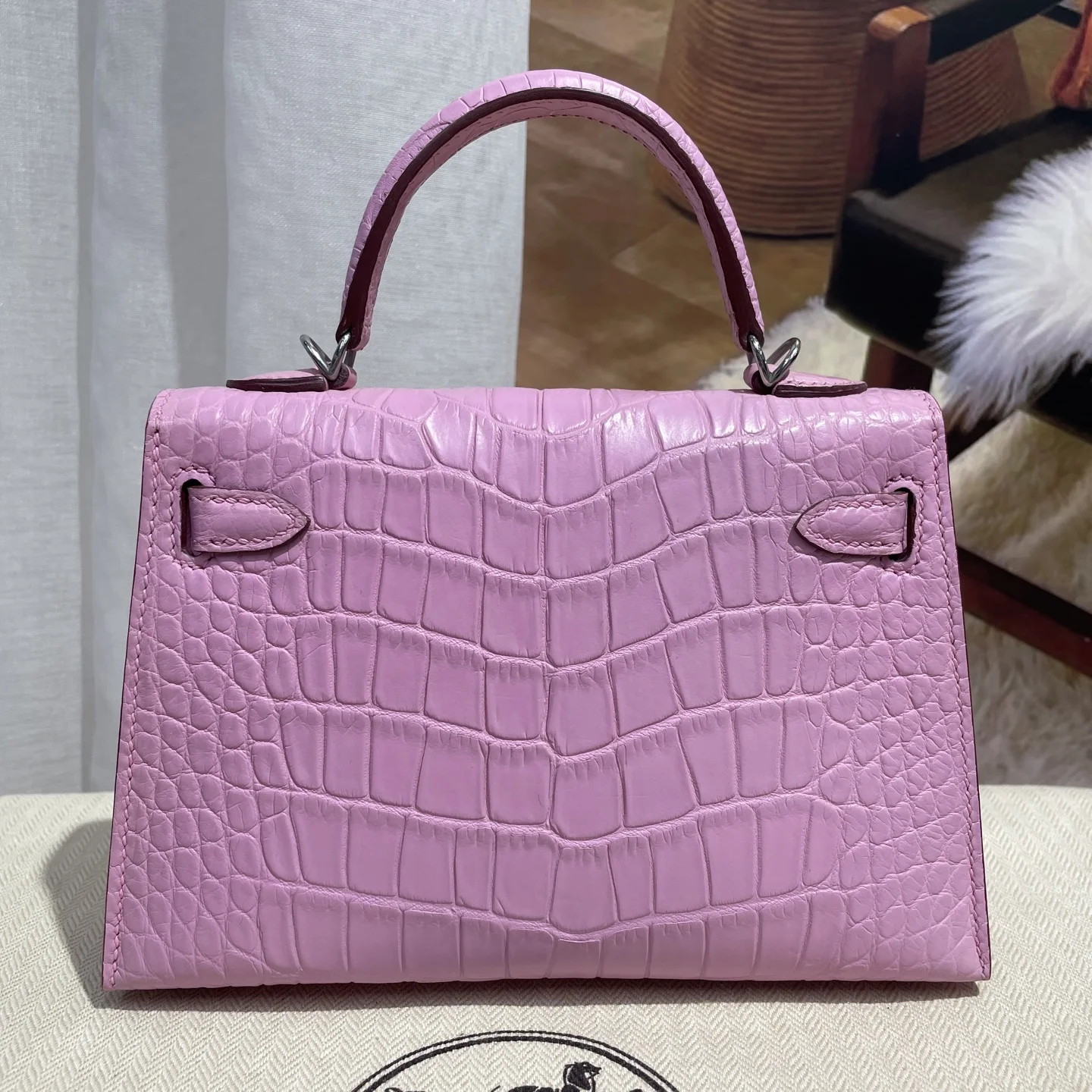 Kelly II 19cm Imported American Matte Alligator Leather, Sakura Pink, Hand-stitched Wax Thread, Actual Photo Matches the Authentic American Alligator Leather