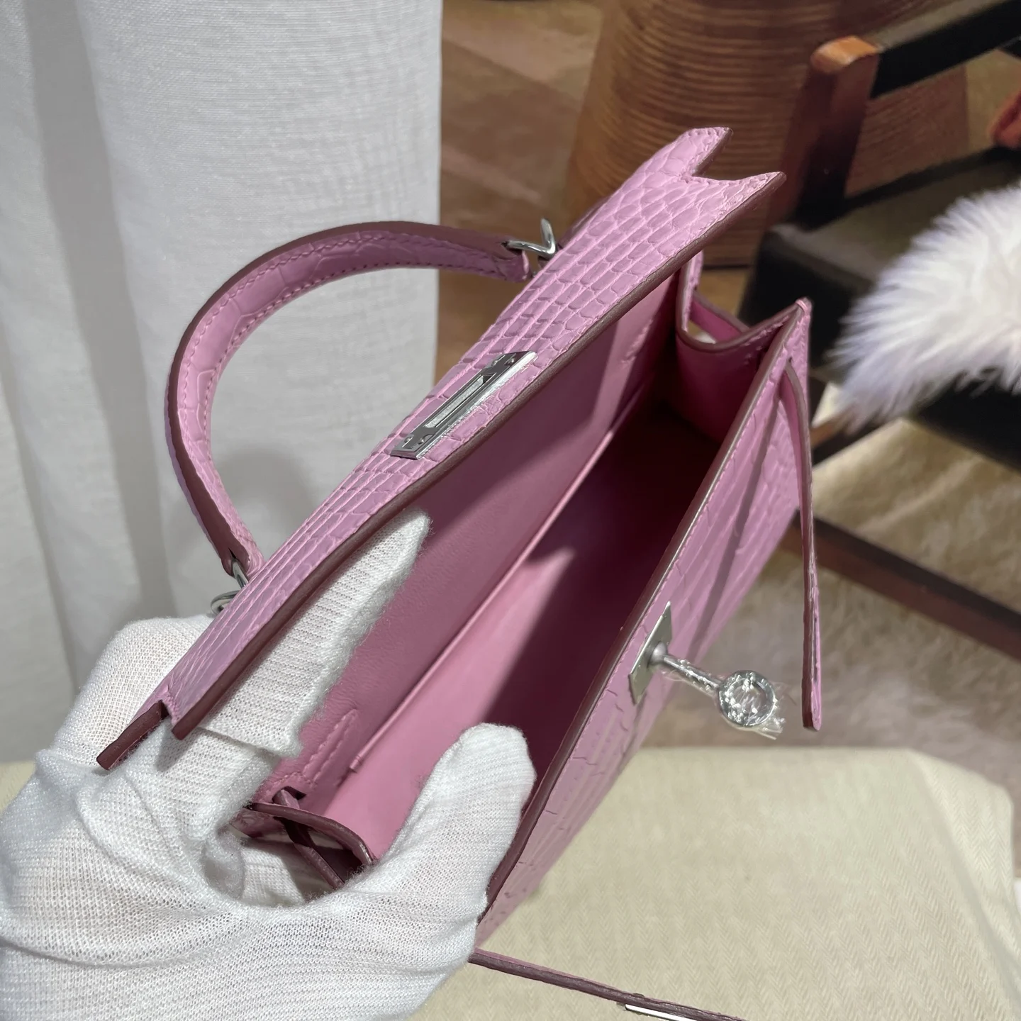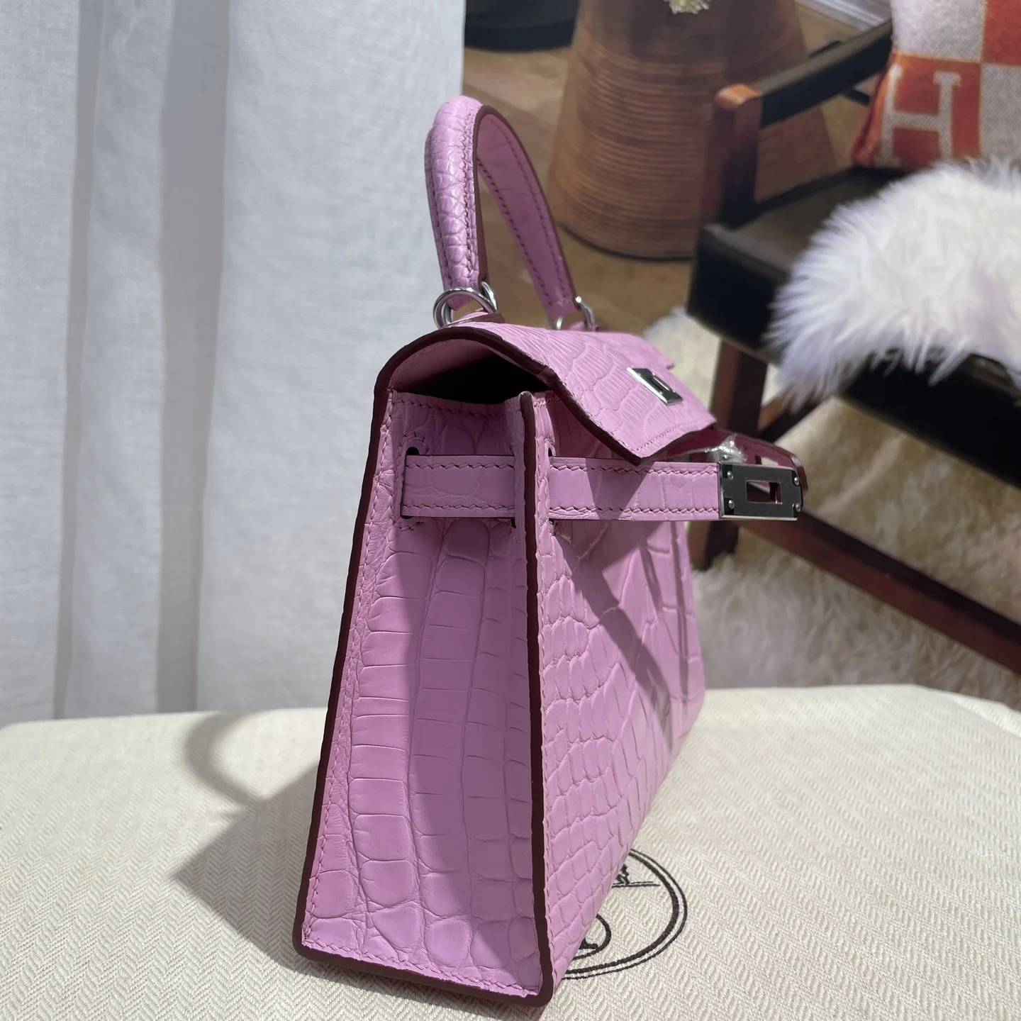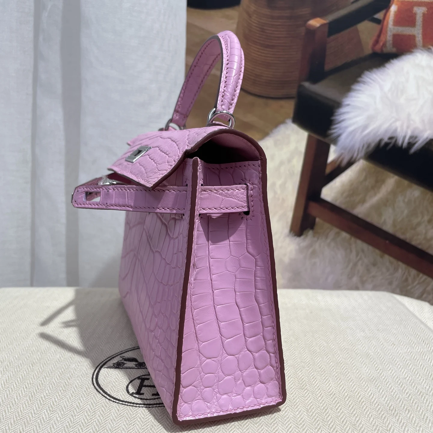 Kelly II 19cm Imported American Matte Alligator Leather, Sakura Pink, Hand-stitched Wax Thread, Actual Photo Matches the Authentic American Alligator Leather