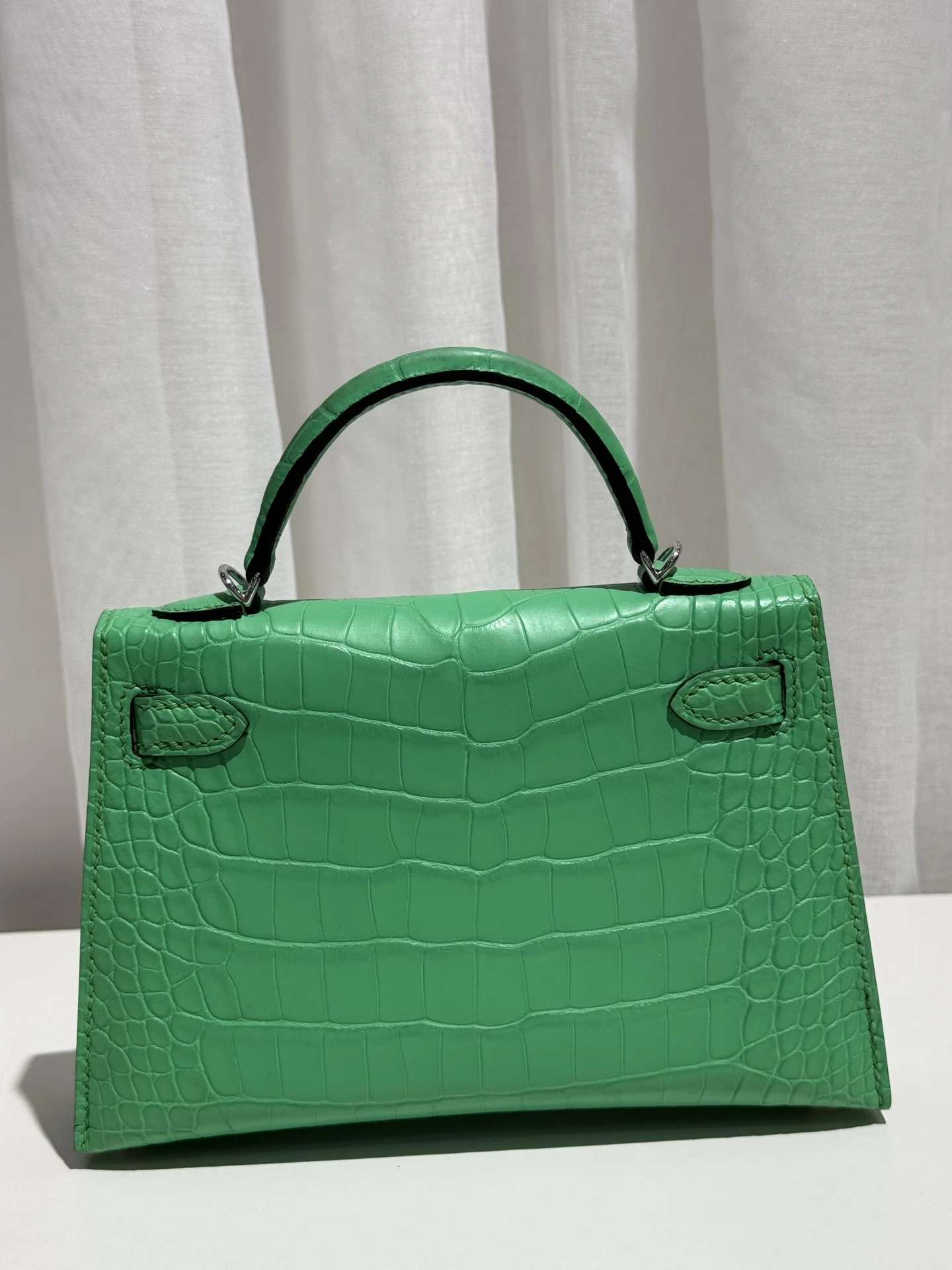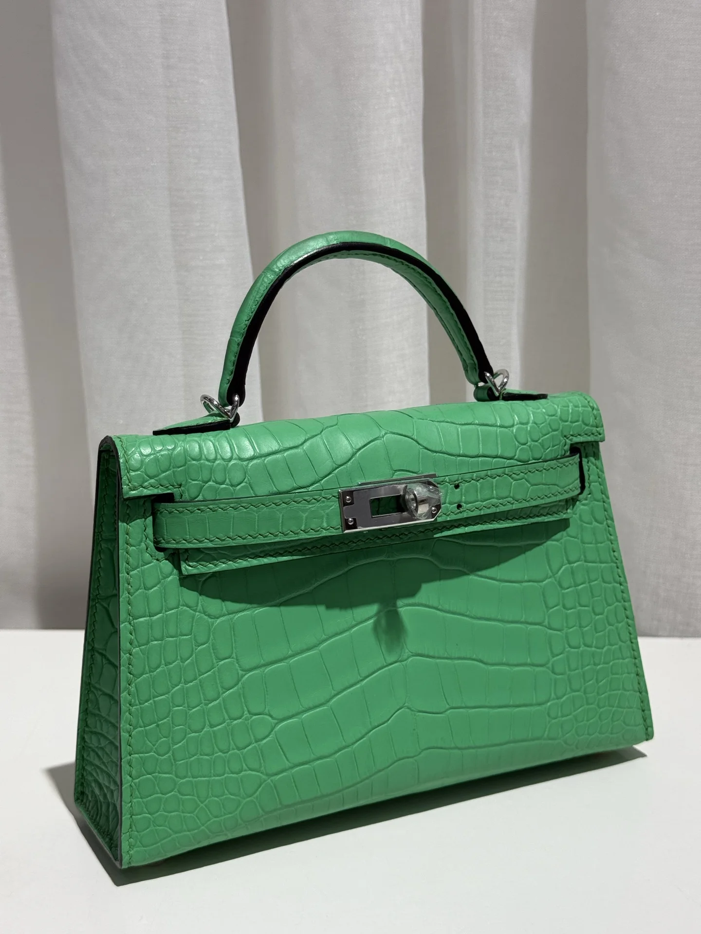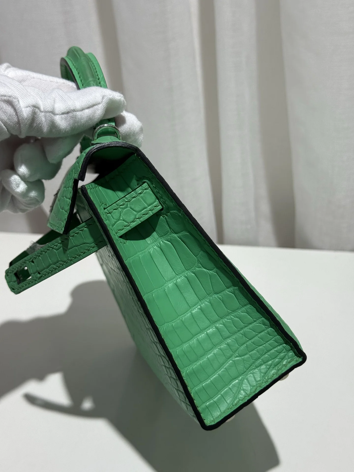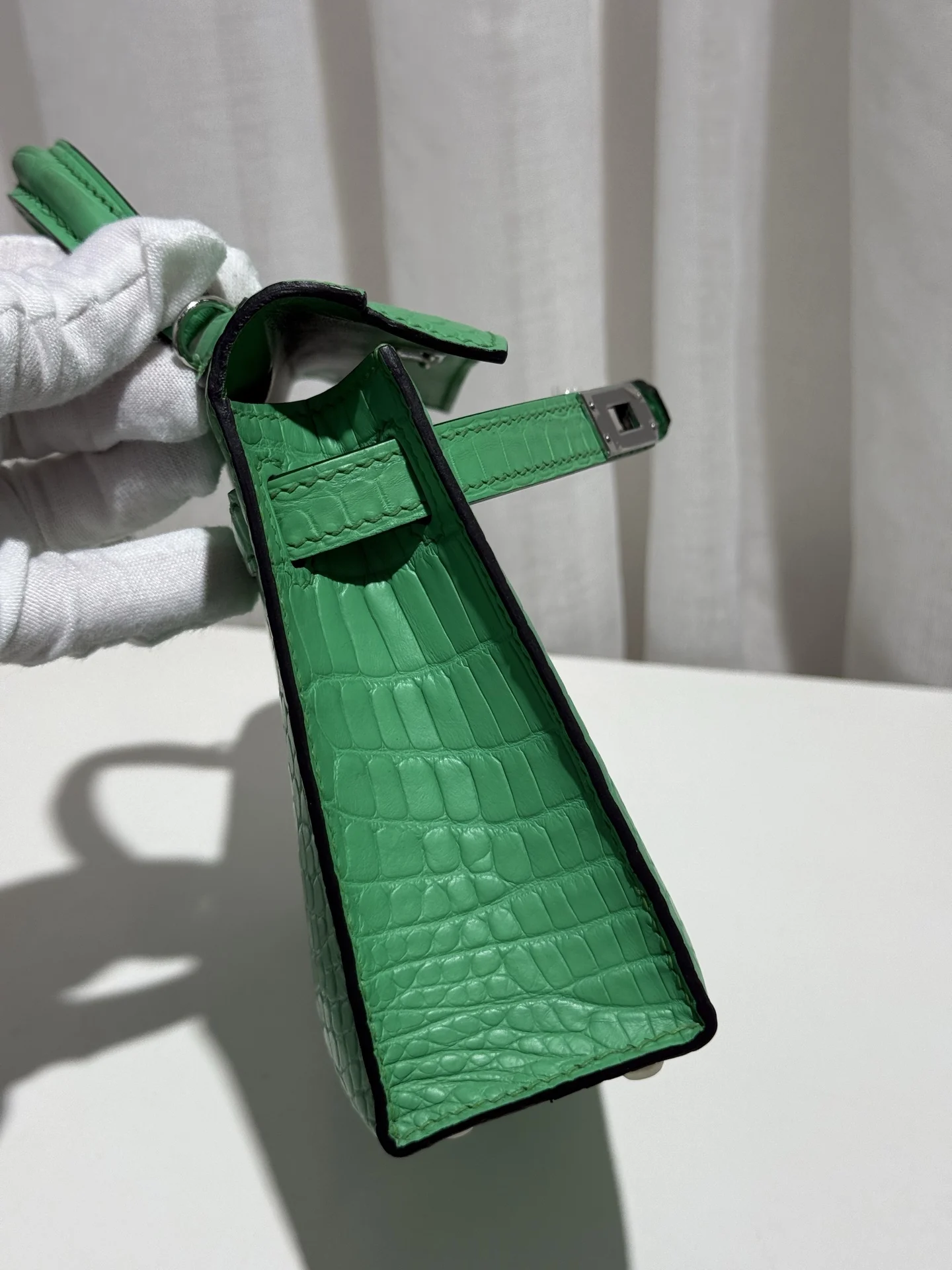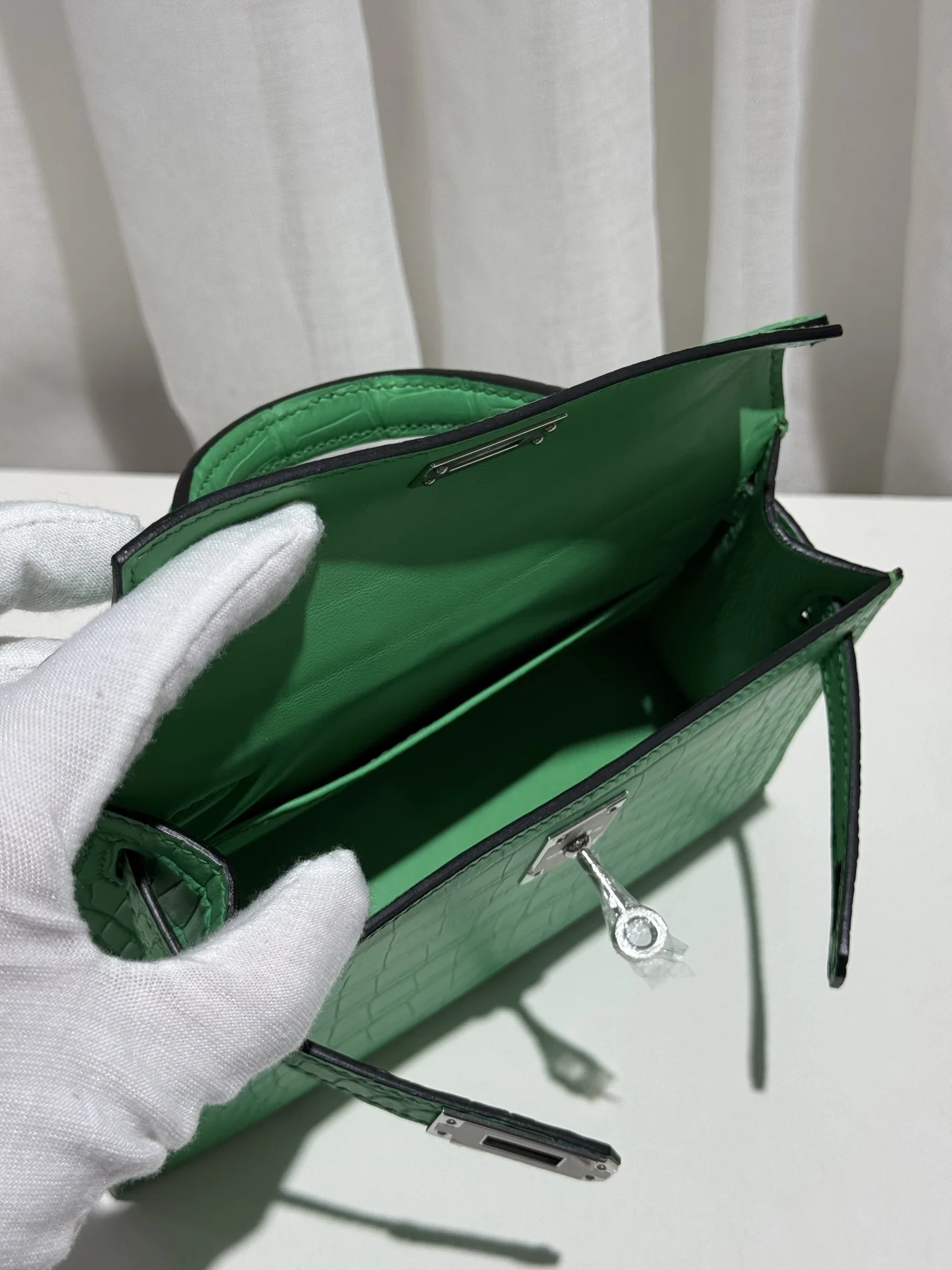 Kelly II 19 cm Imported American Matte Alligator Leather, Comic Green, Silver Hardware, Hand-stitched Matches Authentic American Alligator