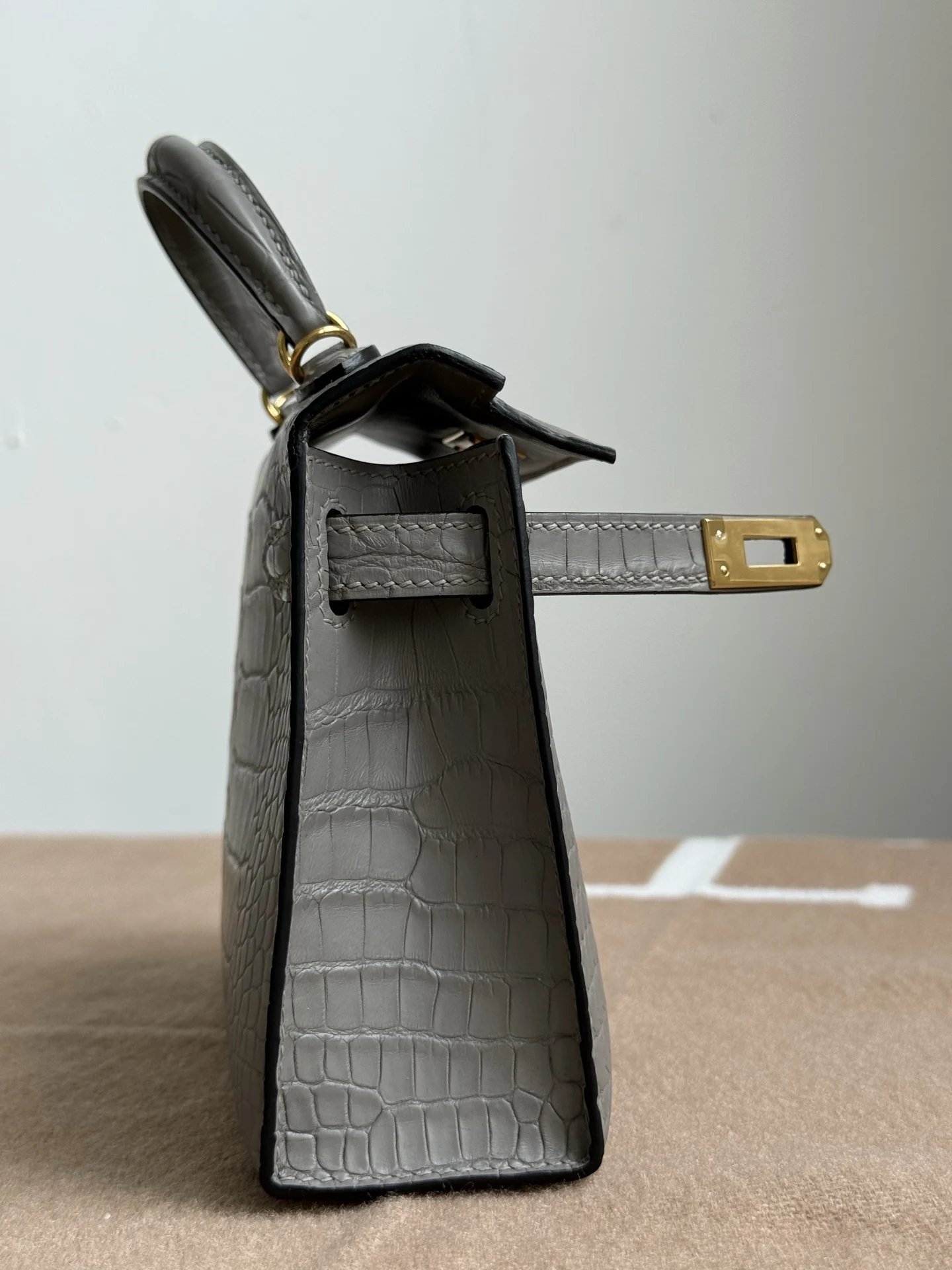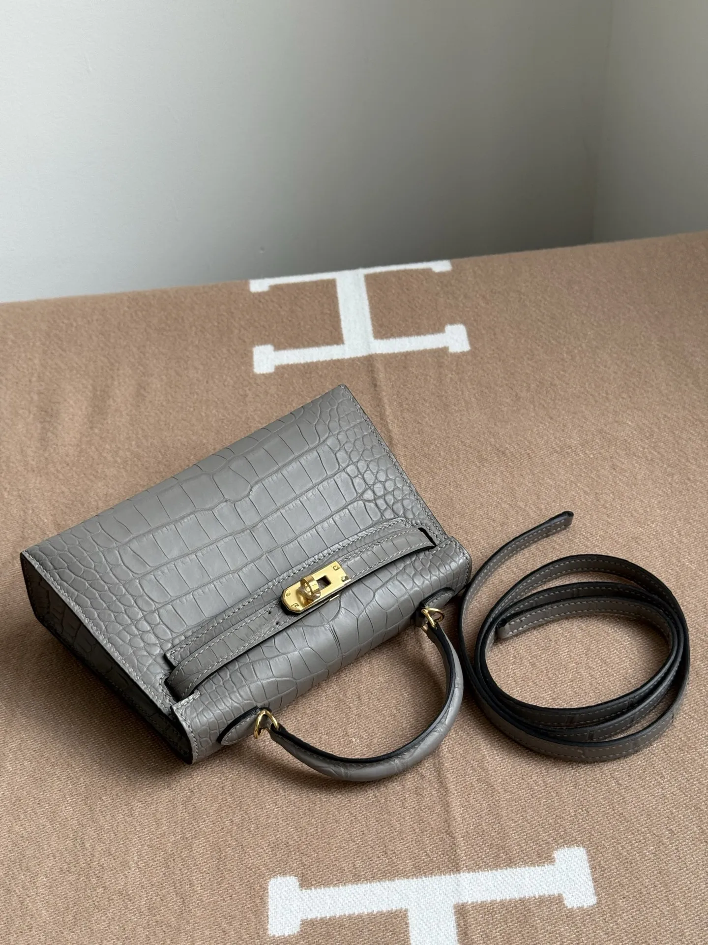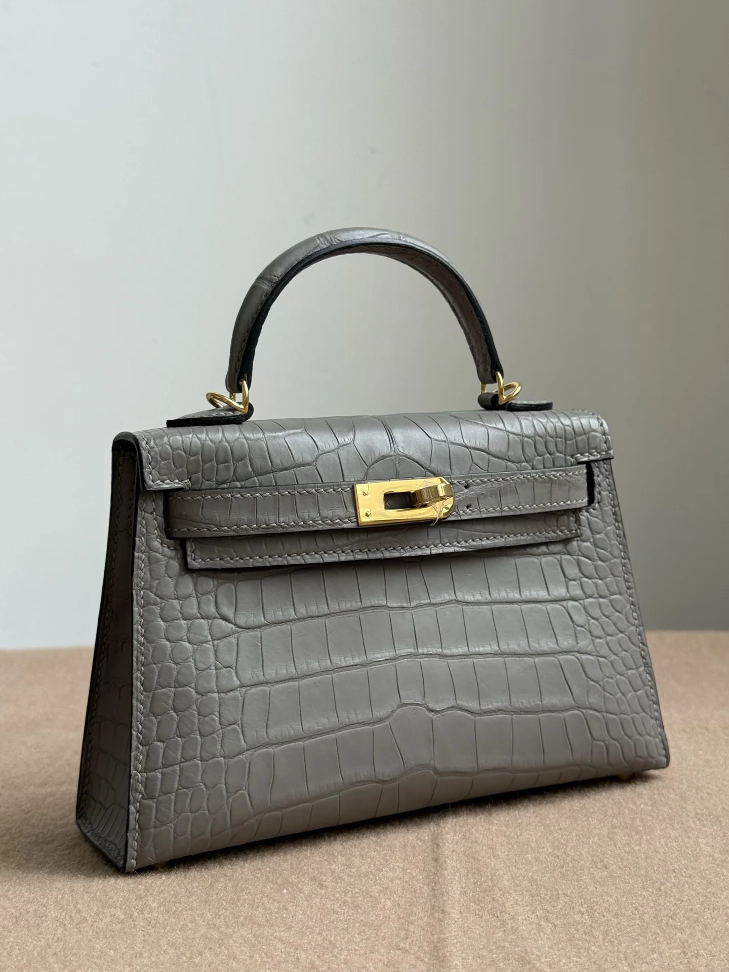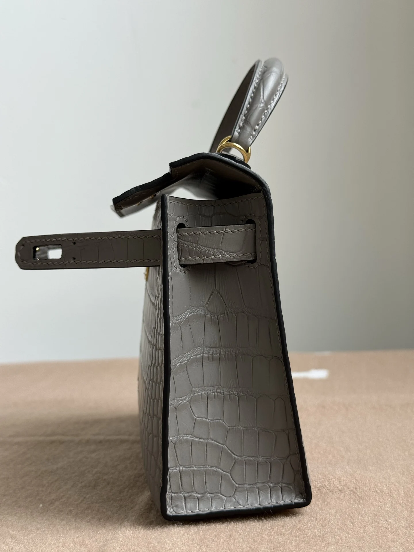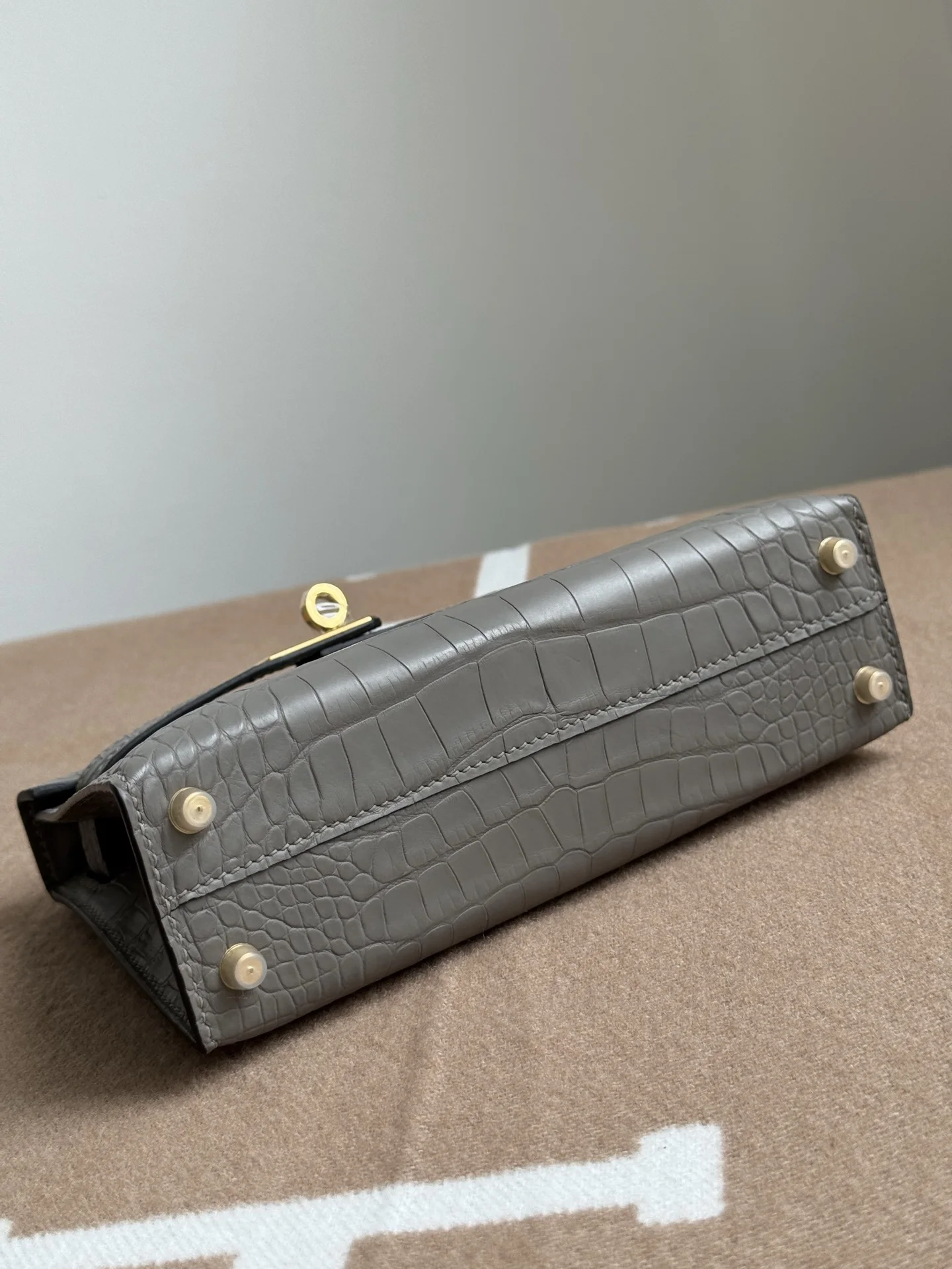 Kelly II 19cm Imported Matte American Alligator Leather, Cement Gray, Full Set of Hand-Hammered Hardware, Hand-Sewn Waxed Linen Thread, Actual Photos [Color] Exact Replica of Boutique American Alligator
