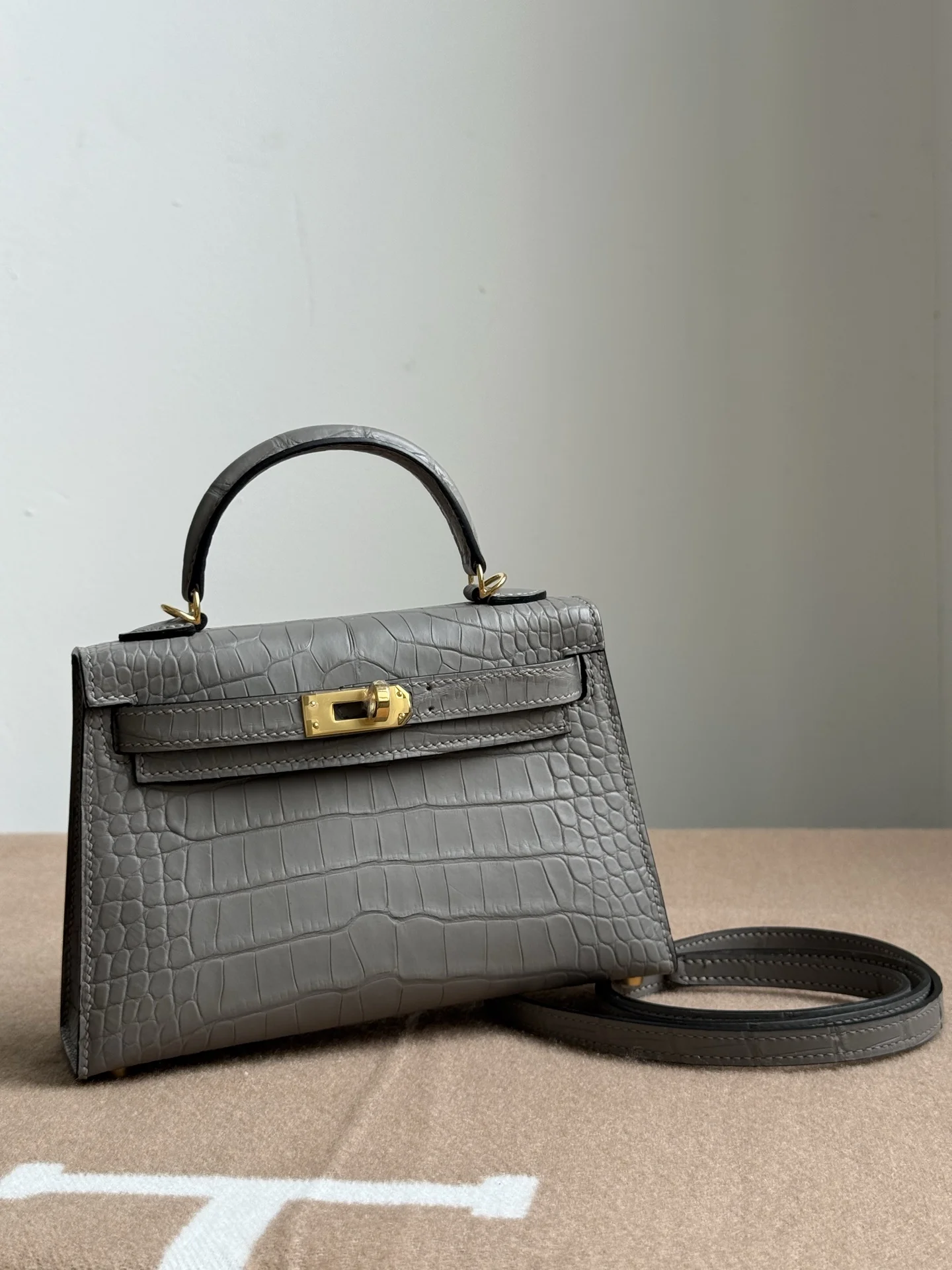 Kelly II 19cm Imported Matte American Alligator Leather, Cement Gray, Full Set of Hand-Hammered Hardware, Hand-Sewn Waxed Linen Thread, Actual Photos [Color] Exact Replica of Bouti..
