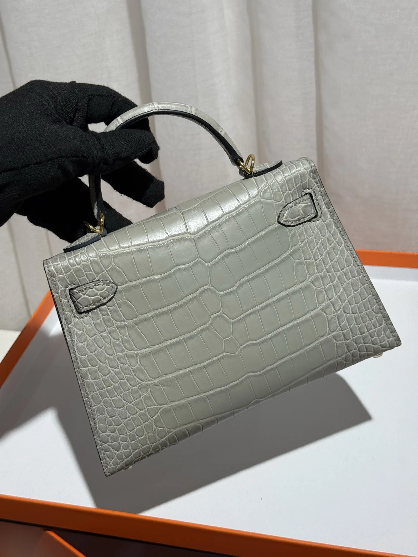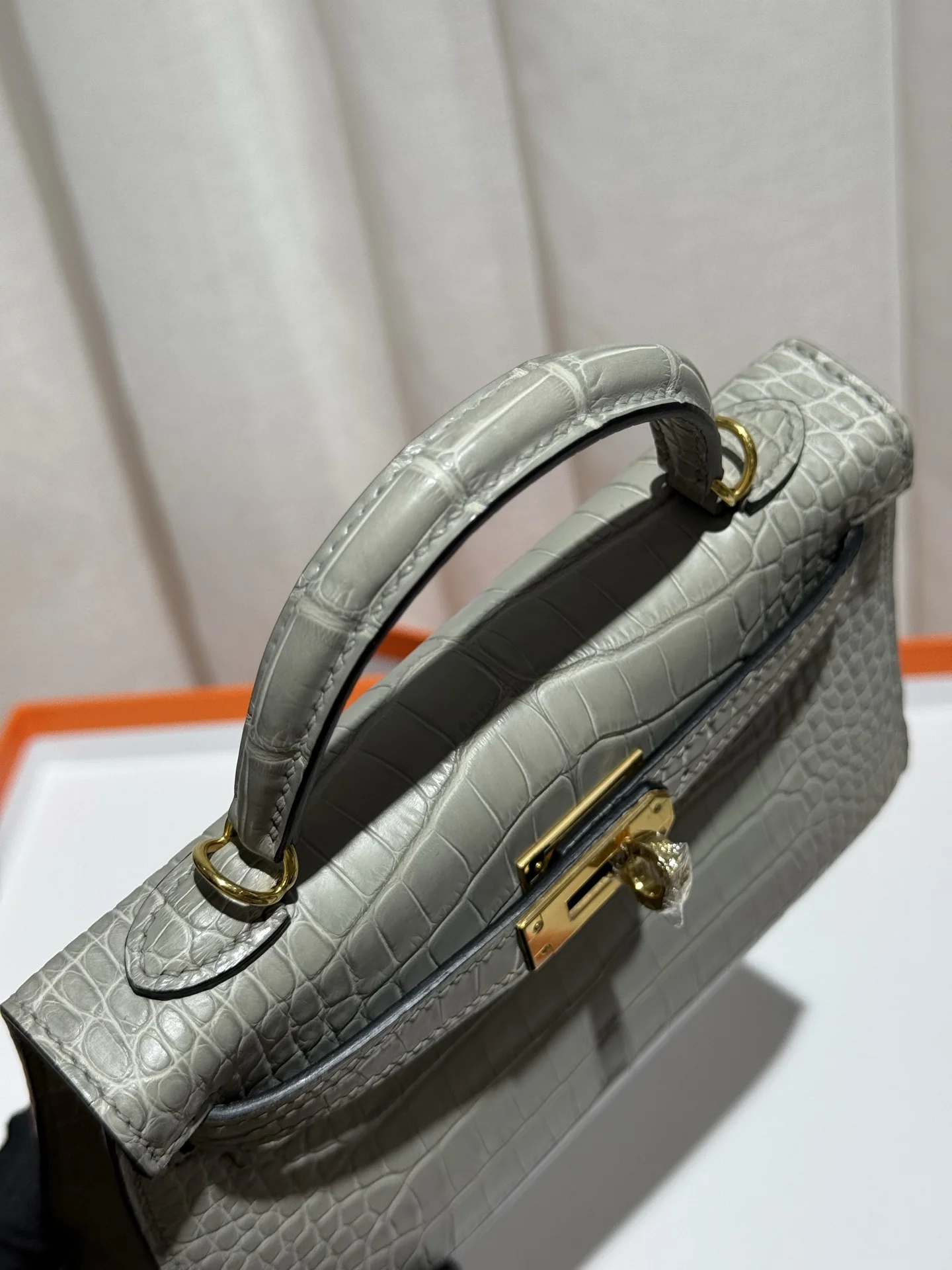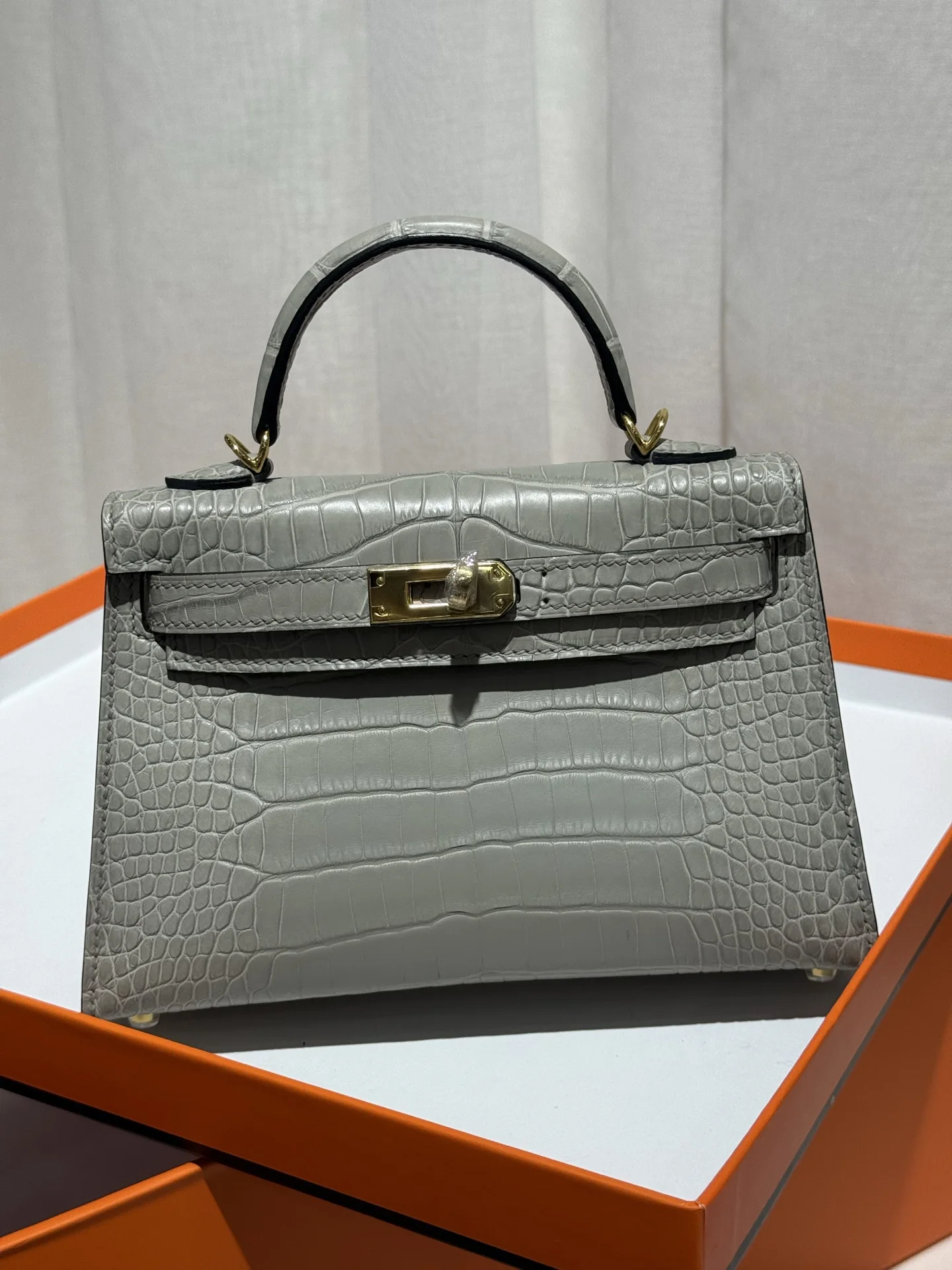 Kelly II 19cm Imported American Matte Alligator Leather, Pearl Grey, Full Set of Hand-Hammered Hardware, Hand-Sewn Waxed Linen Thread, Actual Photo [Color] Matches Authentic American Alligator.