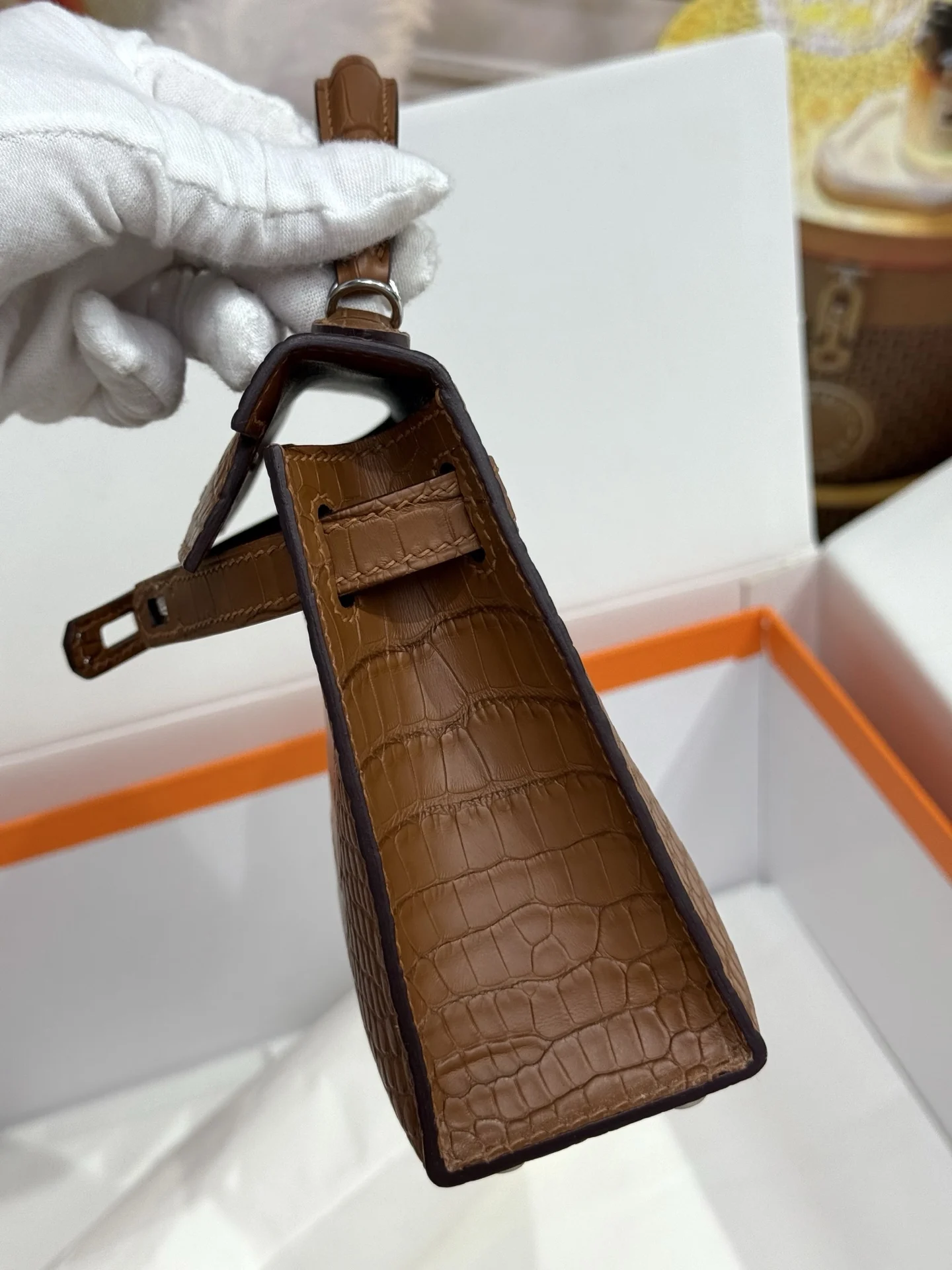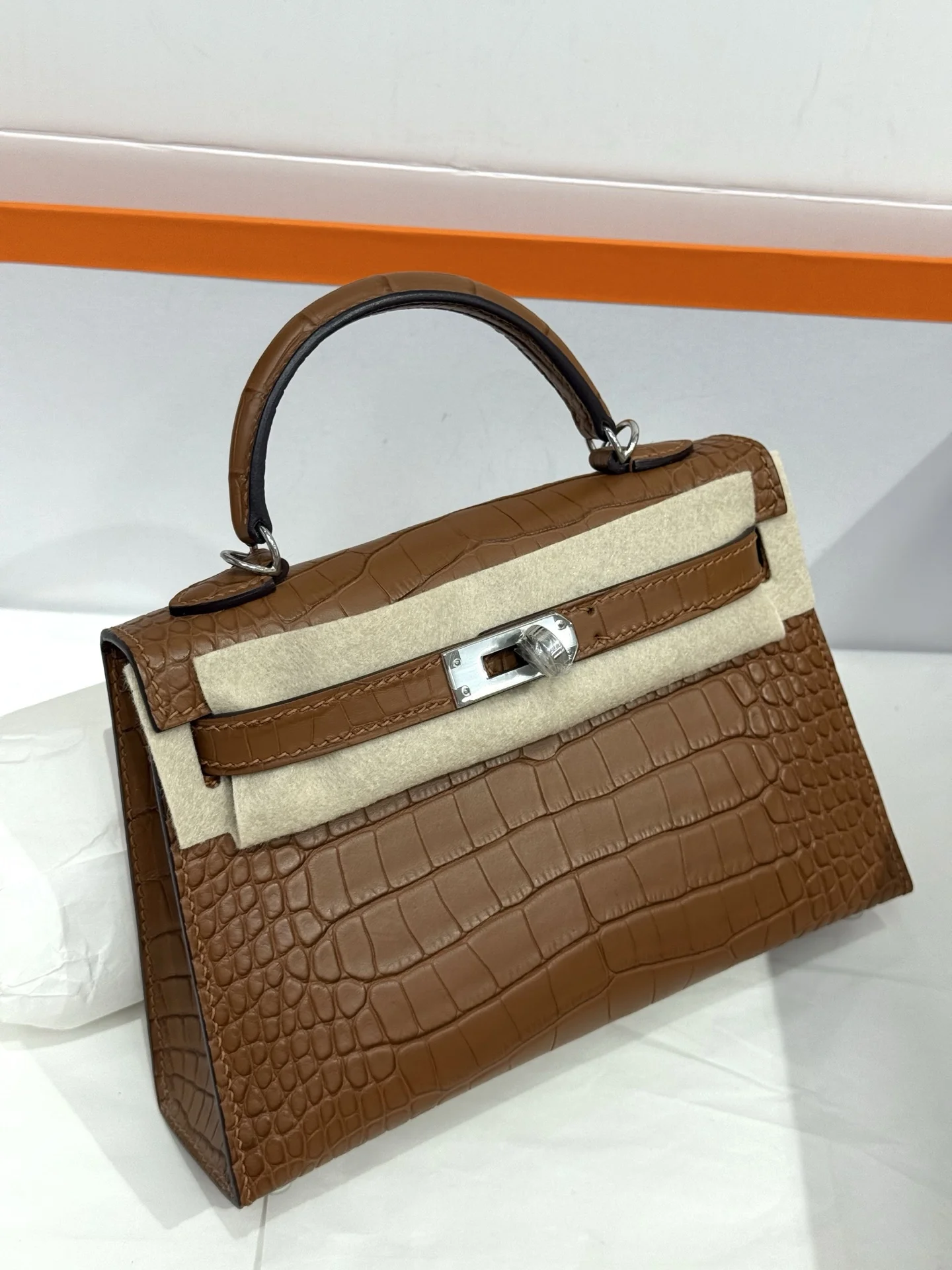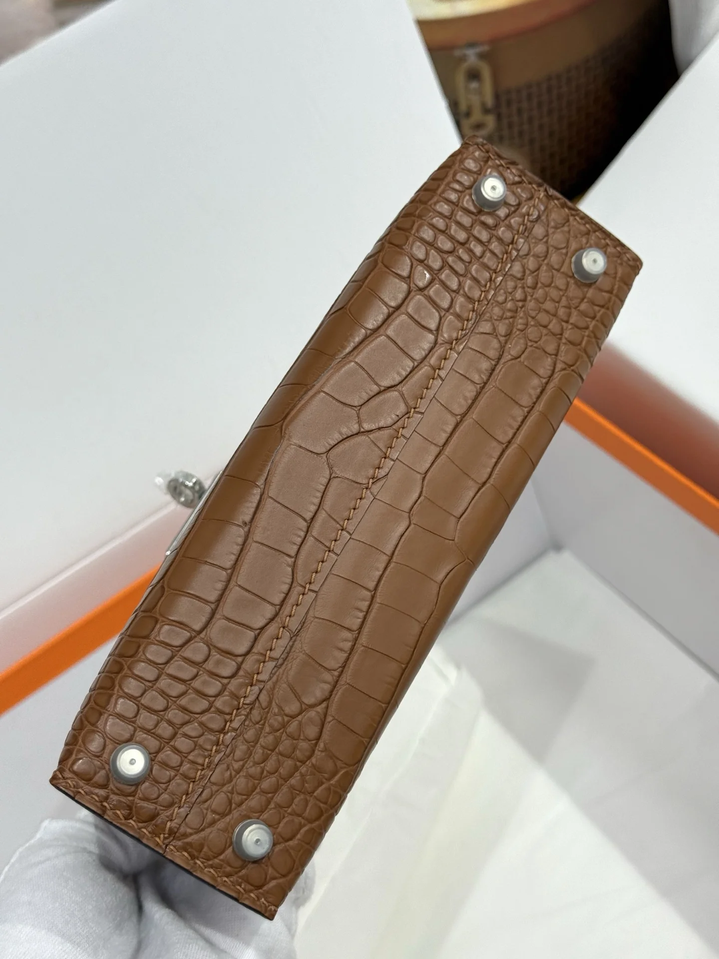 Kelly II 19cm, imported American alligator with matte finish, gold brown hardware, hand-stitched with waxed thread, actual shooting replica of the authentic American alligator.