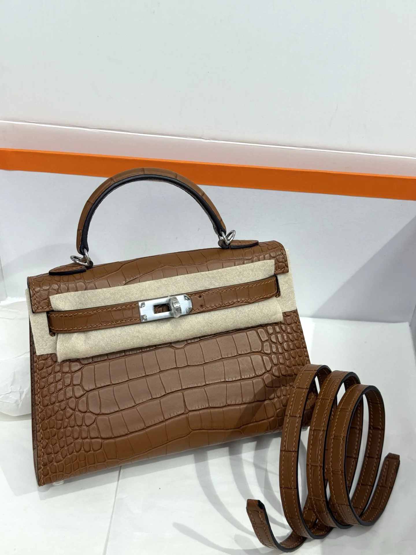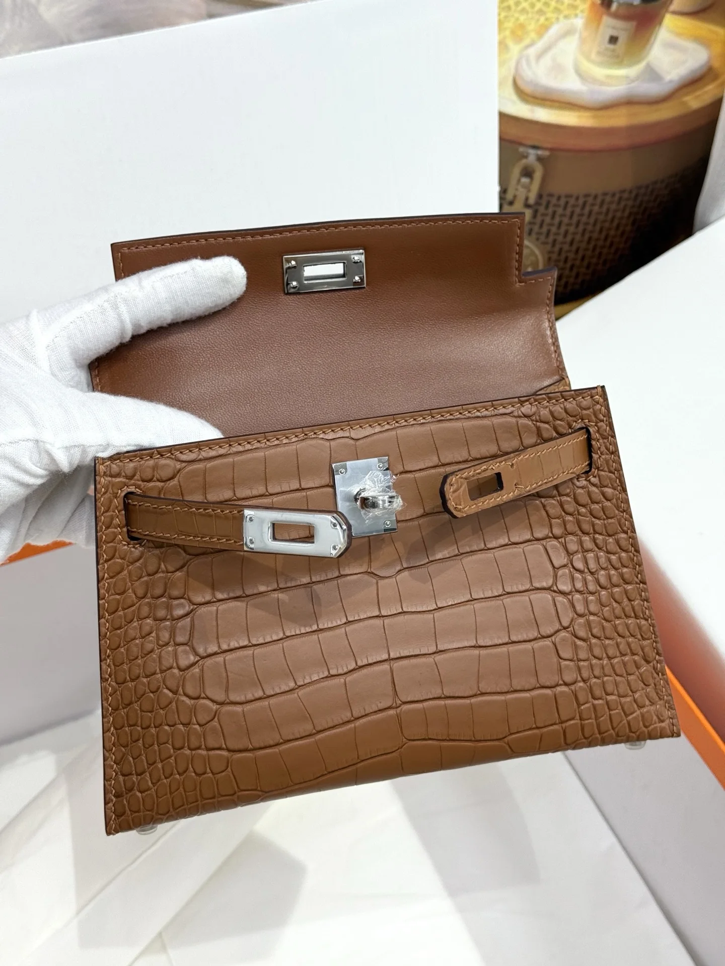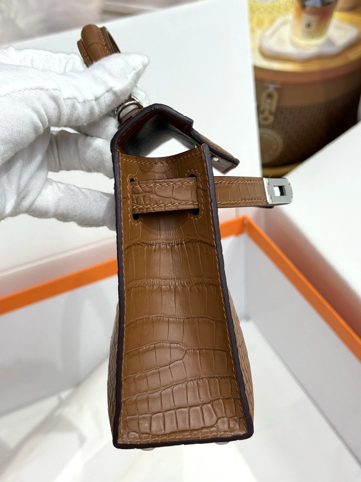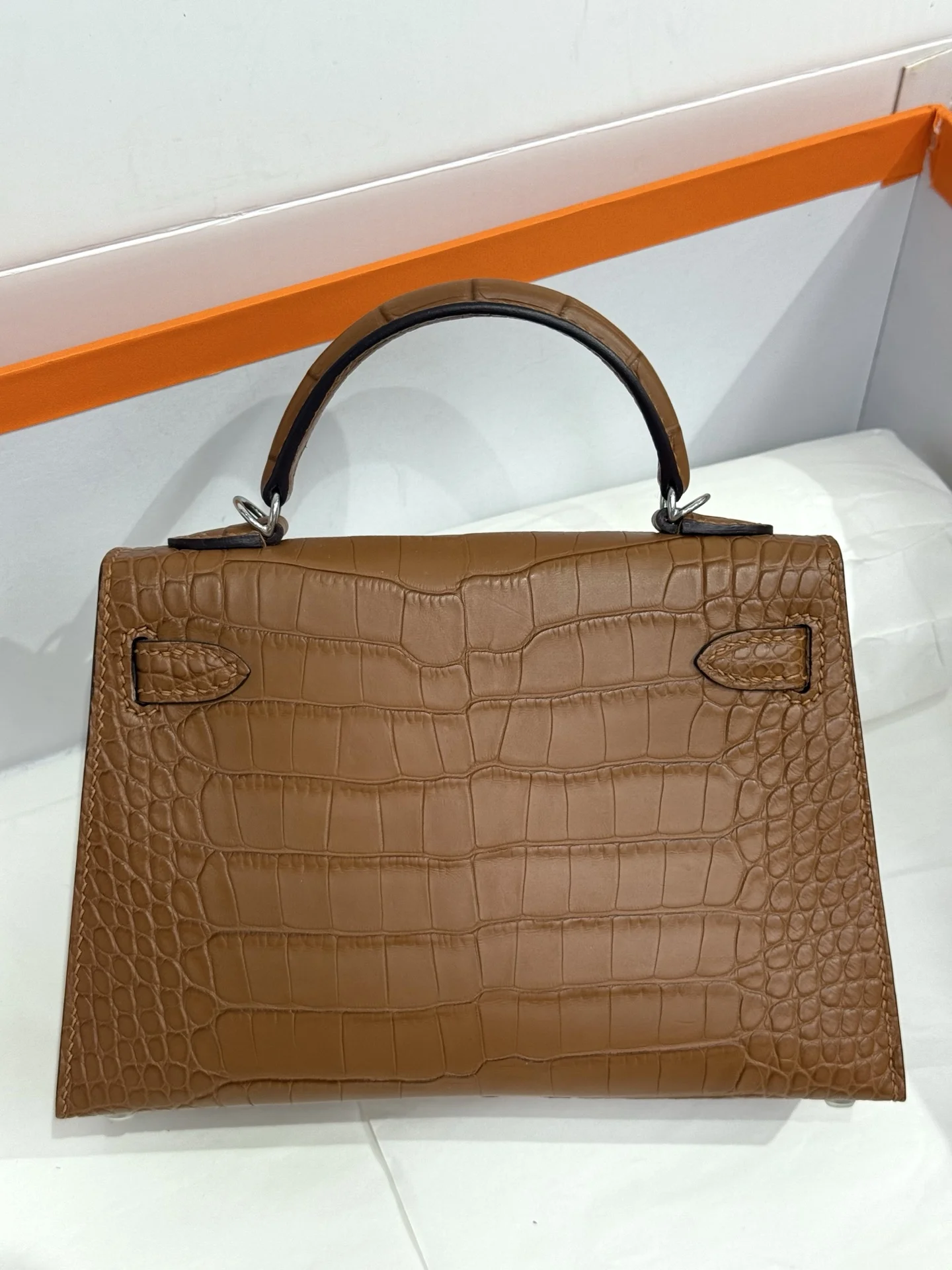 Kelly II 19cm, imported American alligator with matte finish, gold brown hardware, hand-stitched with waxed thread, actual shooting replica of the authentic American alligator.