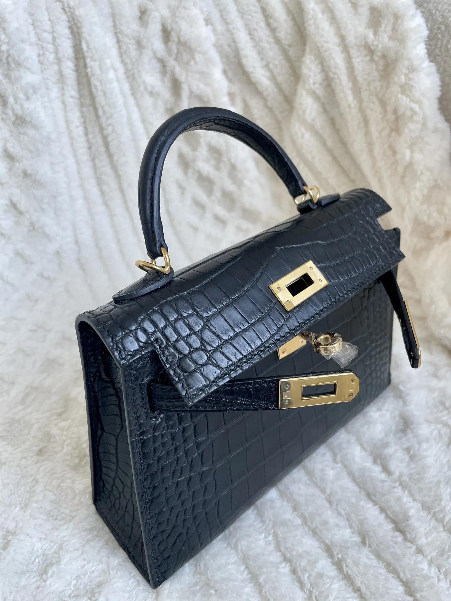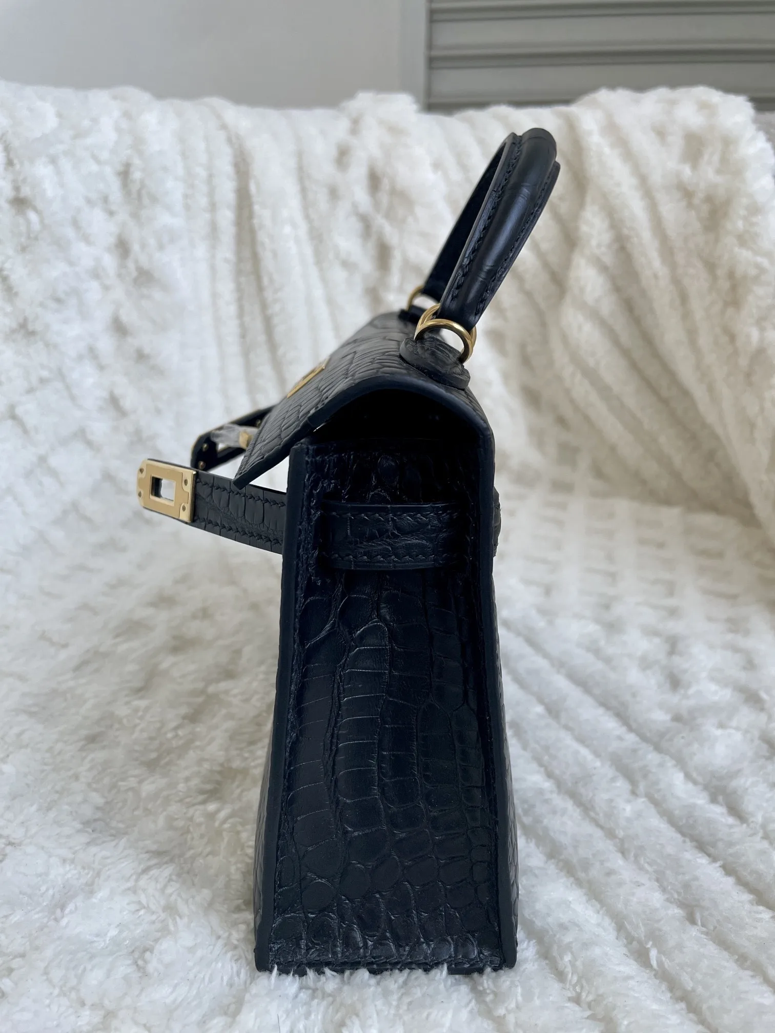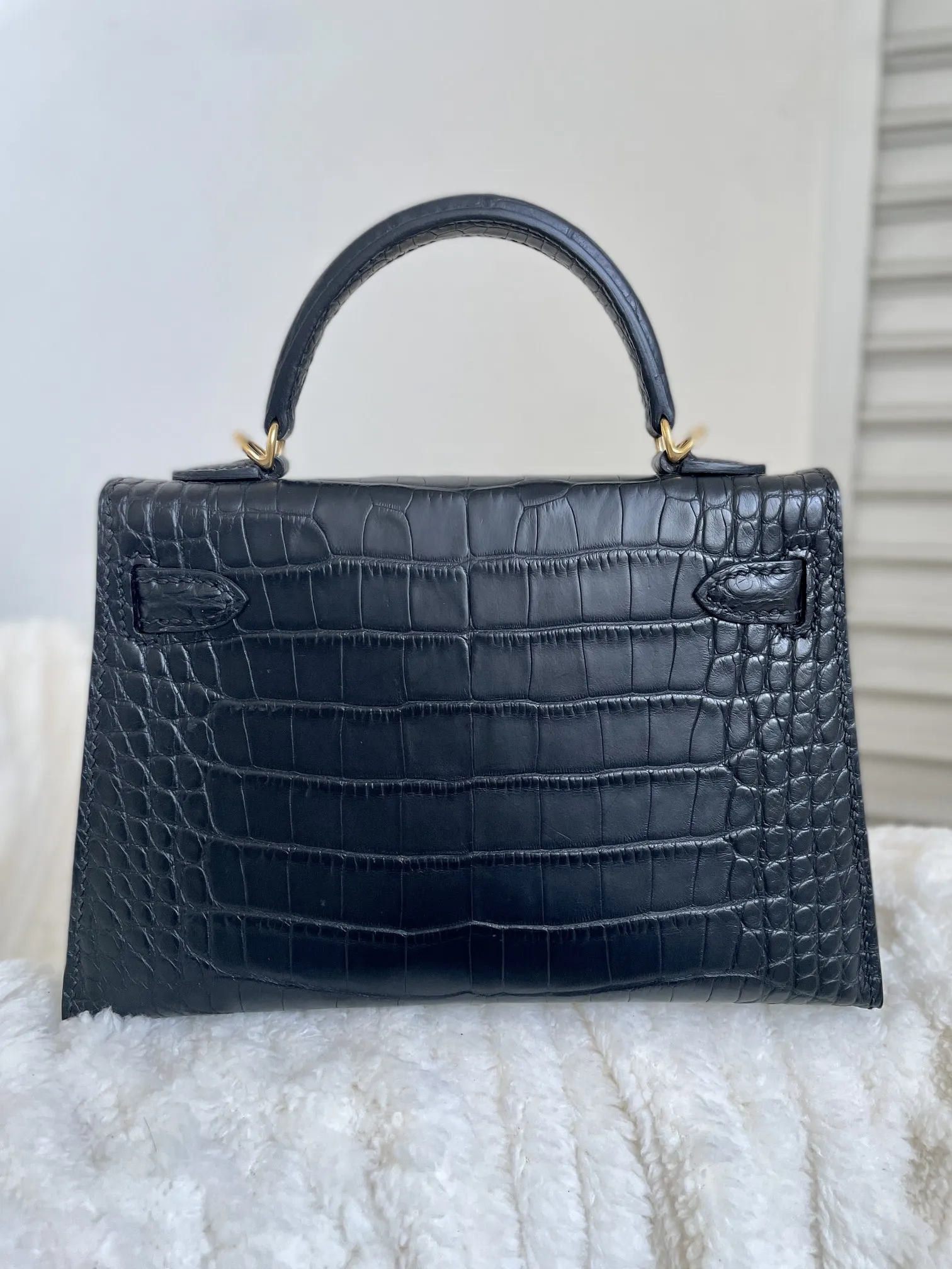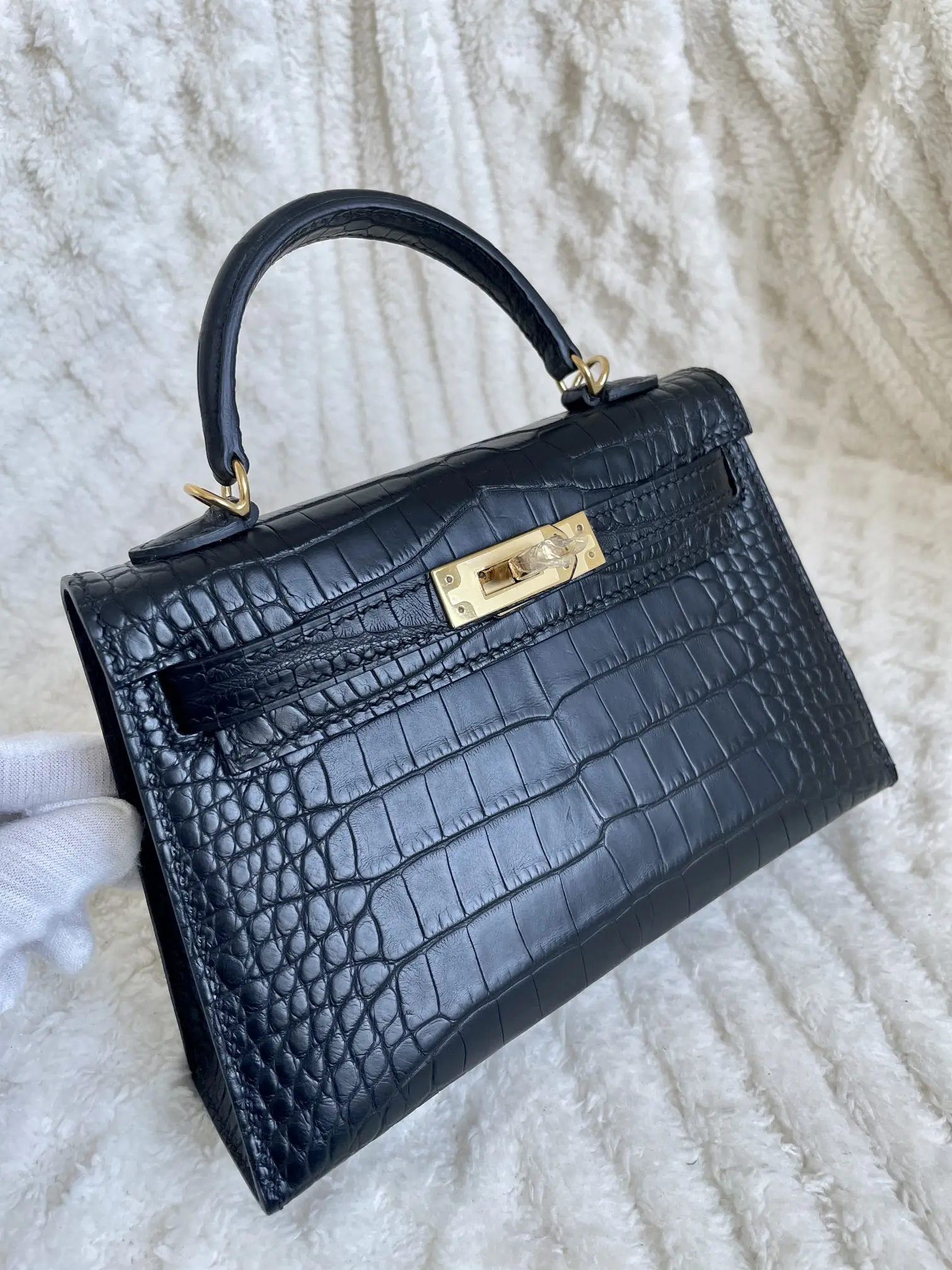 Kelly II 19cm Imported American Matte Alligator Leather, Black with Gold Hardware, W Stamp, Hand-stitched Waxed Thread, Matches Authentic American Alligator.