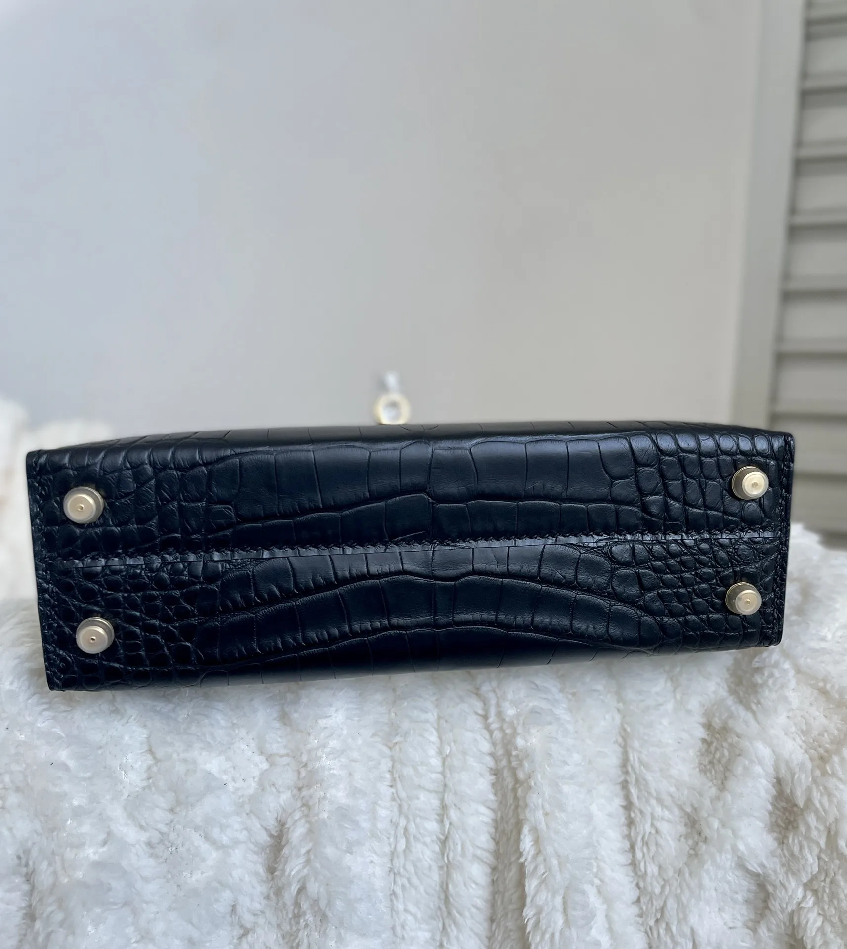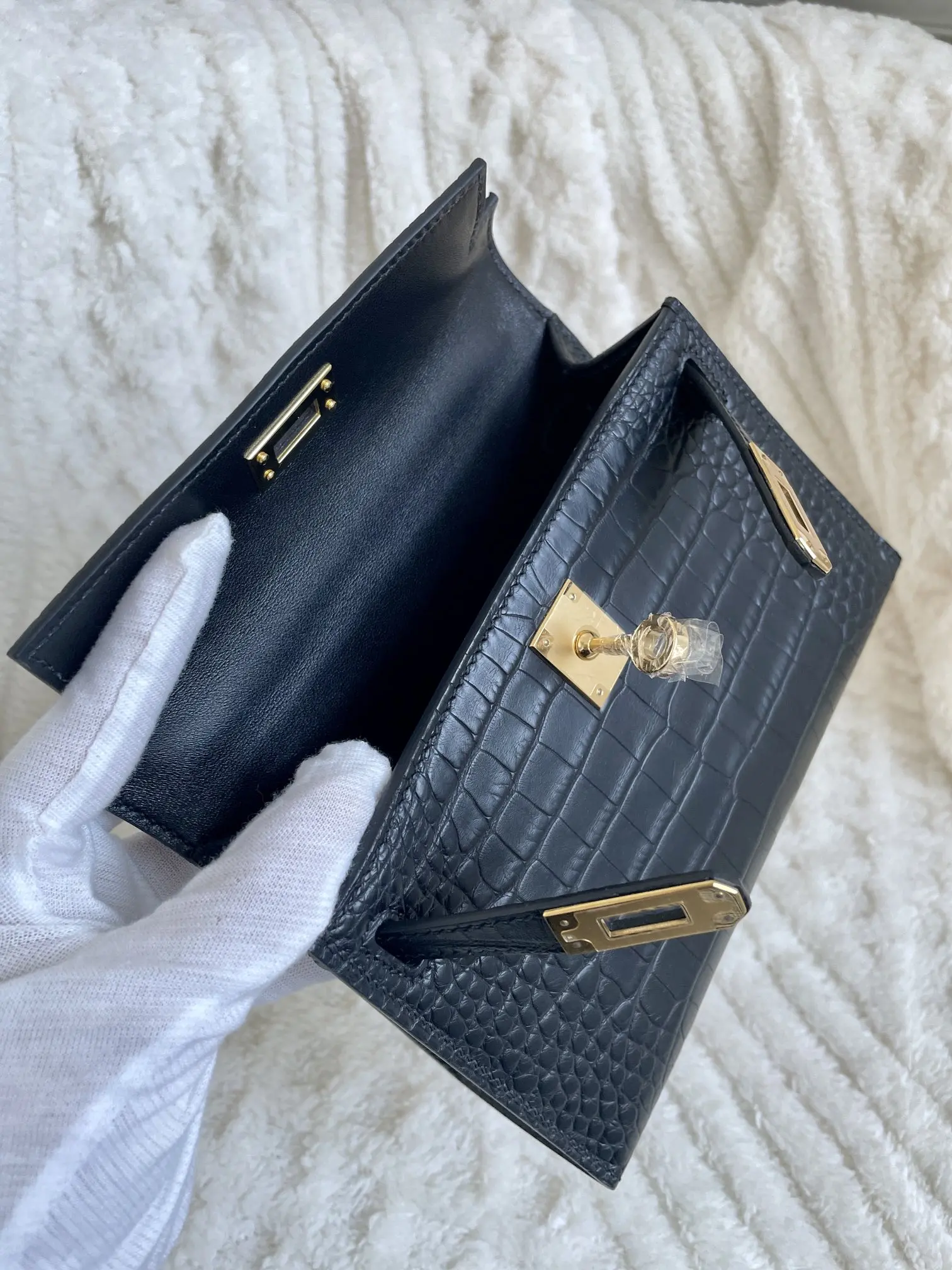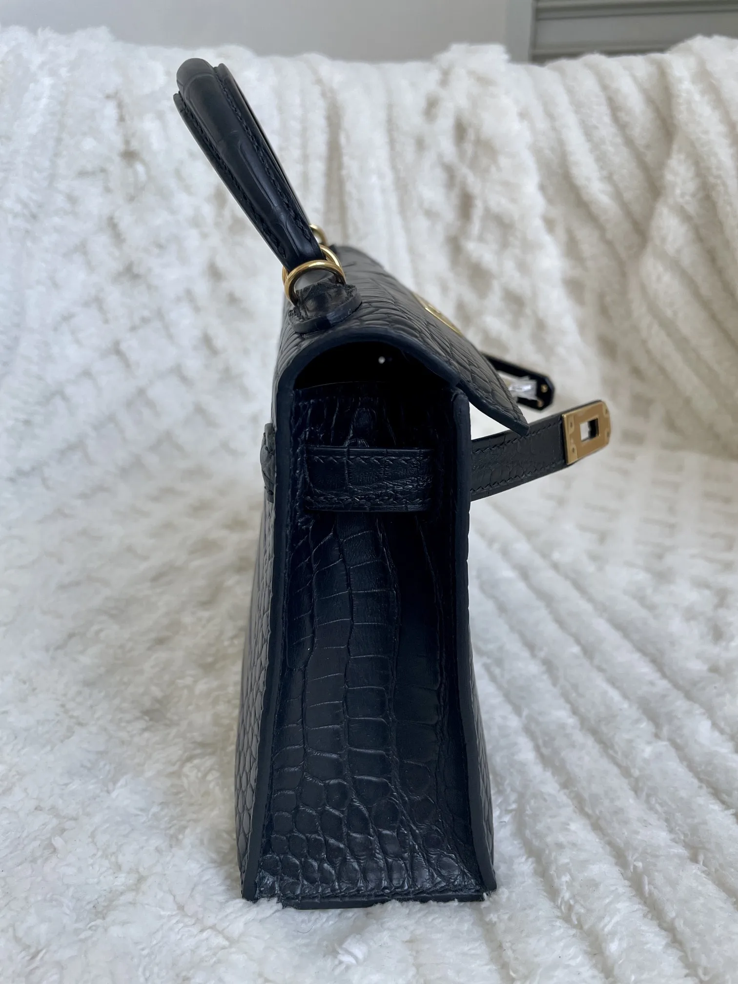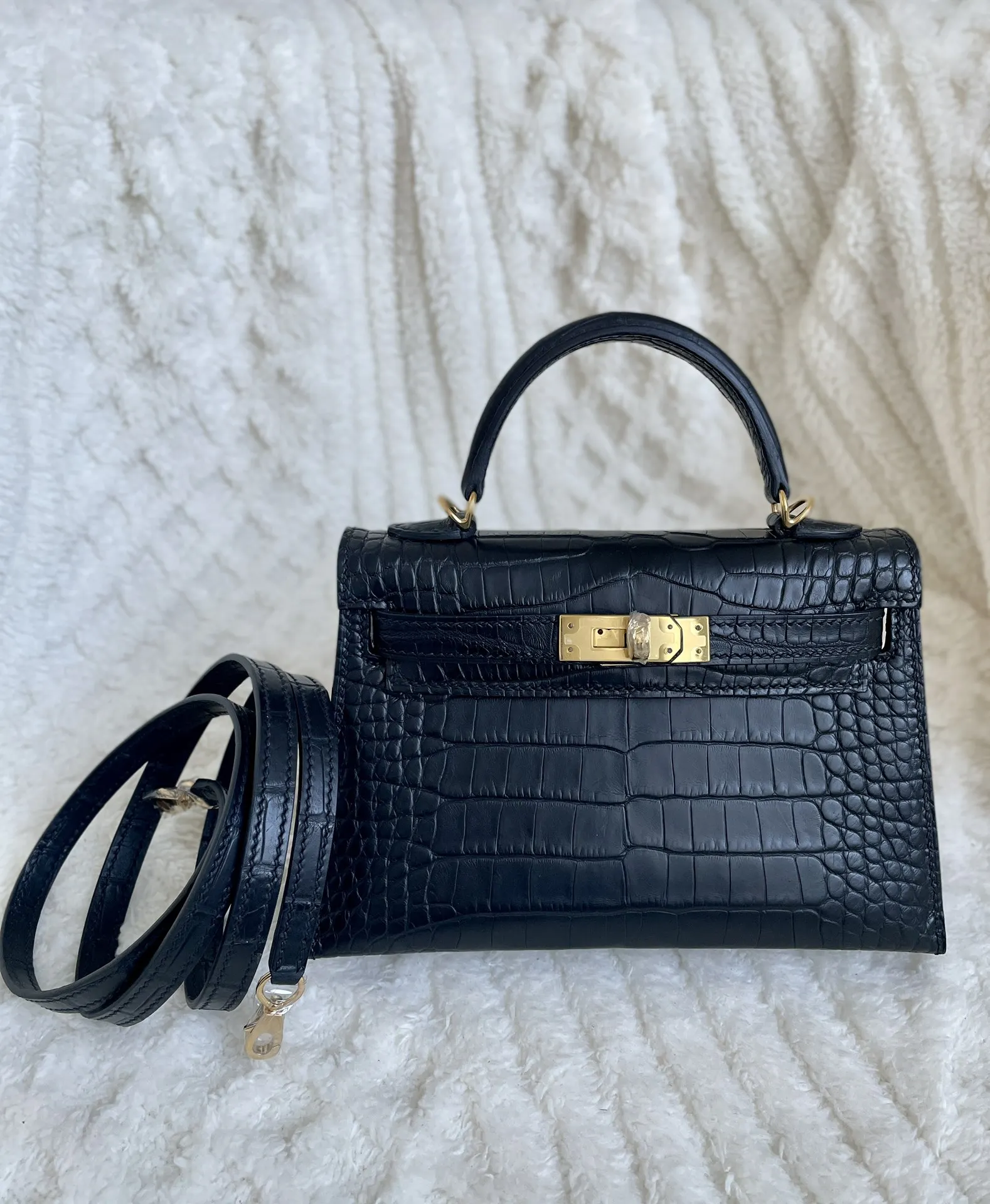 Kelly II 19cm Imported American Matte Alligator Leather, Black with Gold Hardware, W Stamp, Hand-stitched Waxed Thread, Matches Authentic American Alligator.