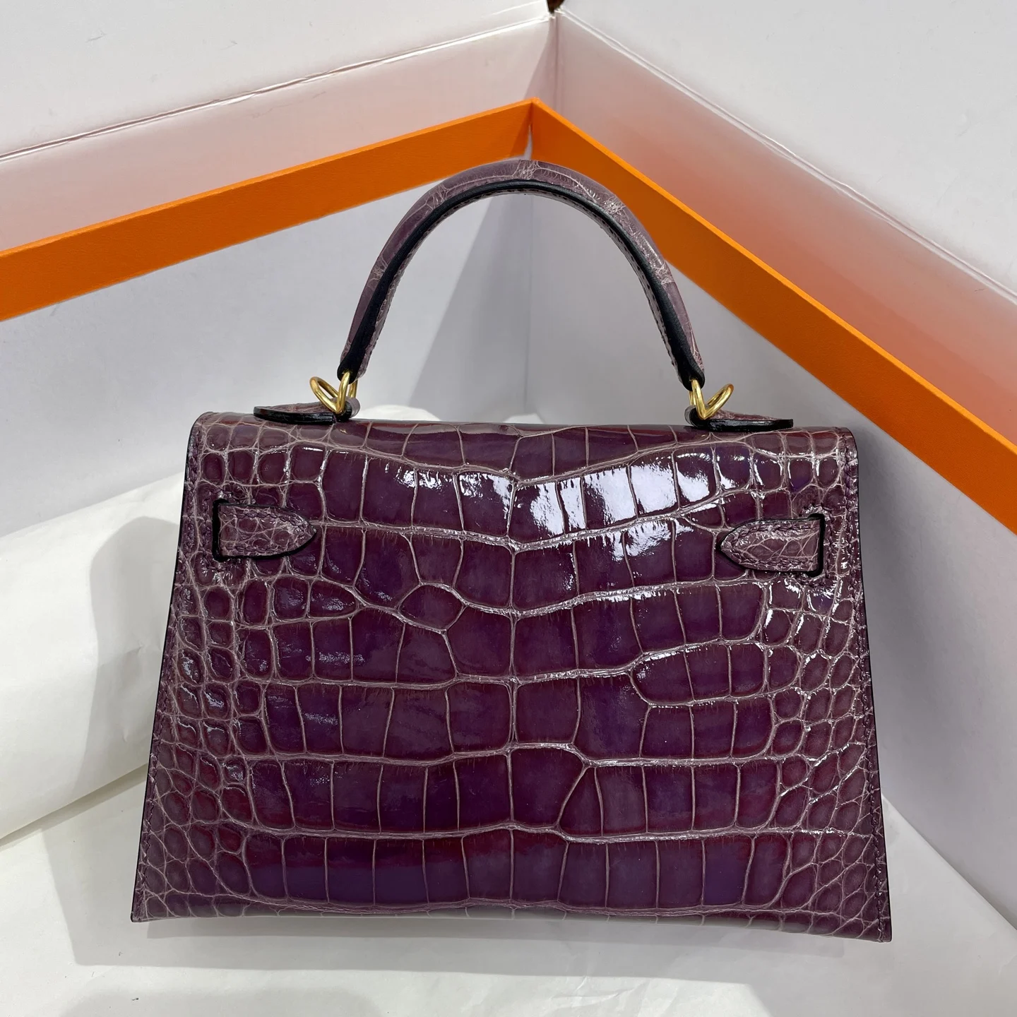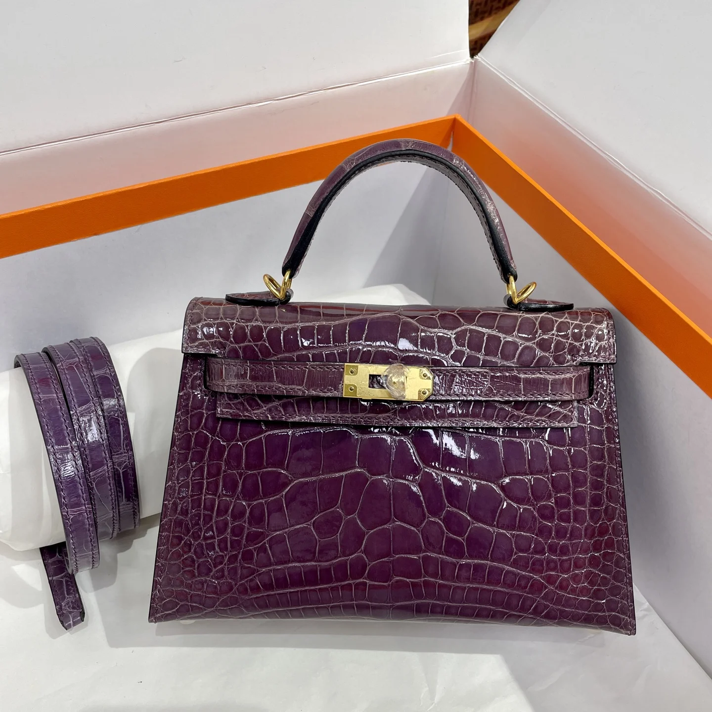 Authentic-quality Kelly II 19cm in imported glossy American alligator leather with gold hardware and hand-stitched waxed thread.