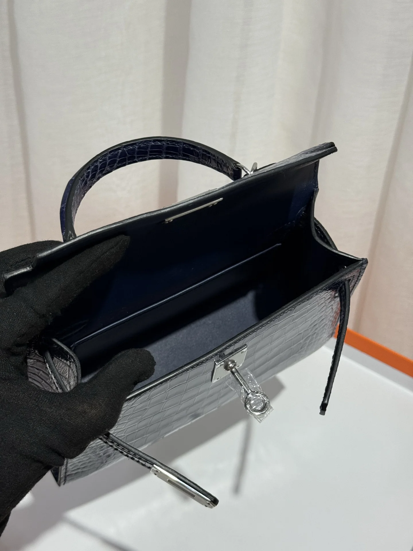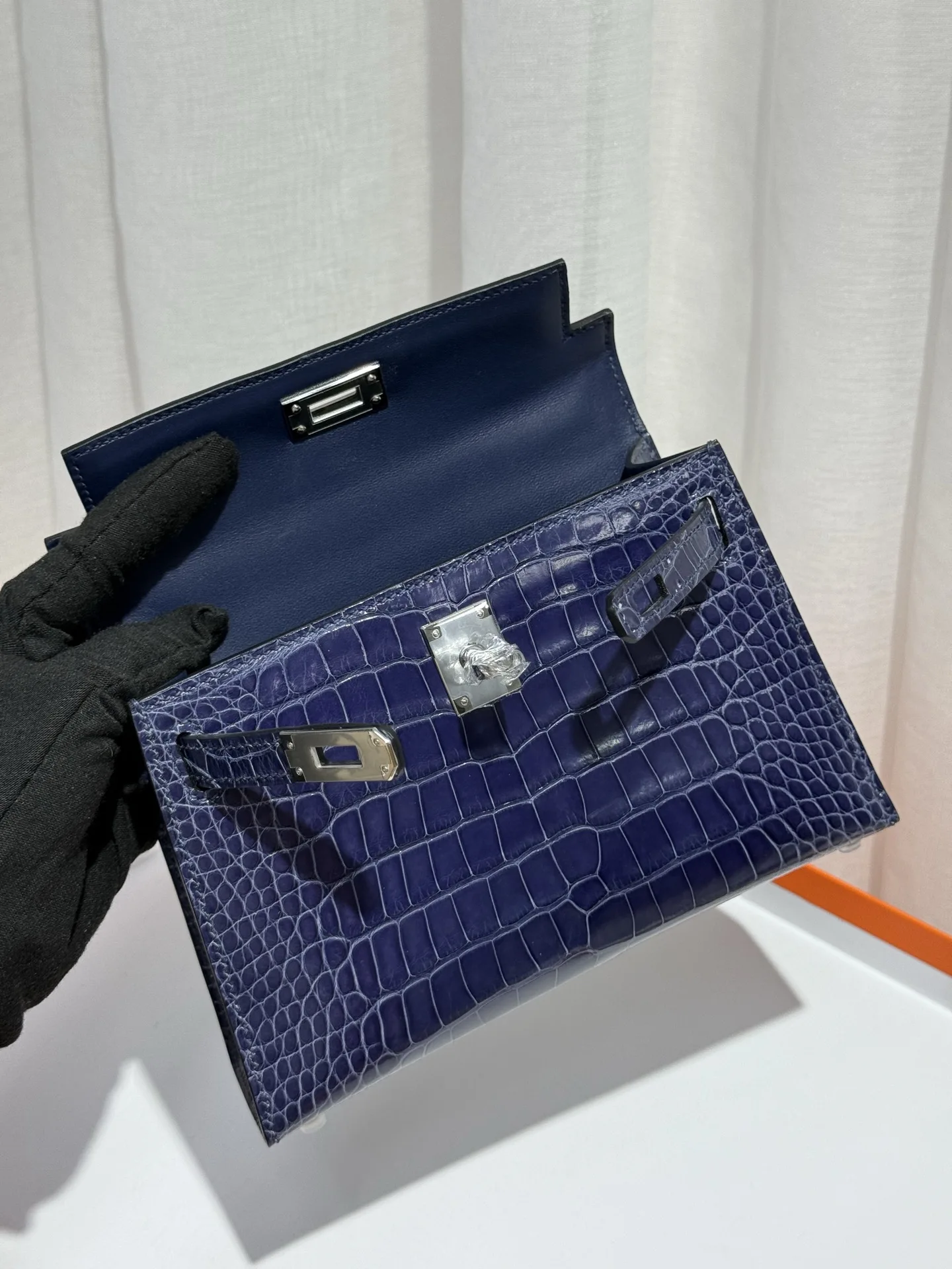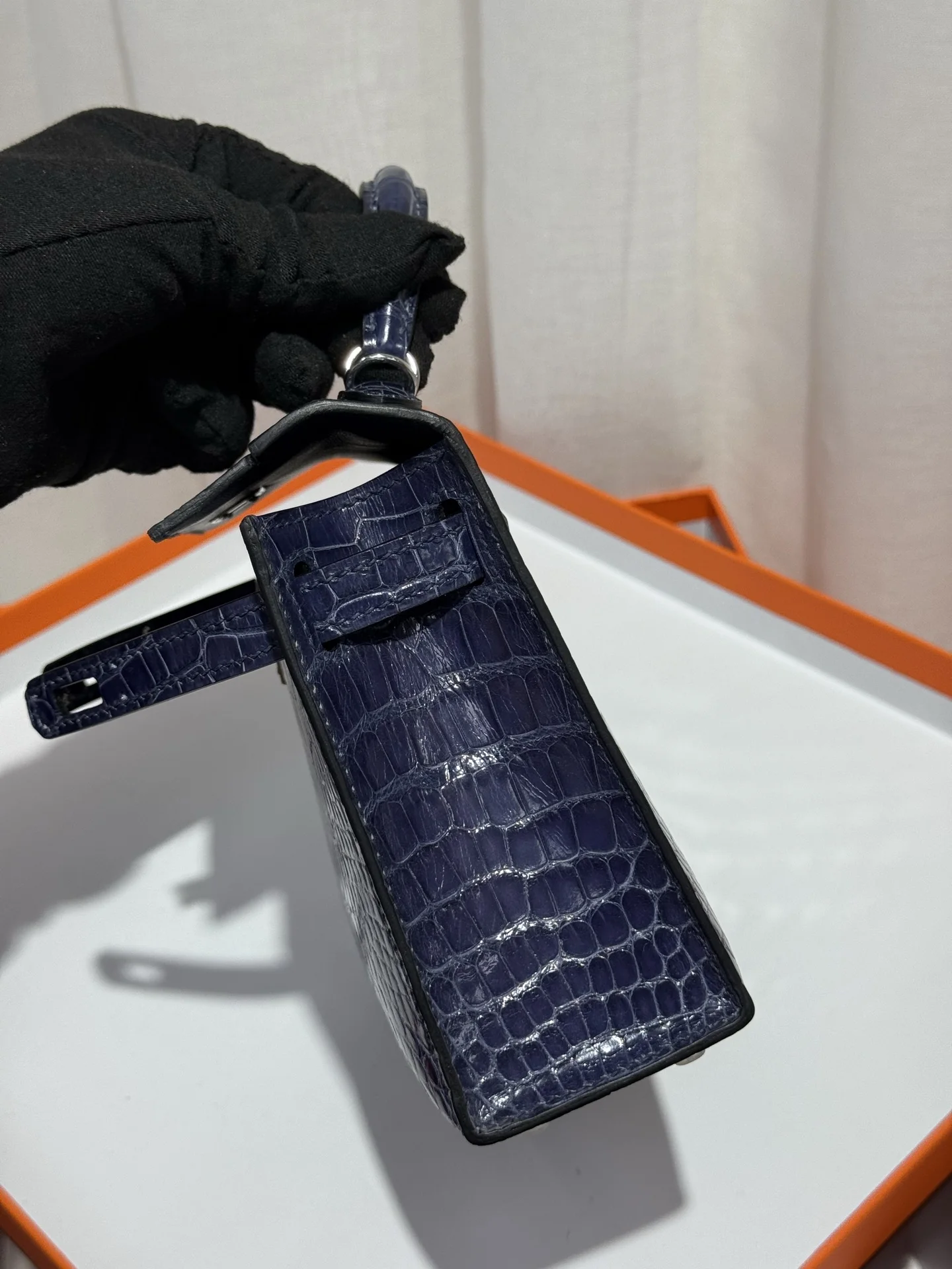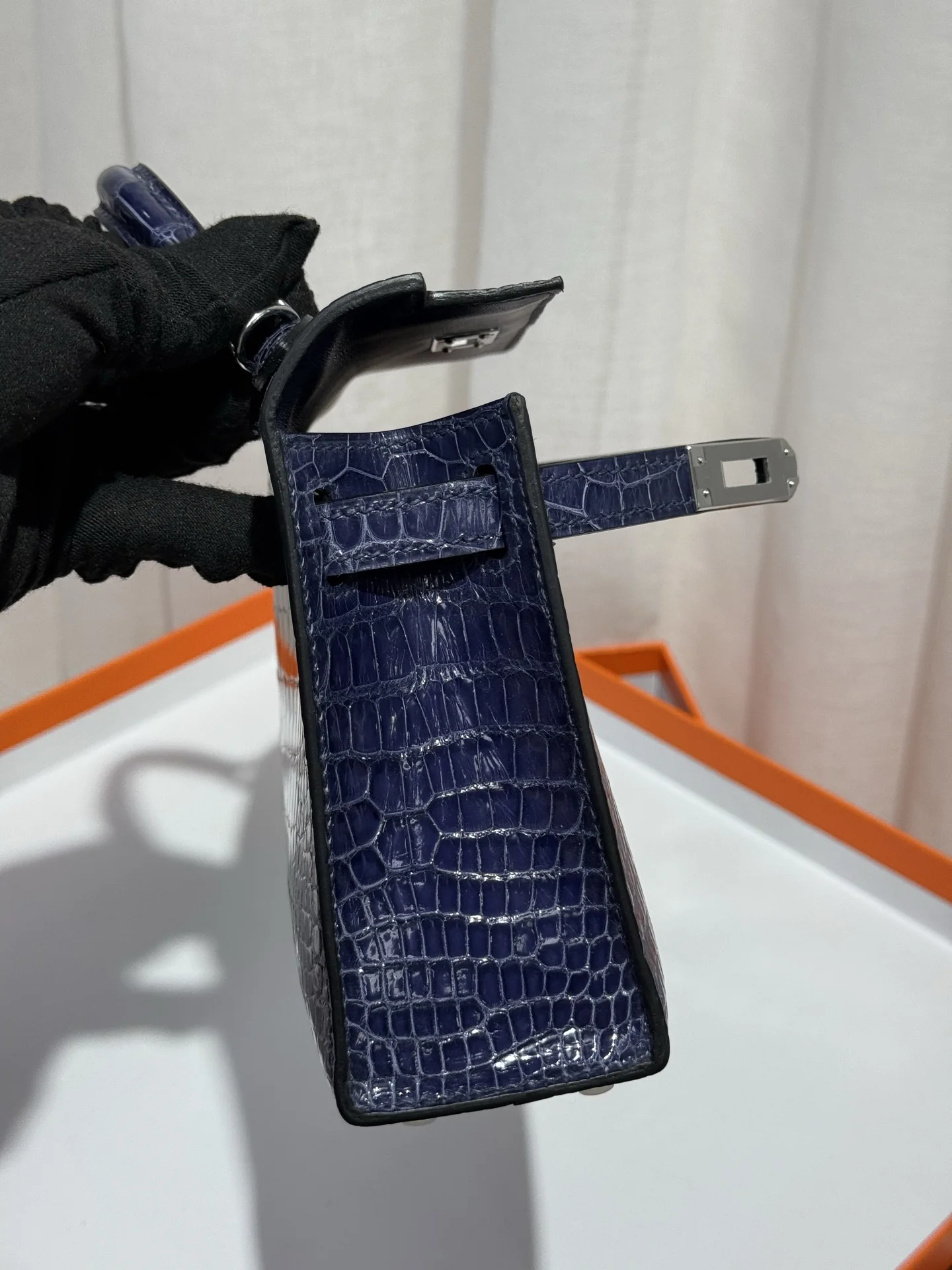 Authentic replica of the store s American alligator Kelly II 19cm, imported American glossy alligator leather, sapphire blue, full set of hand-hammered hardware, hand-sewn beeswax thread, in-stock real shot [color].