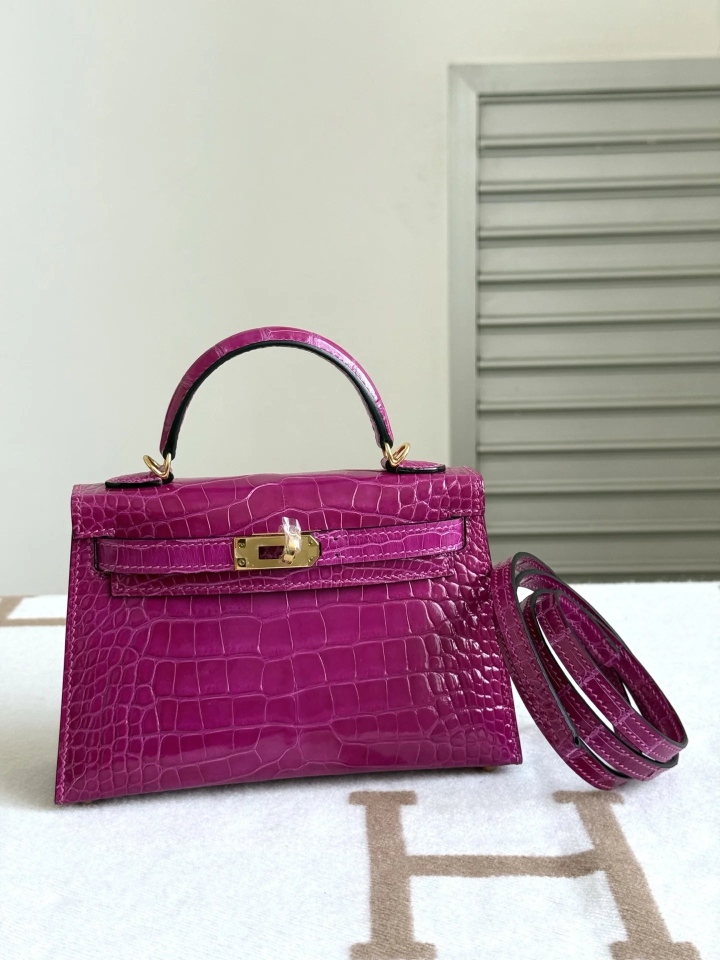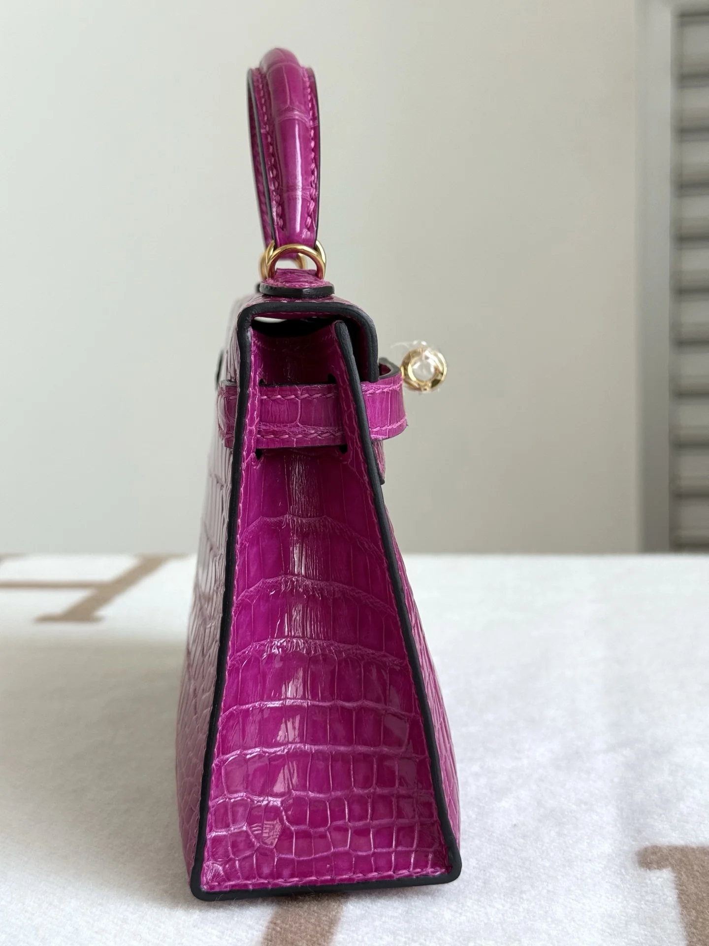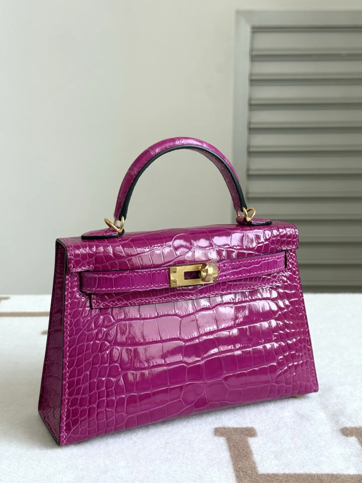 Authentic replica of the boutique s American alligator Kelly II 19cm bag, made with imported American glossy alligator leather, Arabian Nights purple, hand-hammered hardware, and h..
