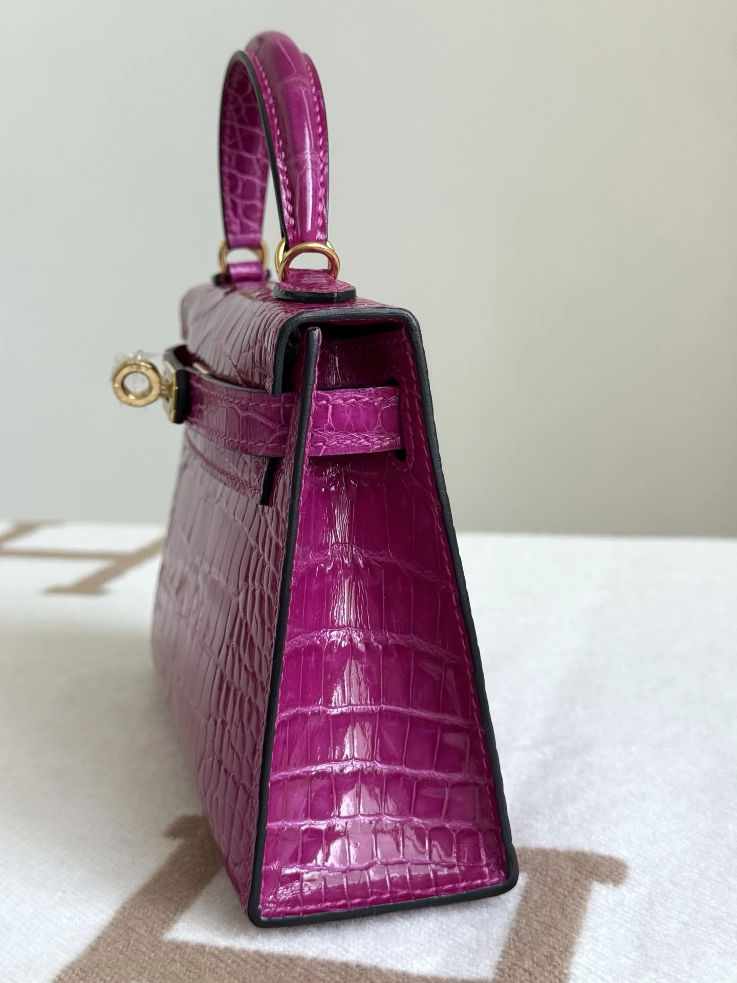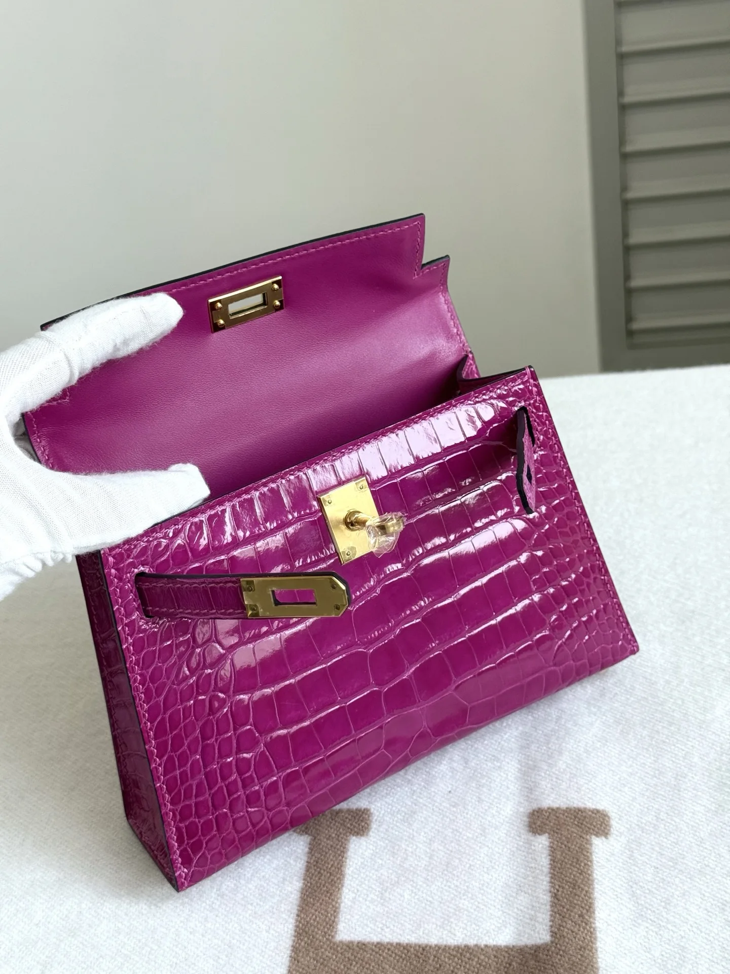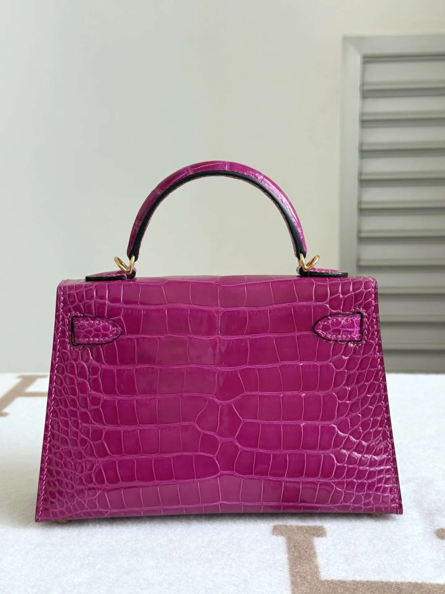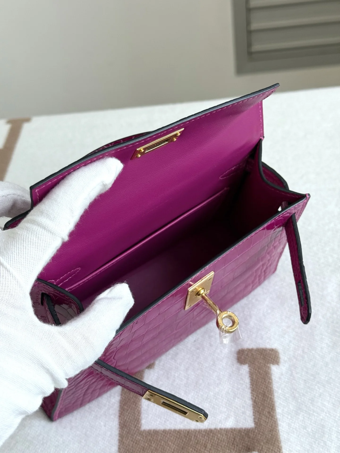 Authentic replica of the boutique s American alligator Kelly II 19cm bag, made with imported American glossy alligator leather, Arabian Nights purple, hand-hammered hardware, and h..