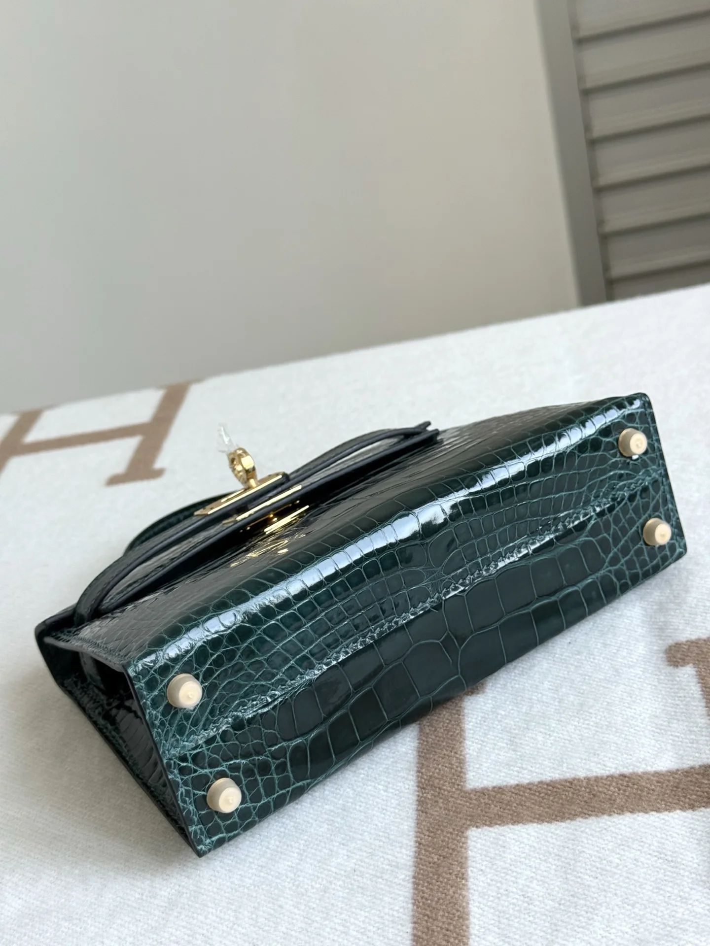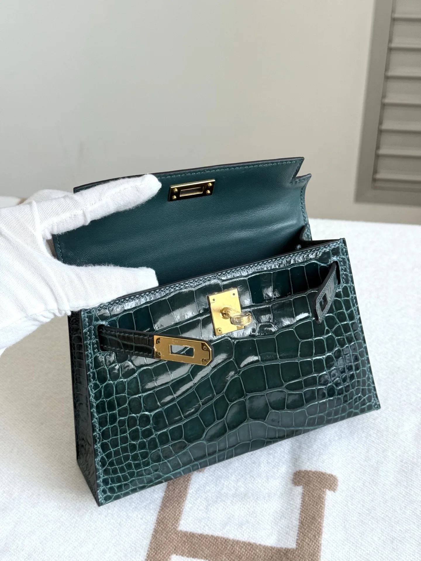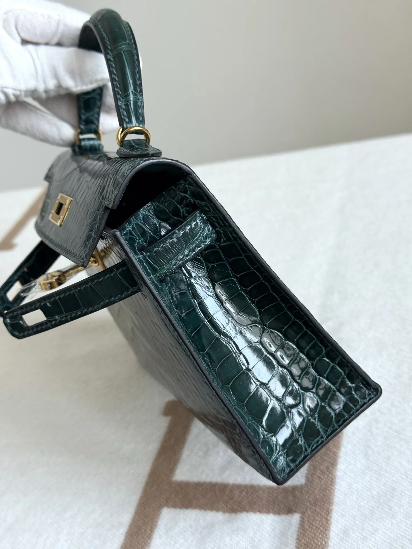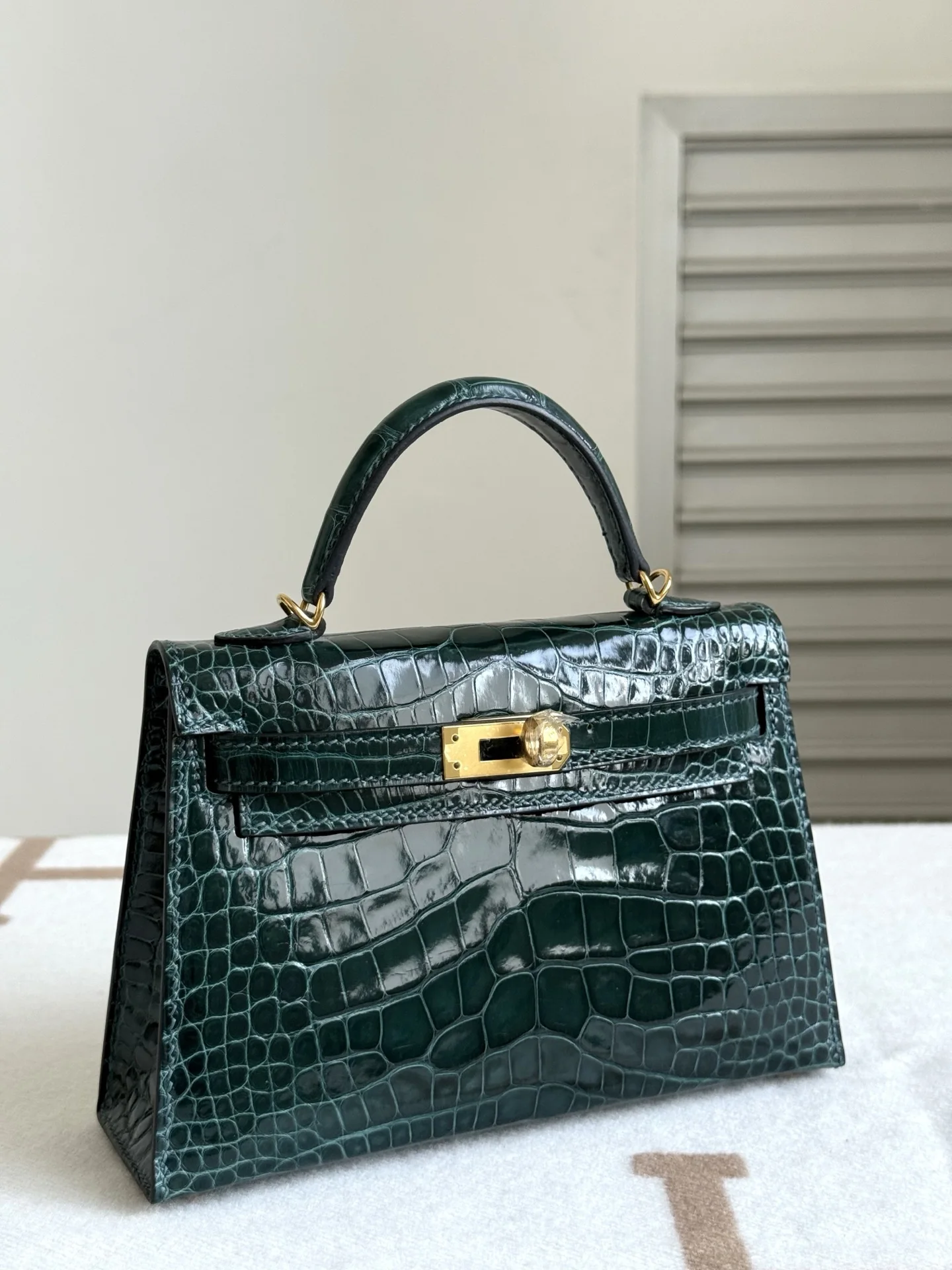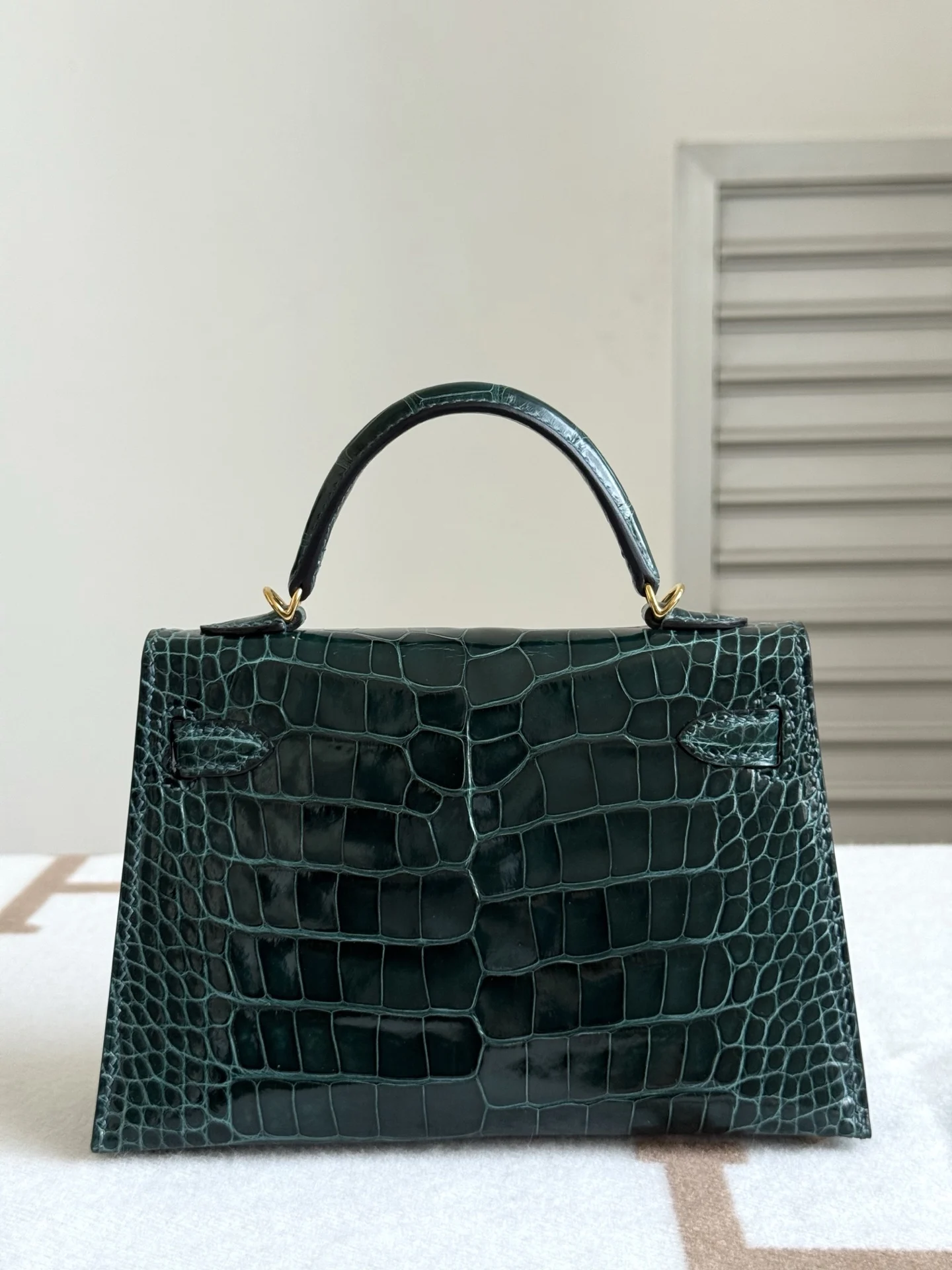 Authentic-grade, boutique-quality American Alligator Kelly II 19cm, original factory leather, H.C.P. polished square-scale American Alligator, hand-hammered hardware, Rousseau Green, hand-stitched beeswax thread.