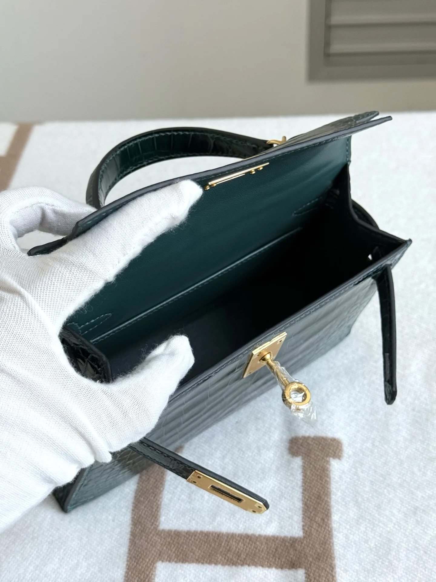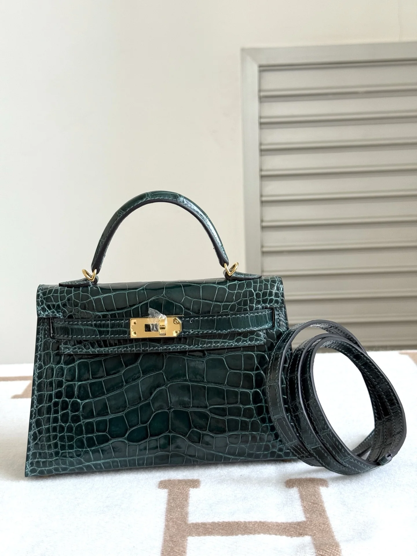 Authentic-grade, boutique-quality American Alligator Kelly II 19cm, original factory leather, H.C.P. polished square-scale American Alligator, hand-hammered hardware, Rousseau Gree..