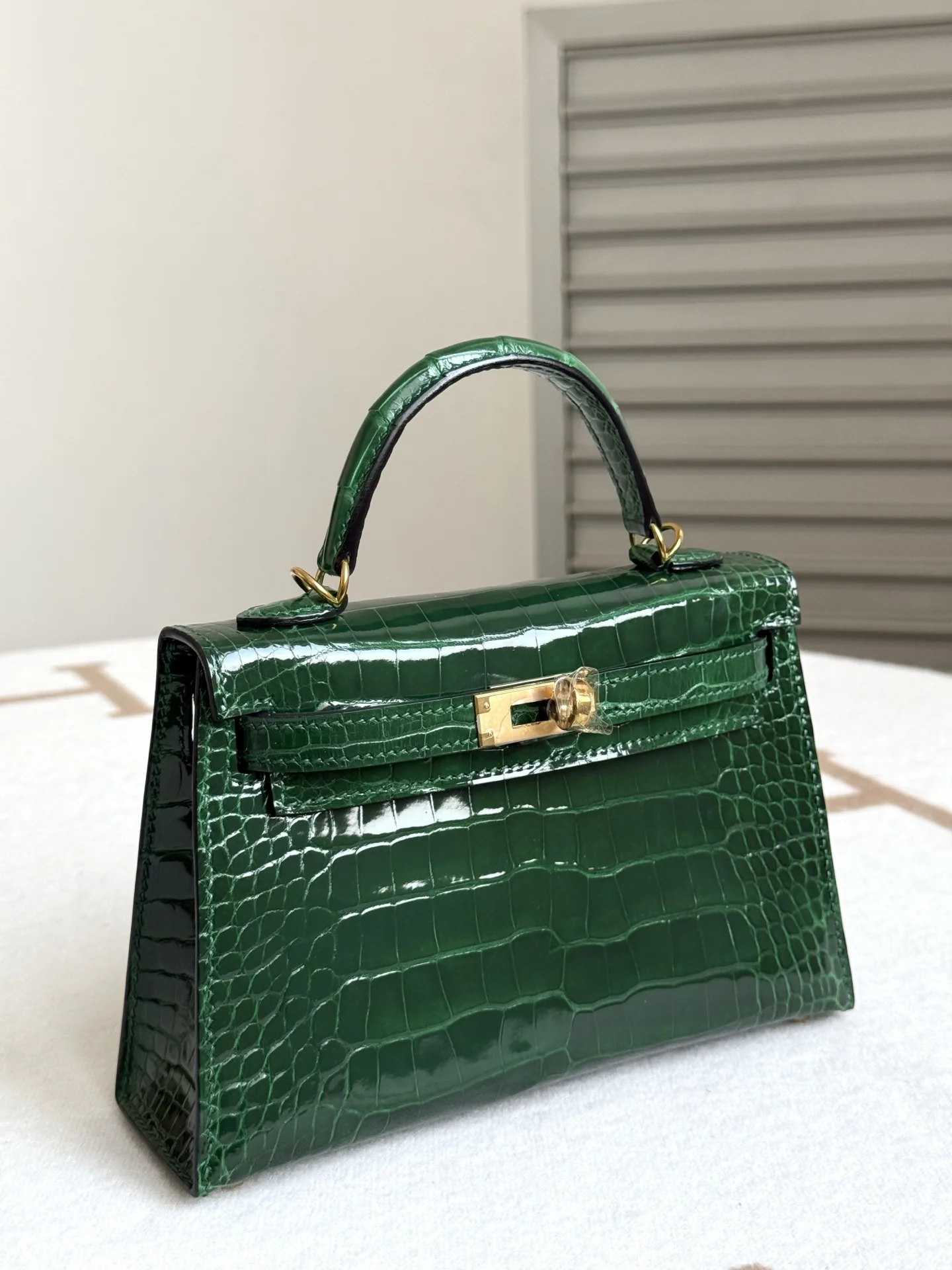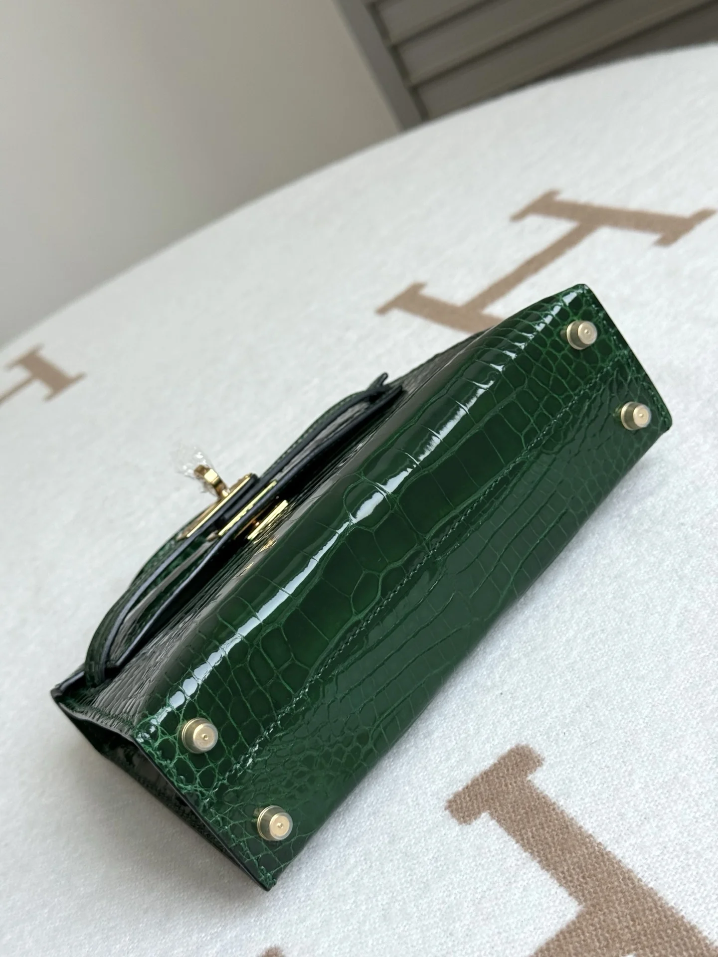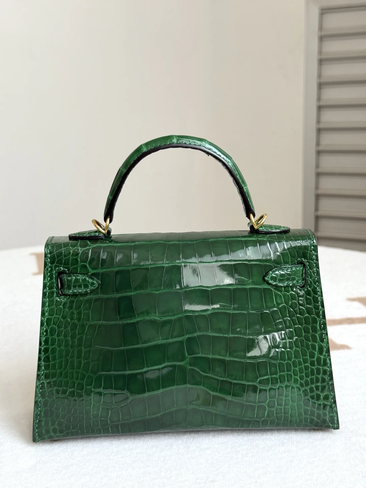Authentic-grade replica Kelly II 19cm in American Alligator, crafted with imported glossy square-scale American alligator leather, hand-hammered hardware, emerald green, and hand-stitched with beeswax thread.
