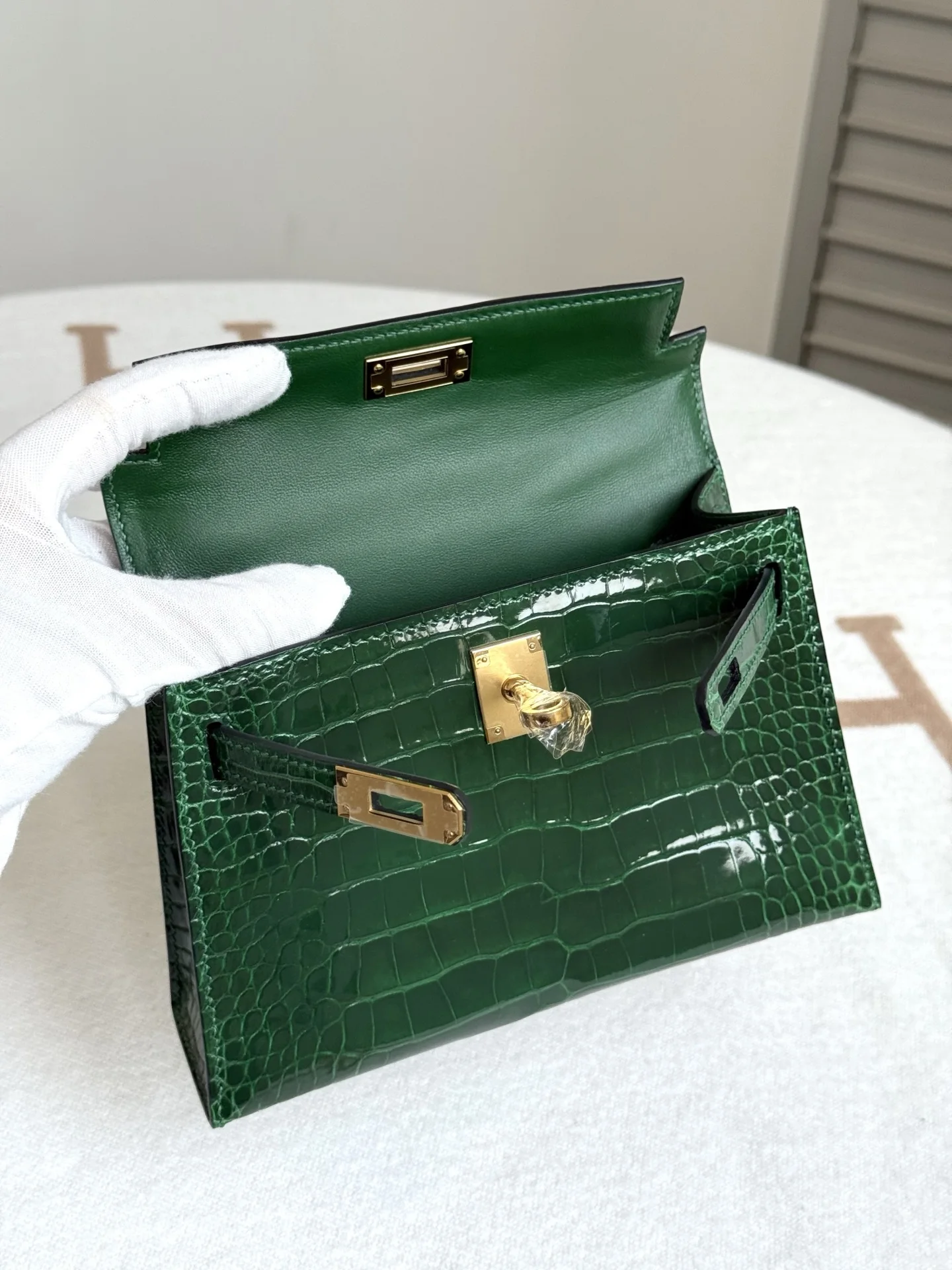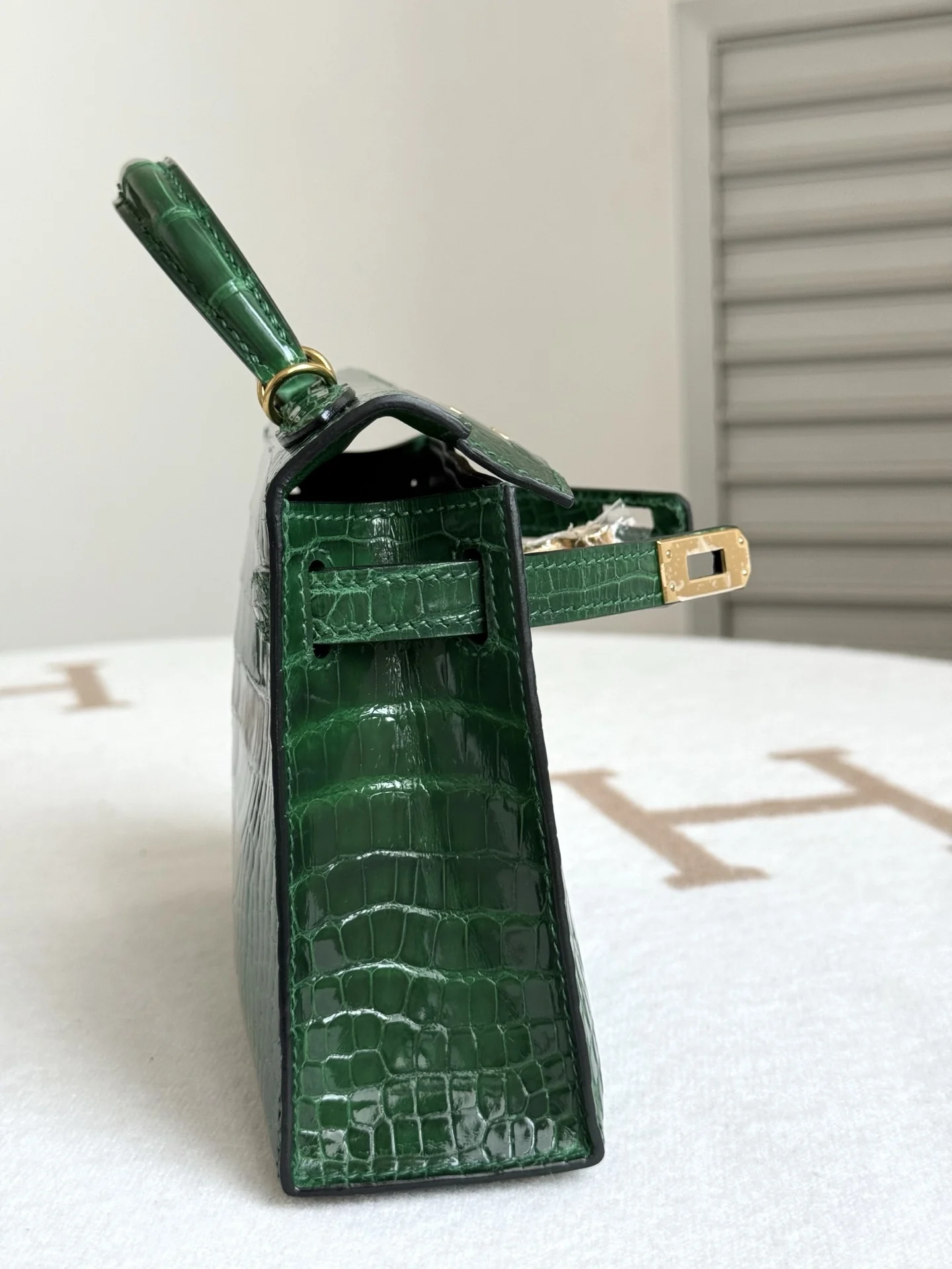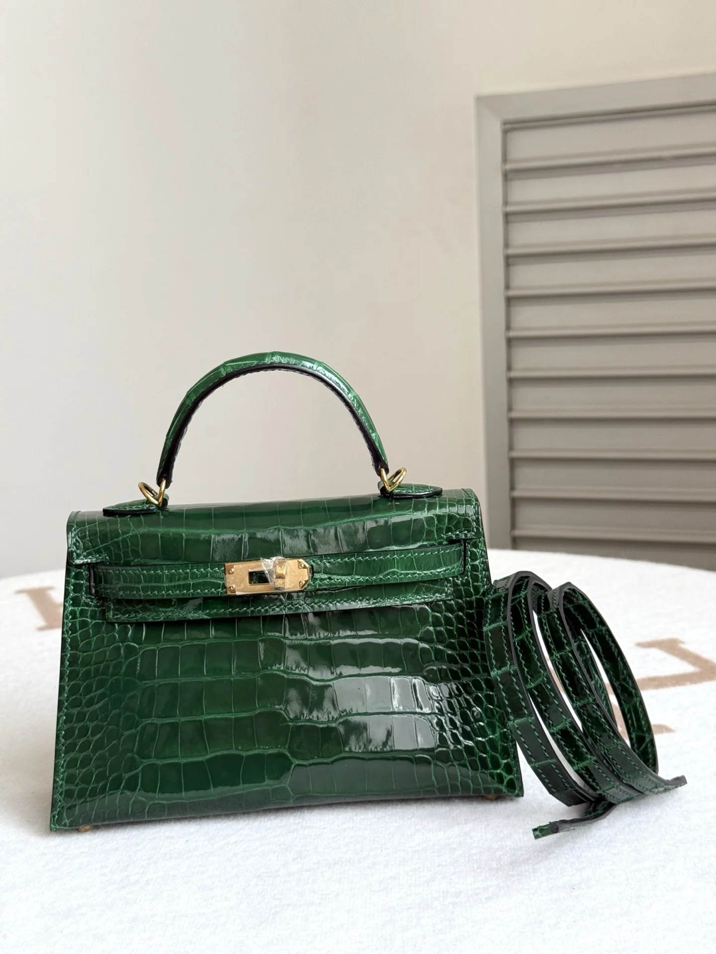 Authentic-grade replica Kelly II 19cm in American Alligator, crafted with imported glossy square-scale American alligator leather, hand-hammered hardware, emerald green, and hand-stitched with beeswax thread.